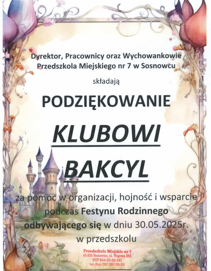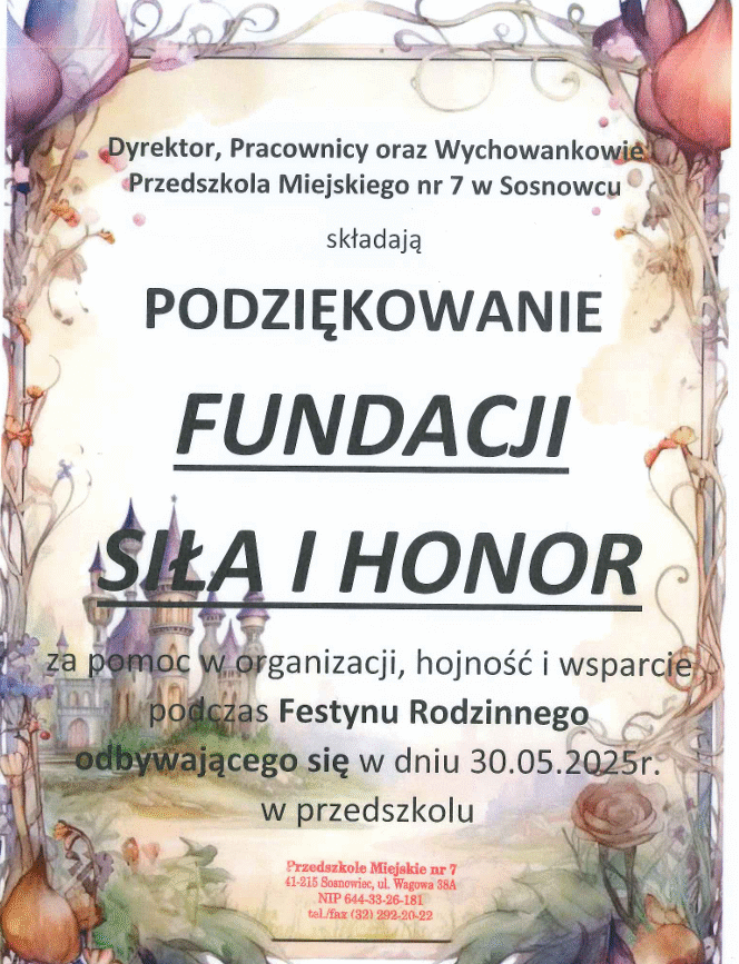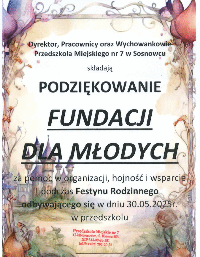 Specjalne podziękowania za nieocenioną pomoc w organizacji festynu kierujemy dla Klubu Bakcyl, Fundacji dla Młodych, Fundacji Siła i Honor oraz Spółdzielni Mieszkaniowej „Hutnik”.