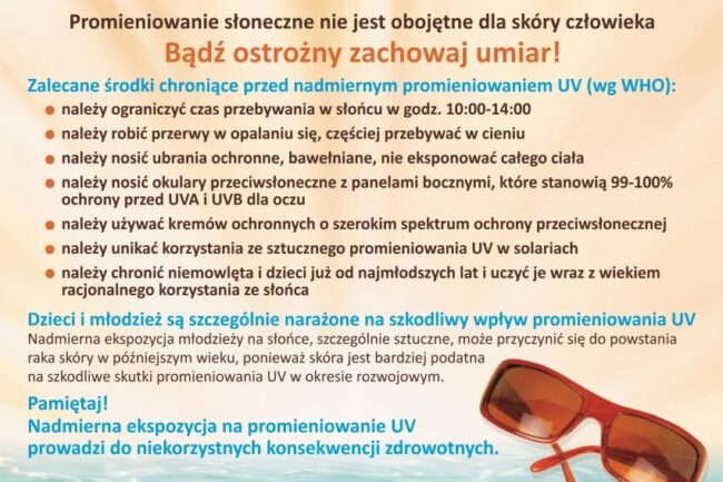 - przekazanie informacji o zdrowotnych konsekwencjach promieniowania UV poprzez działania informacyjno – edukacyjne skierowane do młodzieży, a także do rodziców oraz właścicieli solariów.