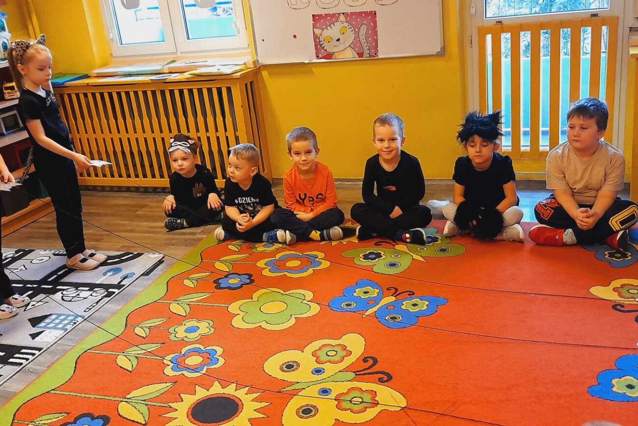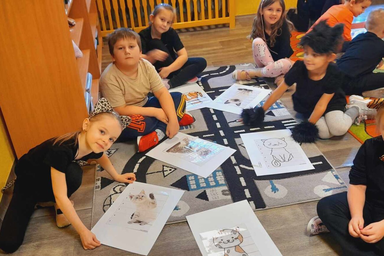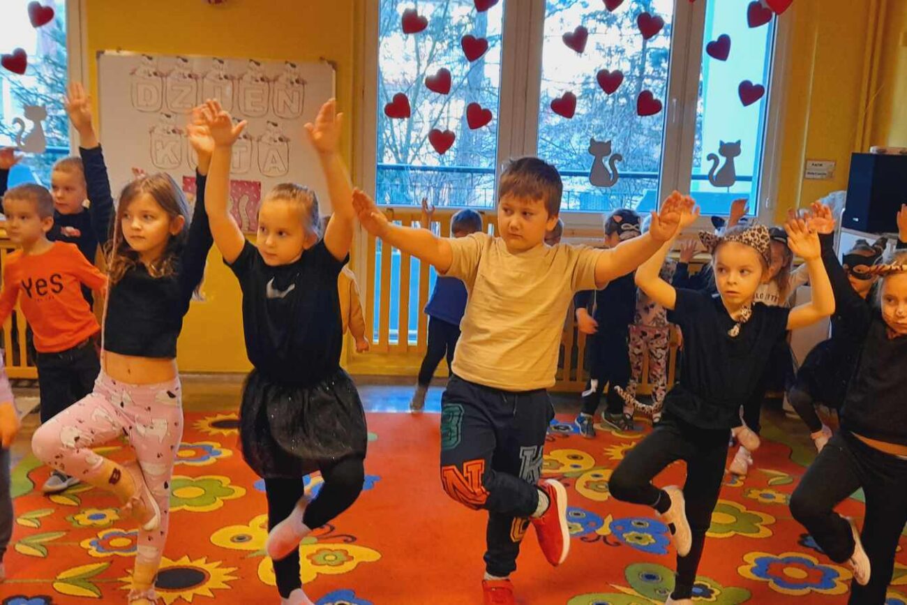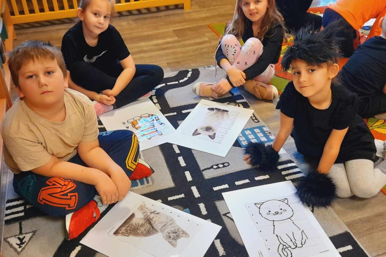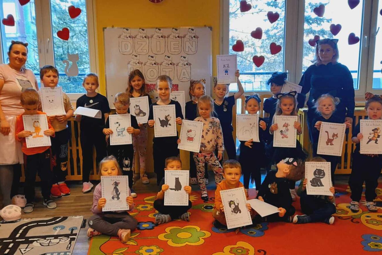 W tym dniu przedszkolaki upodobniły się do czworonożnych przyjaciół, których wygląd zdobiły: długie wąsy, opaski z uszami, kocie ogony. Dzieci rozmawiały o sposobie życia, pielęgnacji, odżywiania kotów domowych. Określały przeznaczenie kocich akcesoriów. Oglądały zdjęcia różnych ras kotów domowych i dzikich – zaznajamiając się z ich nazwami. Uczestniczyły w wesołych „kocich zabawach”, tj. kociej gimnastyce, kocich tańcach oraz konkurencjach: nawijanie wełny, picie mleka. Układały puzzle obrazkowe, rozwiązywały zagadki o kotach z bajek, poznały paluszkową zabawę oraz wykonały pracę plastyczną „Kot w kropki” .