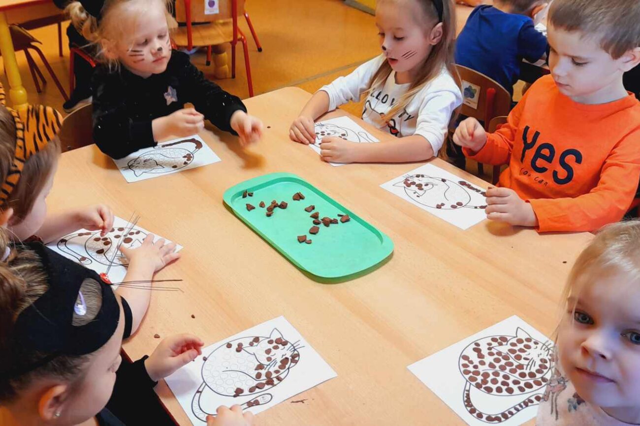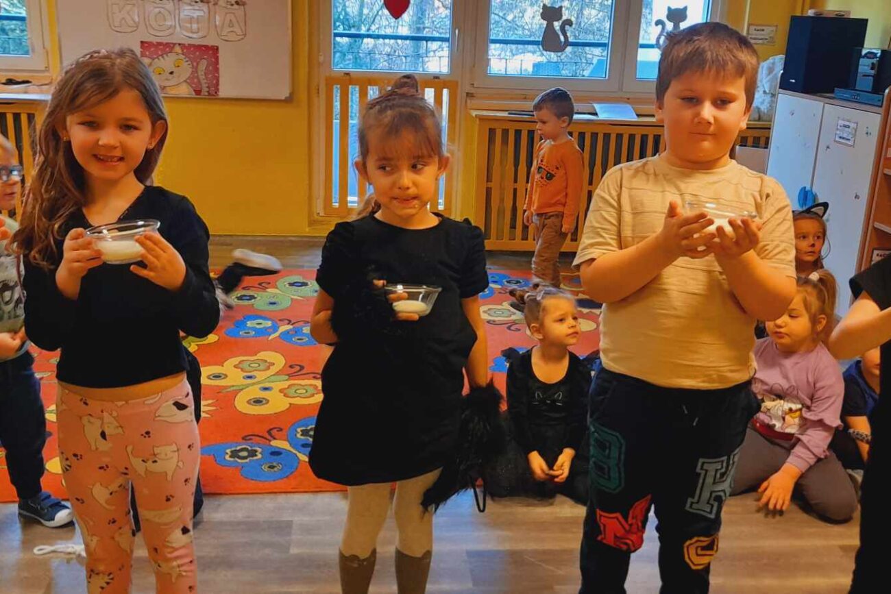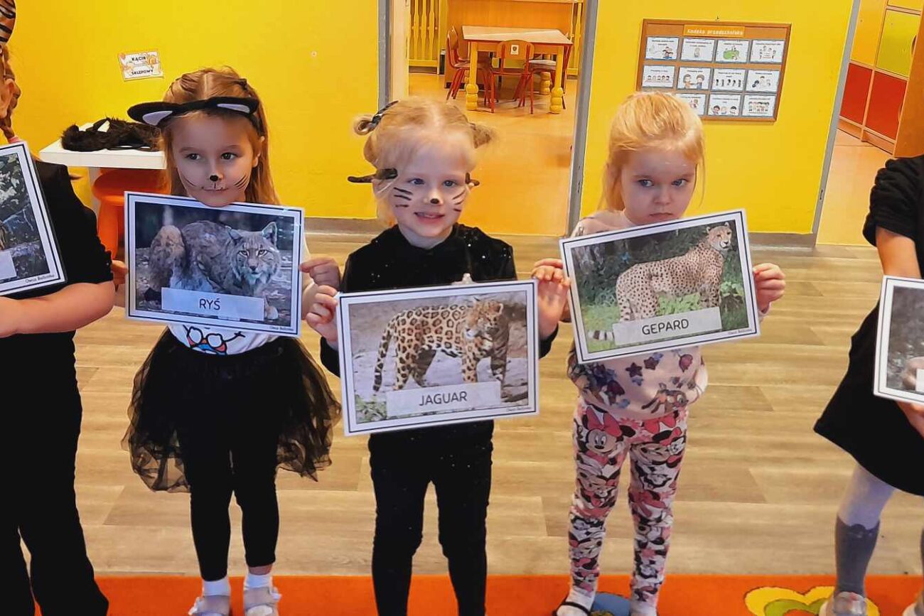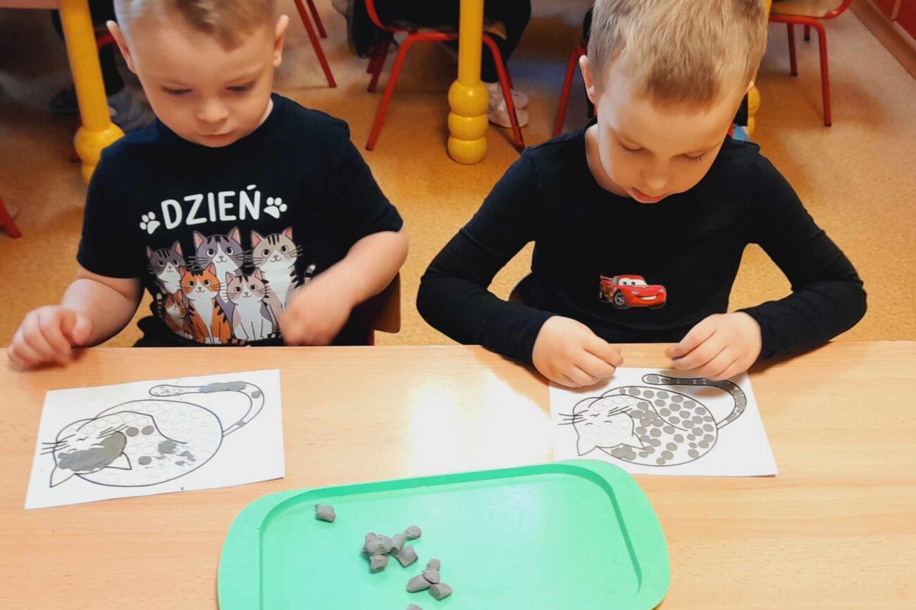 W tym dniu przedszkolaki upodobniły się do czworonożnych przyjaciół, których wygląd zdobiły: długie wąsy, opaski z uszami, kocie ogony. Dzieci rozmawiały o sposobie życia, pielęgnacji, odżywiania kotów domowych. Określały przeznaczenie kocich akcesoriów. Oglądały zdjęcia różnych ras kotów domowych i dzikich – zaznajamiając się z ich nazwami. Uczestniczyły w wesołych „kocich zabawach”, tj. kociej gimnastyce, kocich tańcach oraz konkurencjach: nawijanie wełny, picie mleka. Układały puzzle obrazkowe, rozwiązywały zagadki o kotach z bajek, poznały paluszkową zabawę oraz wykonały pracę plastyczną „Kot w kropki” .