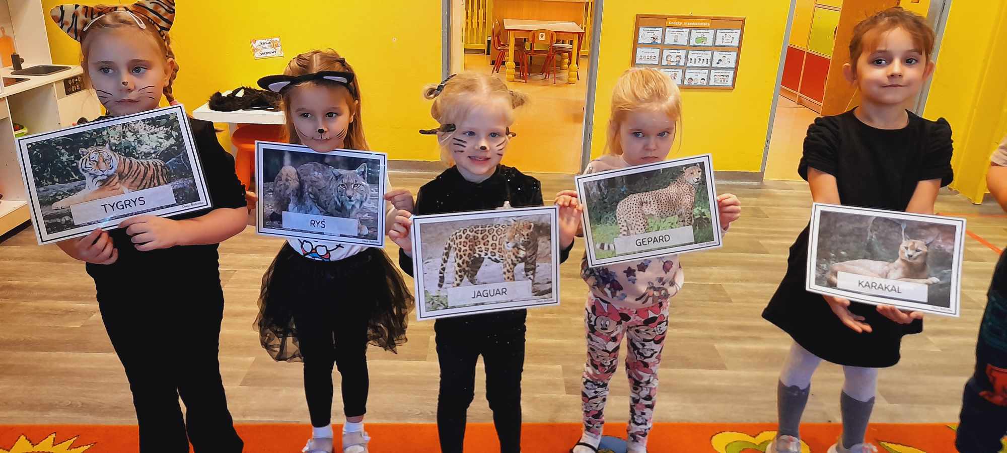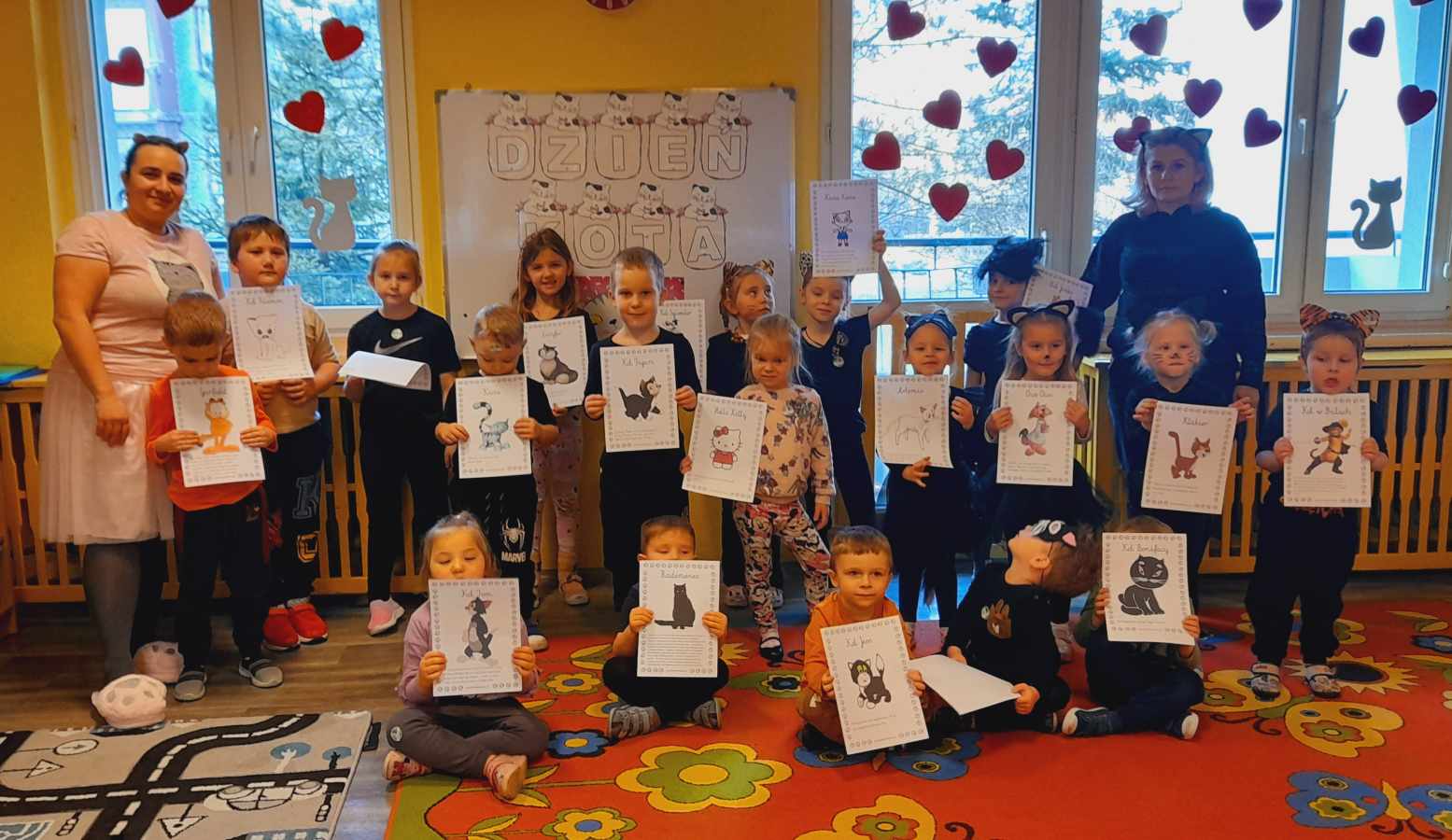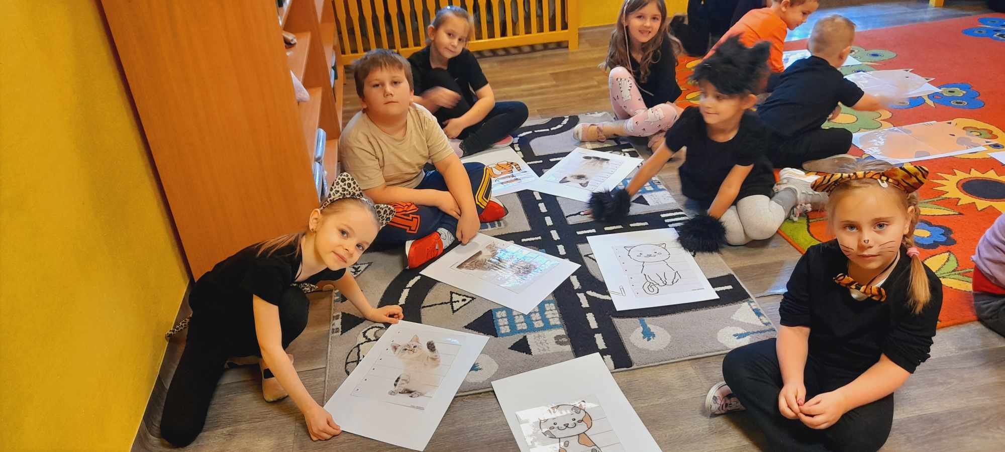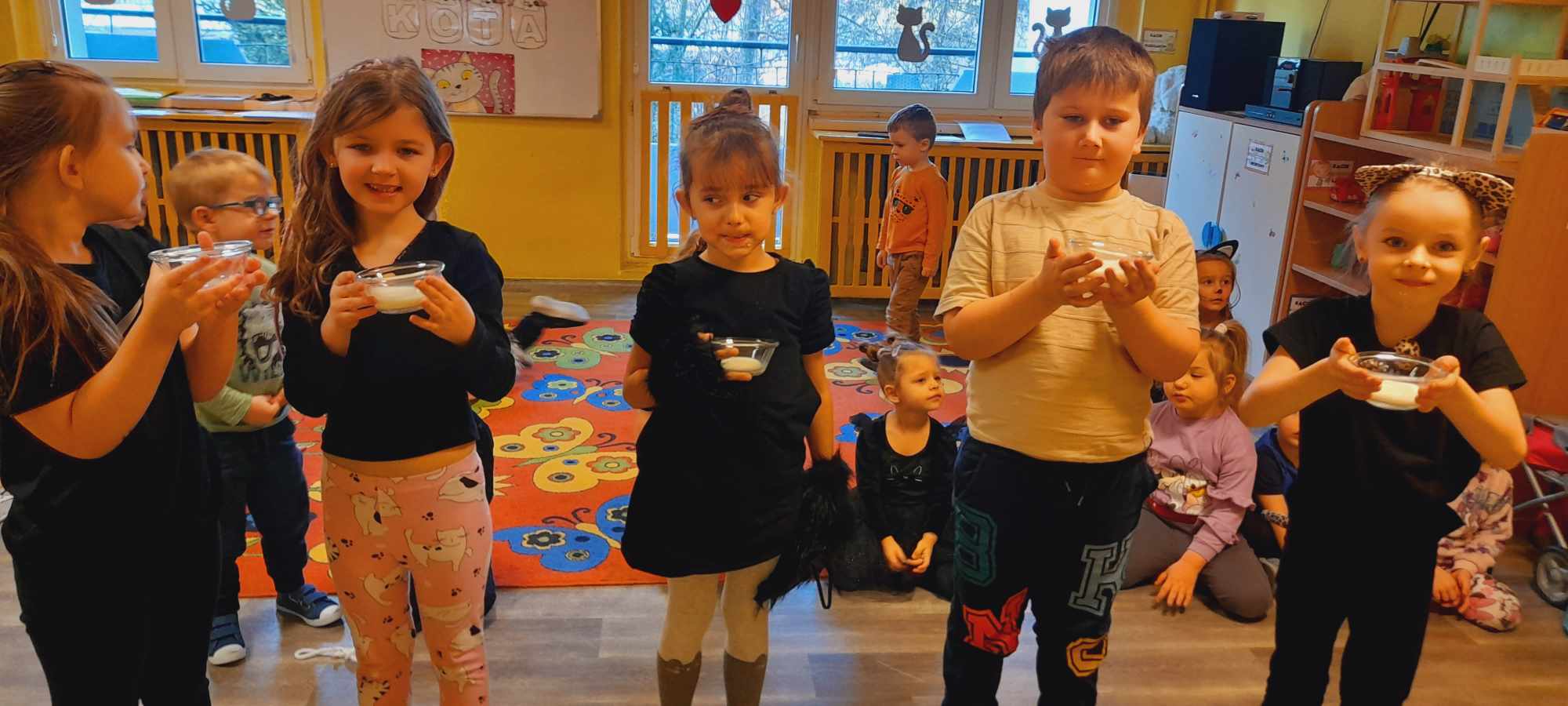 W tym dniu przedszkolaki upodobniły się do czworonożnych przyjaciół, których wygląd zdobiły: długie wąsy, opaski z uszami, kocie ogony. Dzieci rozmawiały o sposobie życia, pielęgnacji, odżywiania kotów domowych. Określały przeznaczenie kocich akcesoriów. Oglądały zdjęcia różnych ras kotów domowych i dzikich – zaznajamiając się z ich nazwami. Uczestniczyły w wesołych „kocich zabawach”, tj. kociej gimnastyce, kocich tańcach oraz konkurencjach: nawijanie wełny, picie mleka. Układały puzzle obrazkowe, rozwiązywały zagadki o kotach z bajek, poznały paluszkową zabawę oraz wykonały pracę plastyczną „Kot w kropki” .