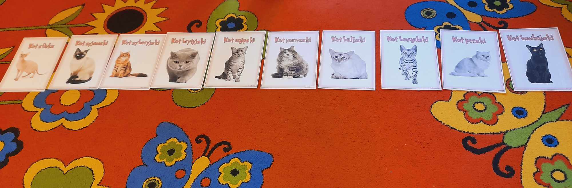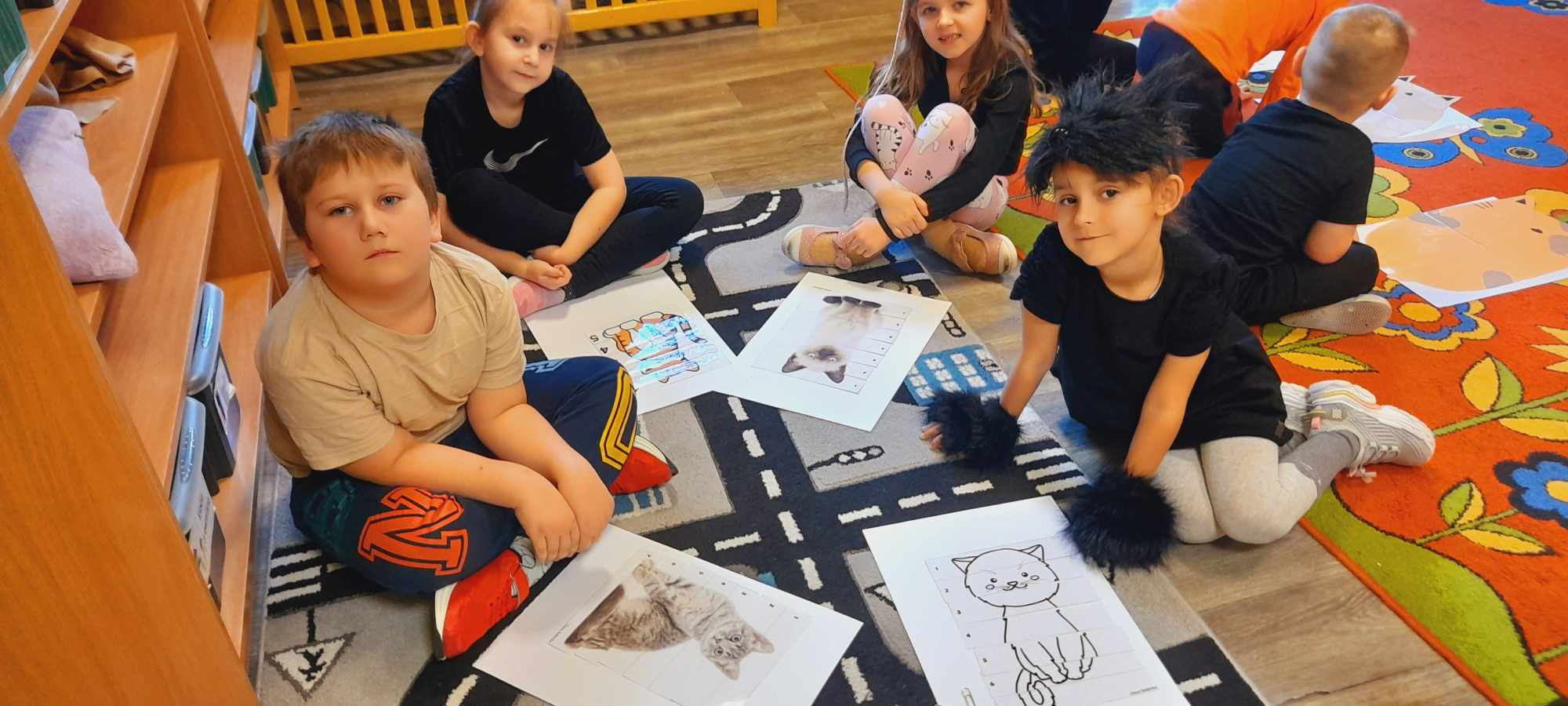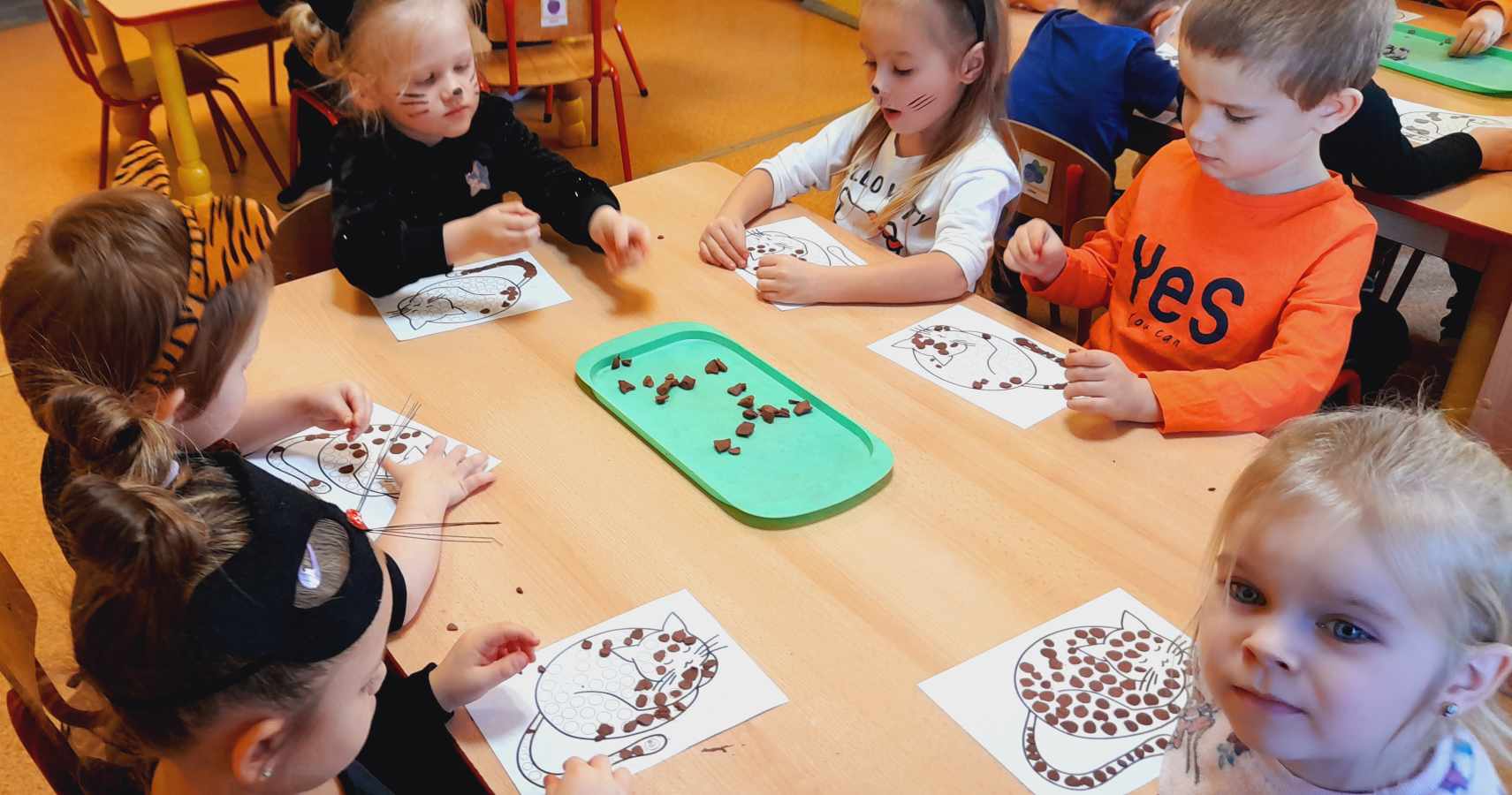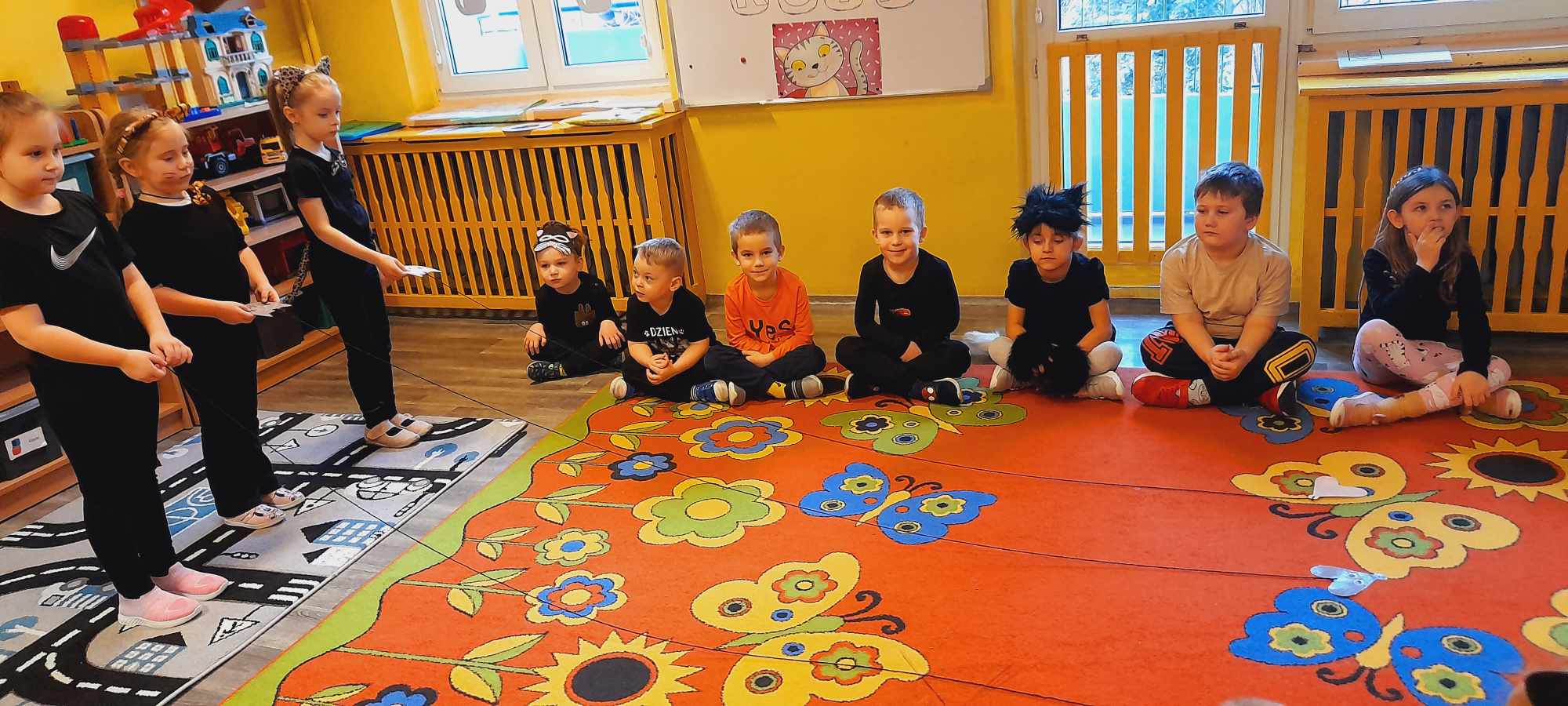 W tym dniu przedszkolaki upodobniły się do czworonożnych przyjaciół, których wygląd zdobiły: długie wąsy, opaski z uszami, kocie ogony. Dzieci rozmawiały o sposobie życia, pielęgnacji, odżywiania kotów domowych. Określały przeznaczenie kocich akcesoriów. Oglądały zdjęcia różnych ras kotów domowych i dzikich – zaznajamiając się z ich nazwami. Uczestniczyły w wesołych „kocich zabawach”, tj. kociej gimnastyce, kocich tańcach oraz konkurencjach: nawijanie wełny, picie mleka. Układały puzzle obrazkowe, rozwiązywały zagadki o kotach z bajek, poznały paluszkową zabawę oraz wykonały pracę plastyczną „Kot w kropki” .