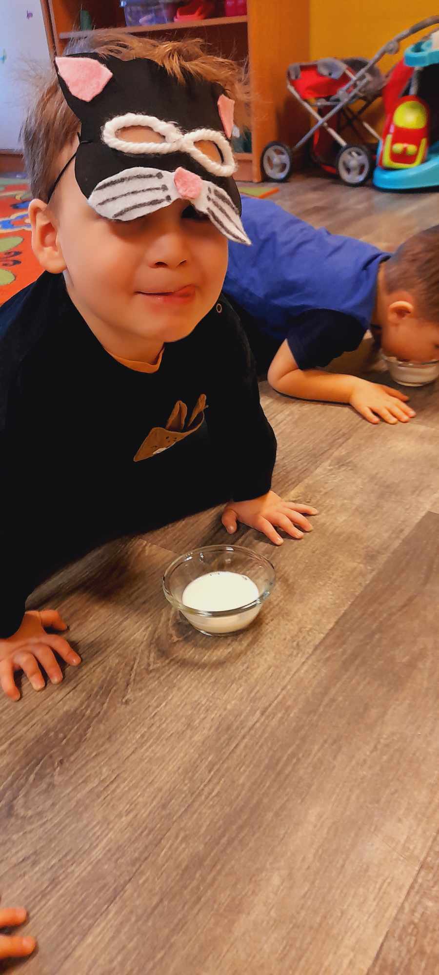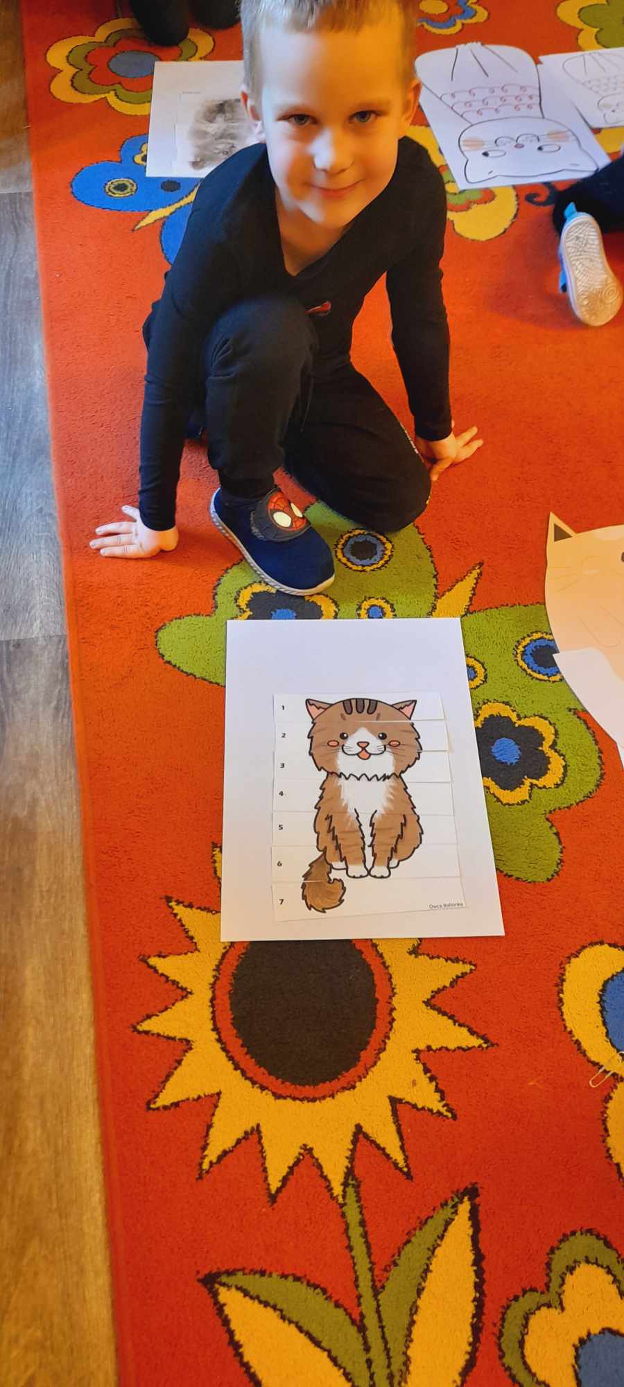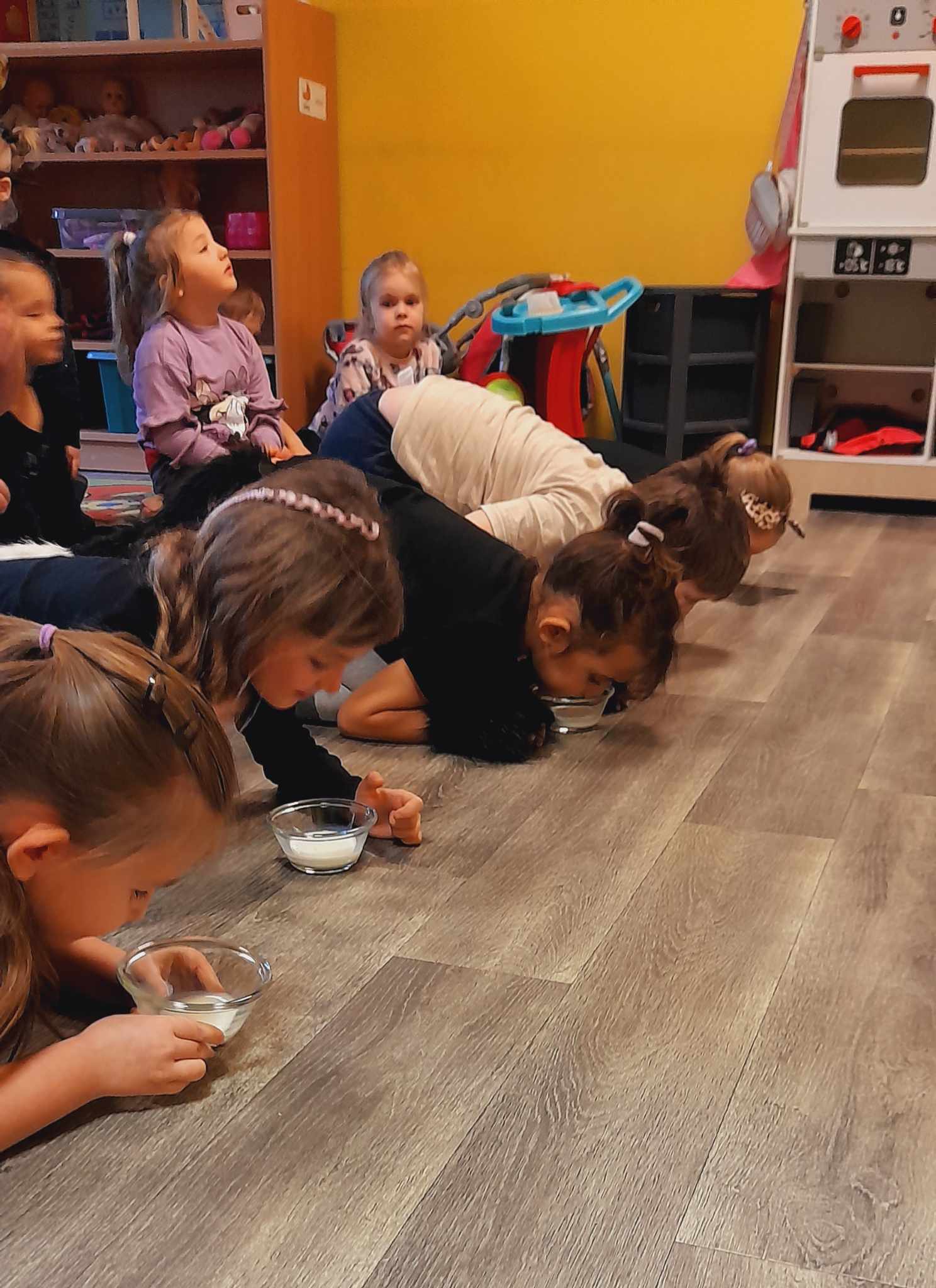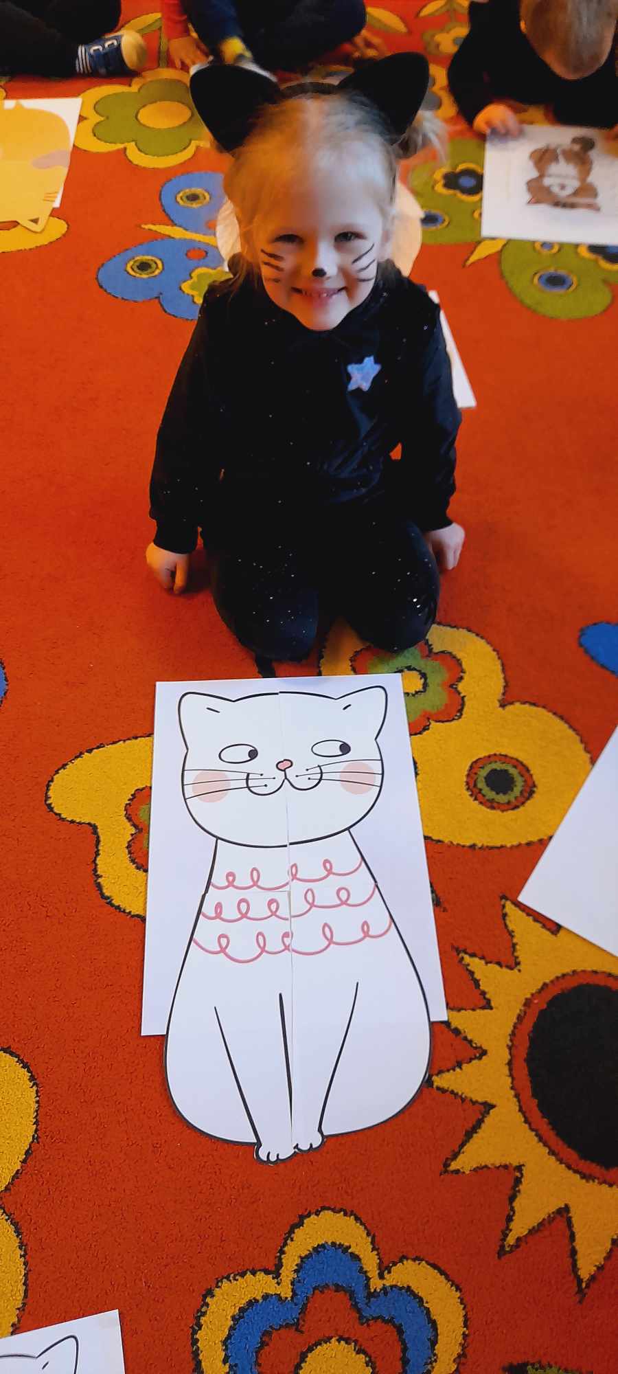 W tym dniu przedszkolaki upodobniły się do czworonożnych przyjaciół, których wygląd zdobiły: długie wąsy, opaski z uszami, kocie ogony. Dzieci rozmawiały o sposobie życia, pielęgnacji, odżywiania kotów domowych. Określały przeznaczenie kocich akcesoriów. Oglądały zdjęcia różnych ras kotów domowych i dzikich – zaznajamiając się z ich nazwami. Uczestniczyły w wesołych „kocich zabawach”, tj. kociej gimnastyce, kocich tańcach oraz konkurencjach: nawijanie wełny, picie mleka. Układały puzzle obrazkowe, rozwiązywały zagadki o kotach z bajek, poznały paluszkową zabawę oraz wykonały pracę plastyczną „Kot w kropki” .