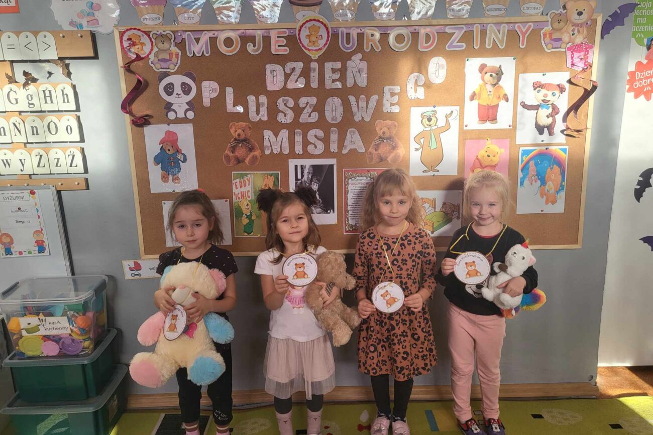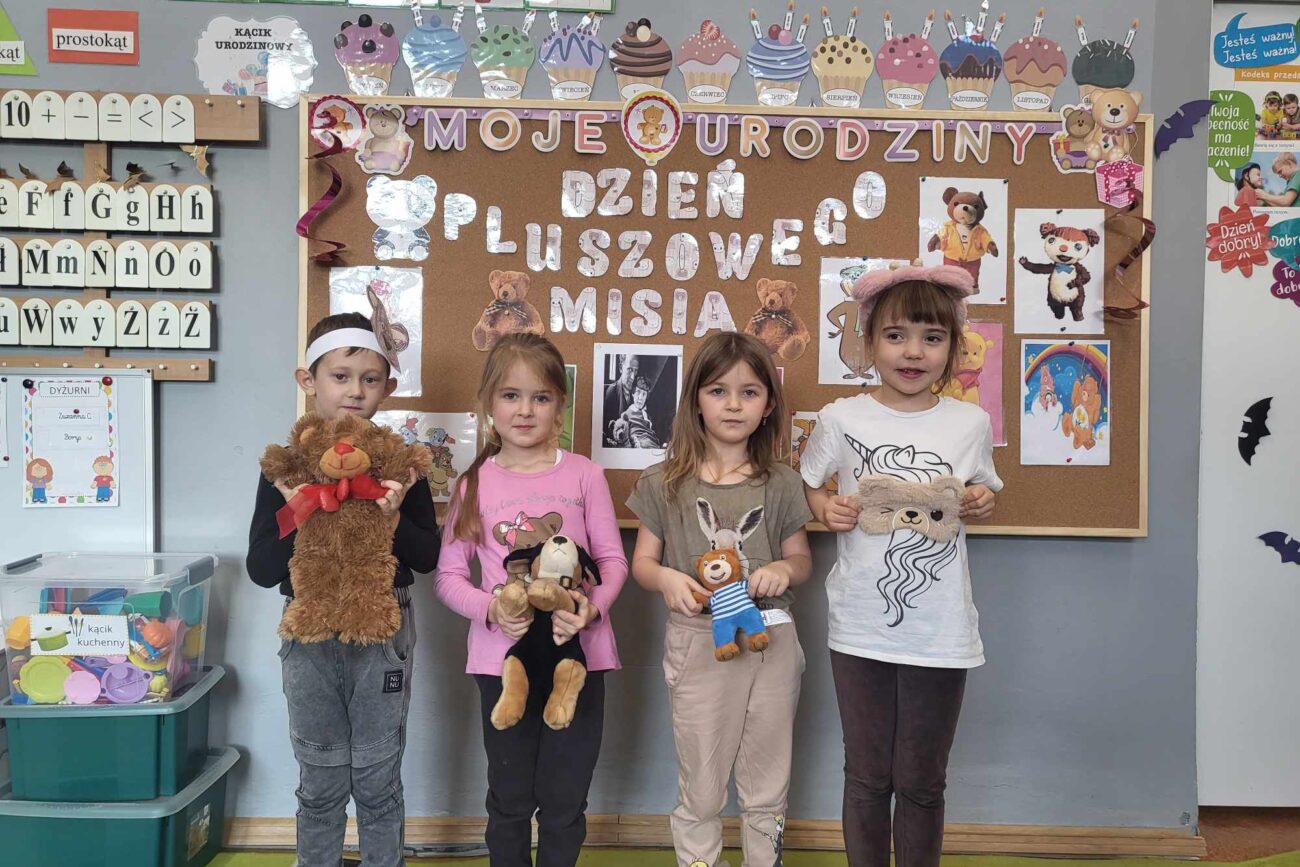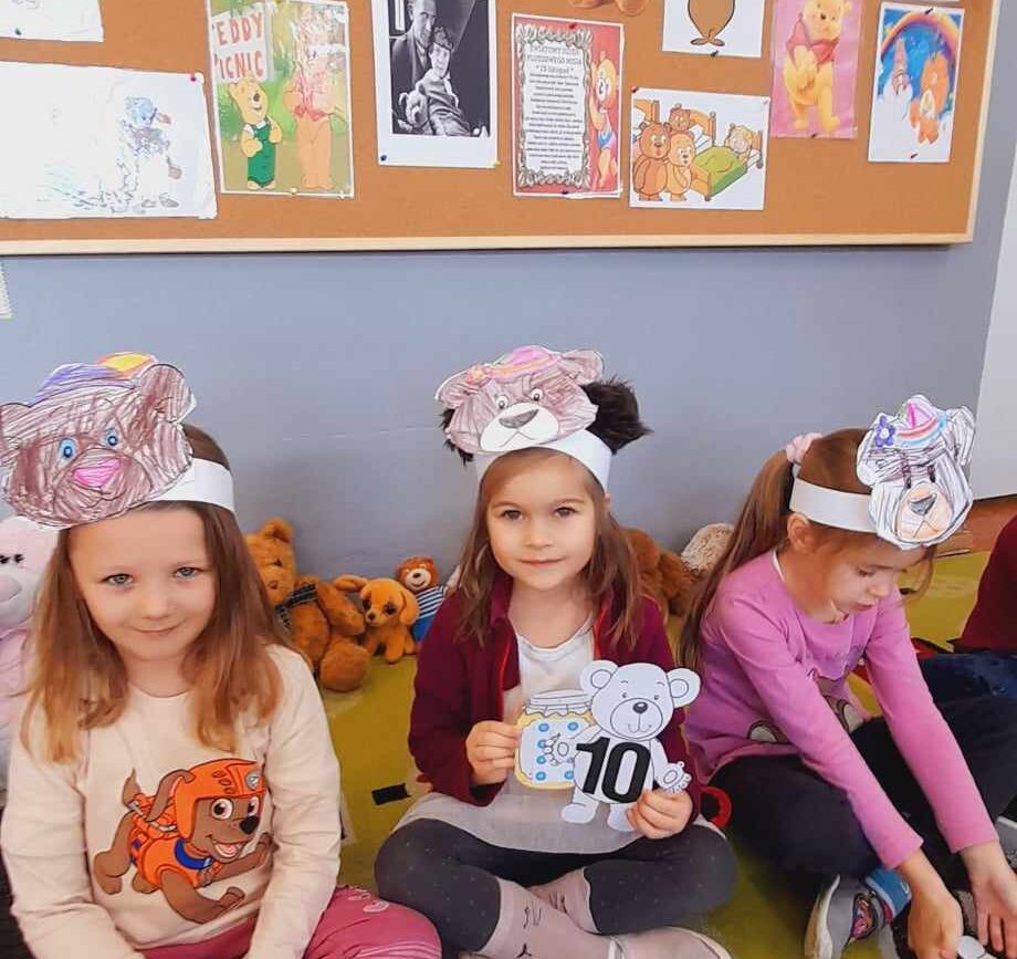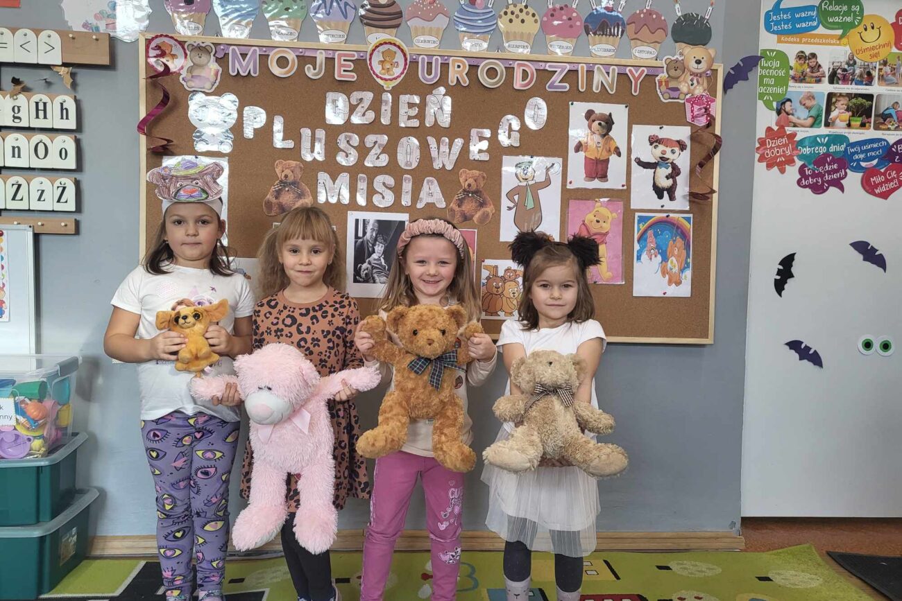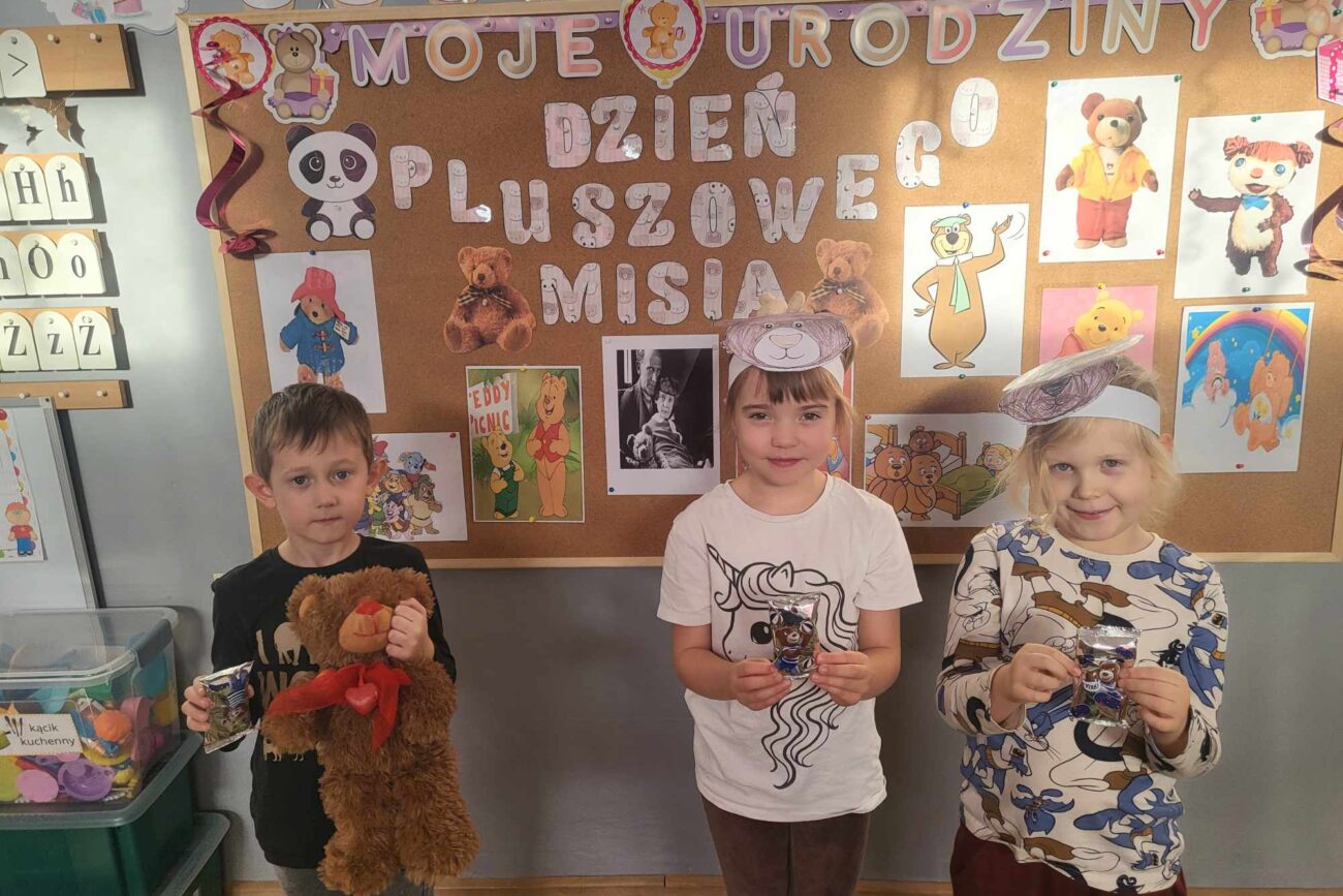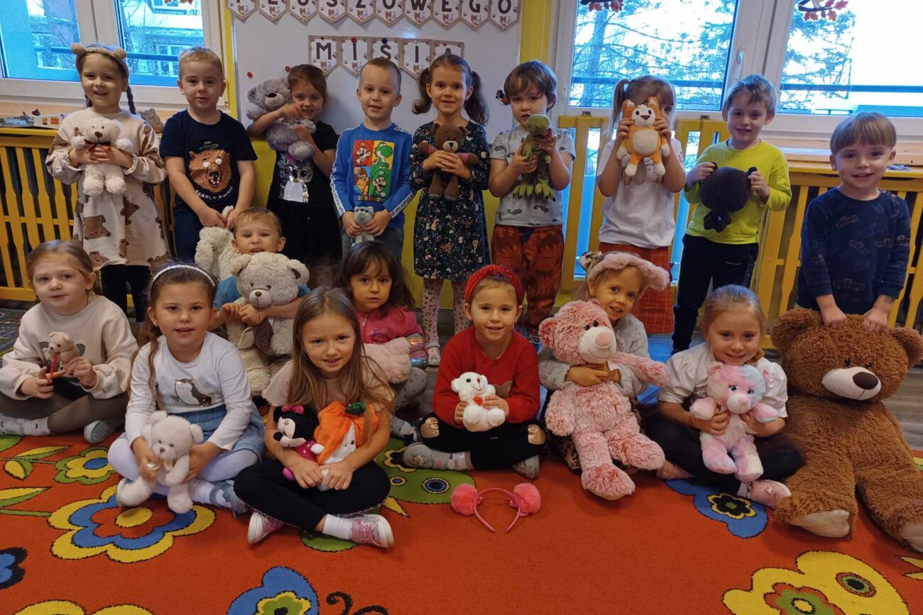 Dnia 27.11.2023r. nasze przedszkolaki obchodziły Dzień Pluszowego Misia. Z tej okazji dzieci przyniosły swoje ukochane Misie,z którymi wspólnie wykonywały zadnia. Na sam początek wspólnie zaśpiewały piosenkę „Jadą, jadą misie”, następnie dowiedziały się w jaki sposób miś powstal, wykonywały Misiowe zadania oraz układały puzzle. Były wspólne tańce, nauka wierszyka. Nie mogło zabraknąć wysłuchania bajki o „Kubusiu Puchatku”, a na koniec zajęć wykonane zostały pracę plastyczne.