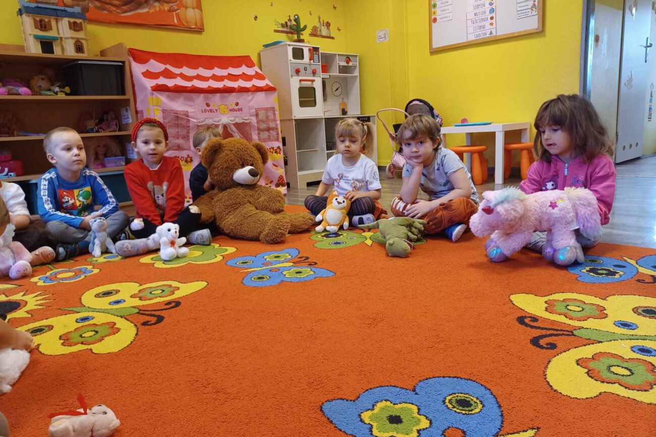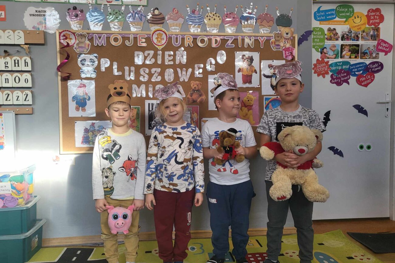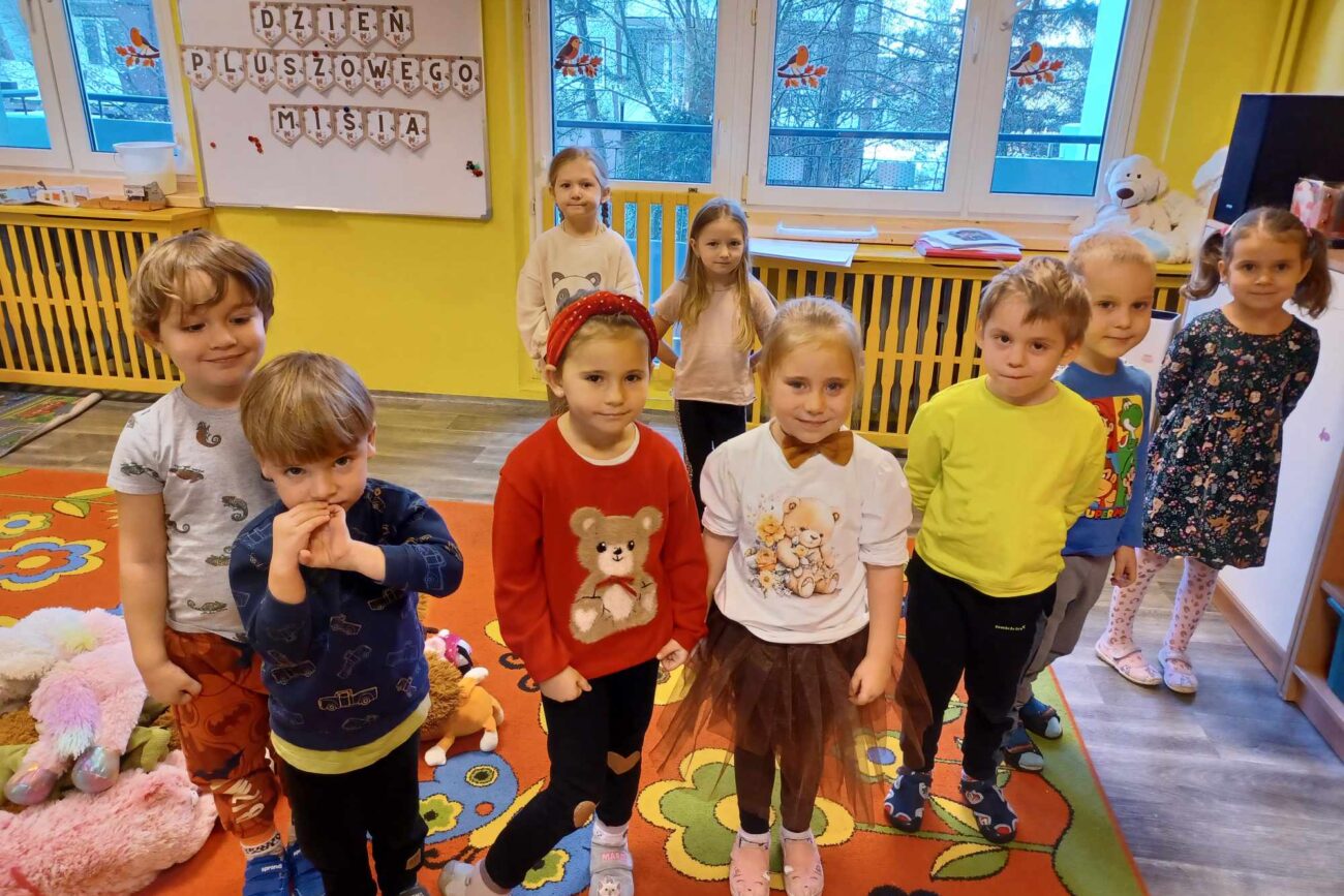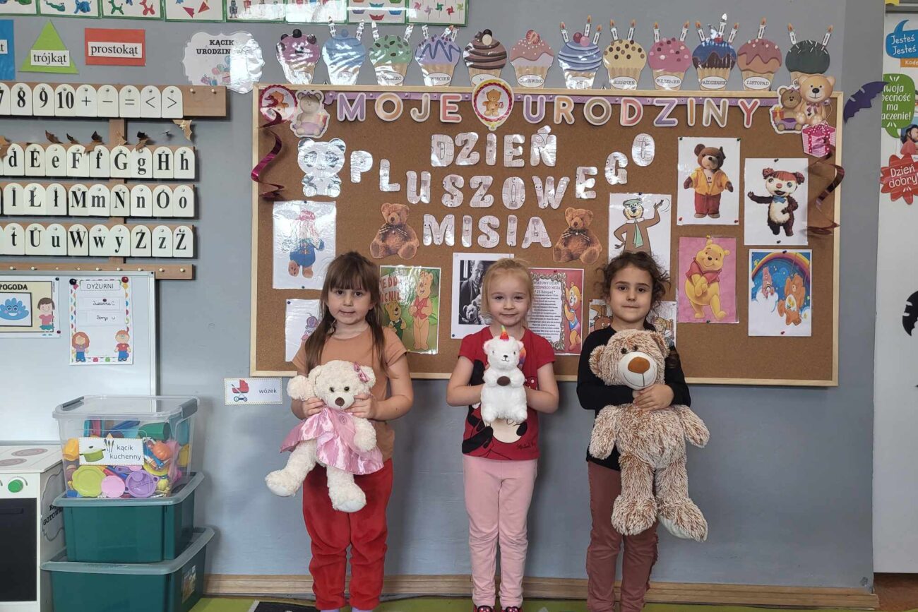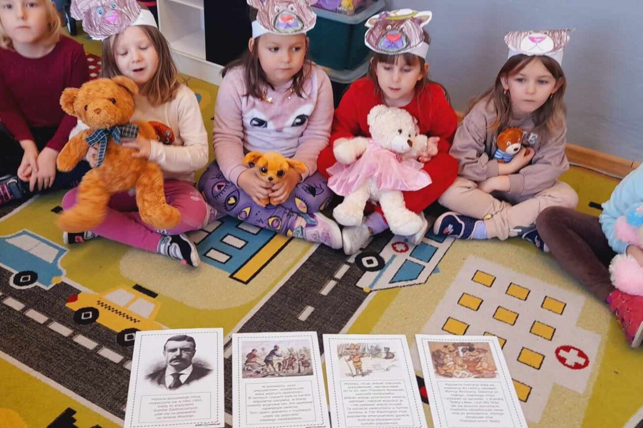 Dnia 27.11.2023r. nasze przedszkolaki obchodziły Dzień Pluszowego Misia. Z tej okazji dzieci przyniosły swoje ukochane Misie,z którymi wspólnie wykonywały zadnia. Na sam początek wspólnie zaśpiewały piosenkę „Jadą, jadą misie”, następnie dowiedziały się w jaki sposób miś powstal, wykonywały Misiowe zadania oraz układały puzzle. Były wspólne tańce, nauka wierszyka. Nie mogło zabraknąć wysłuchania bajki o „Kubusiu Puchatku”, a na koniec zajęć wykonane zostały pracę plastyczne.