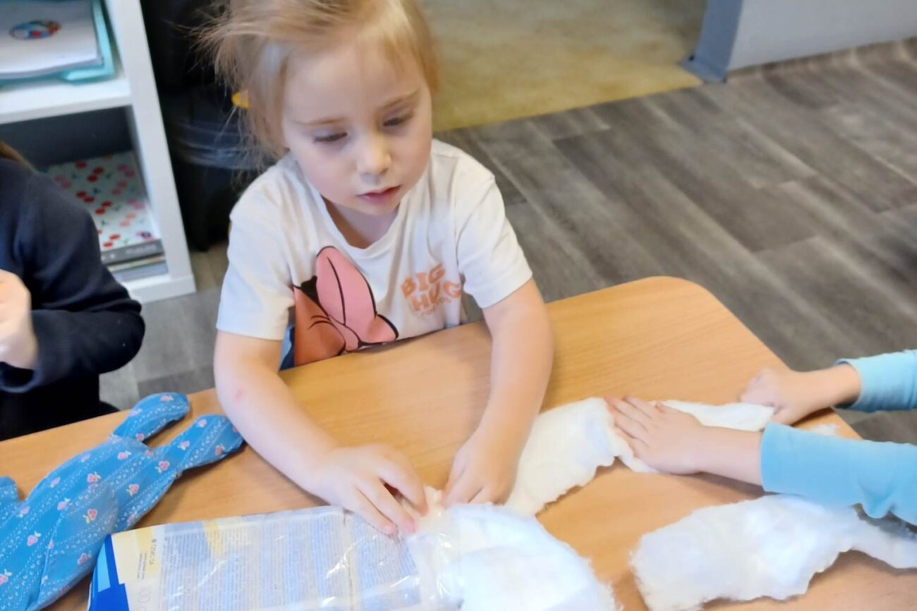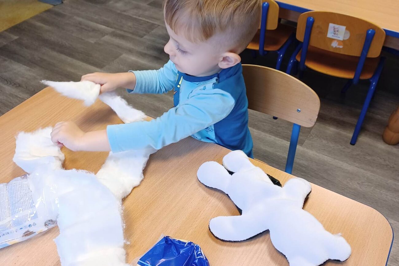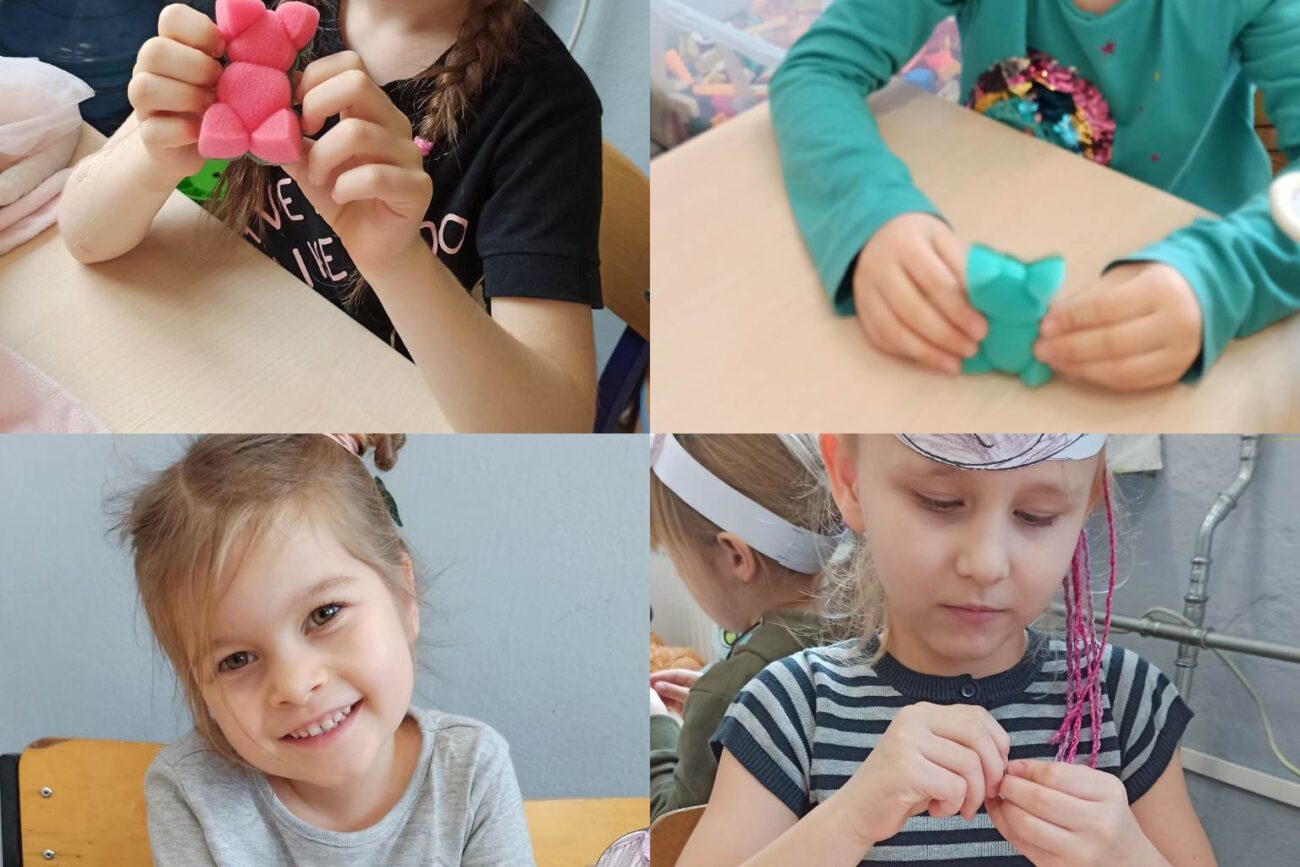 Biedronki: malowały farbami sylwety misia oraz własnoręcznie wykonały opaski na głowę oraz zrobiły misie z wykorzystaniem gąbki kuchennej i gumeczek.