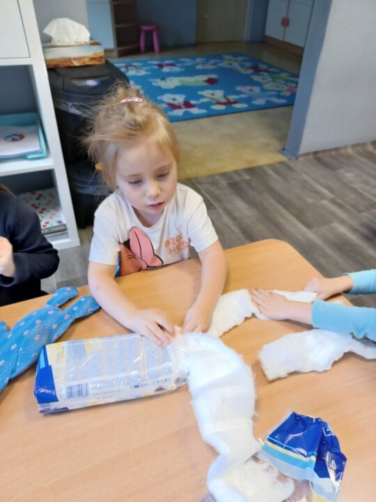 Biedronki: malowały farbami sylwety misia oraz własnoręcznie wykonały opaski na głowę oraz zrobiły misie z wykorzystaniem gąbki kuchennej i gumeczek.
