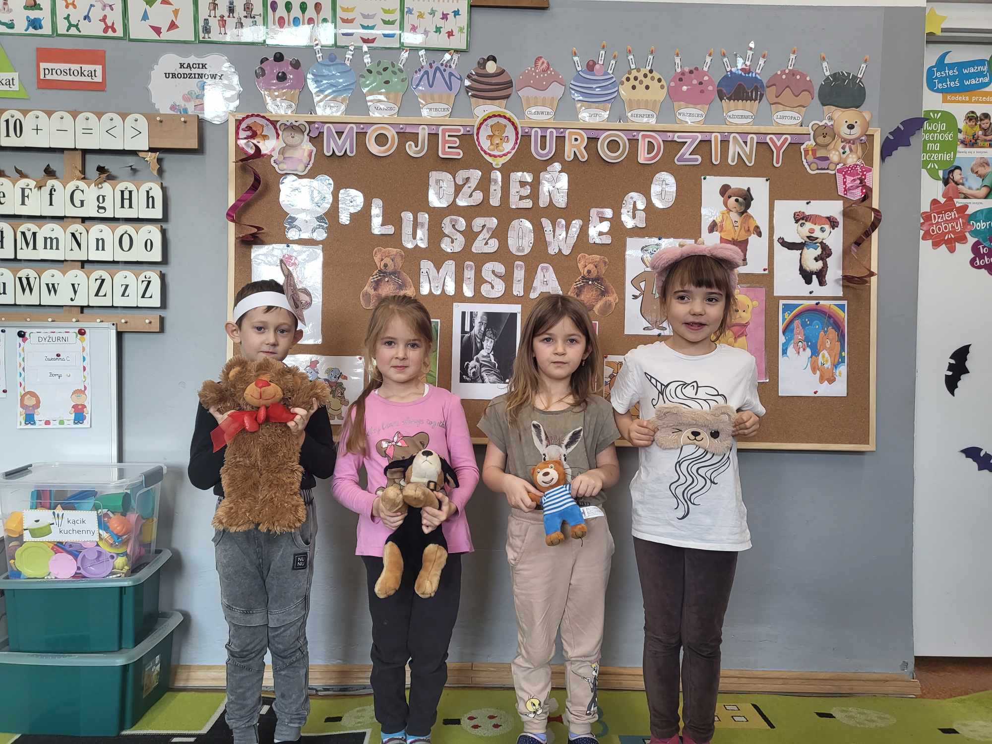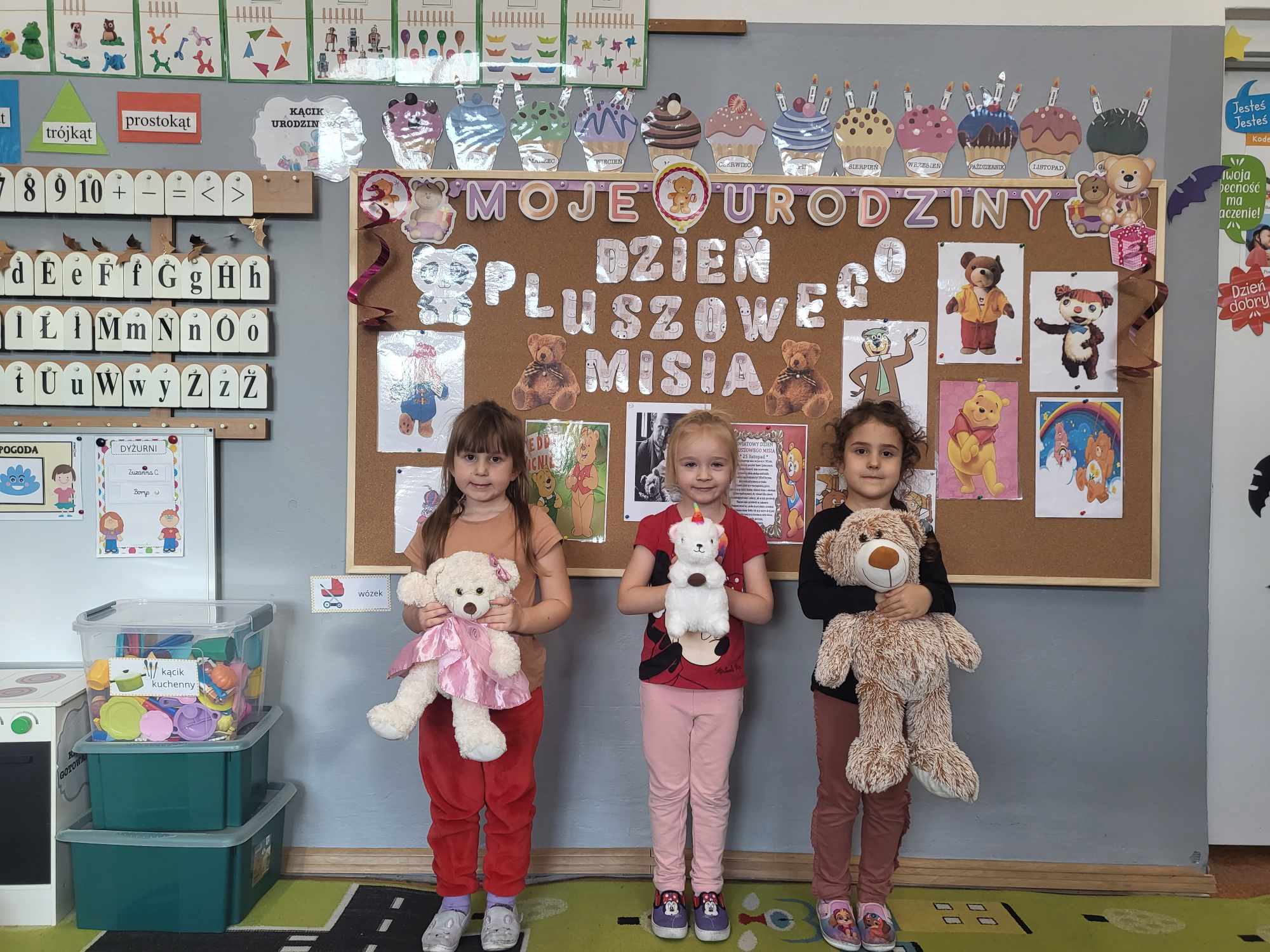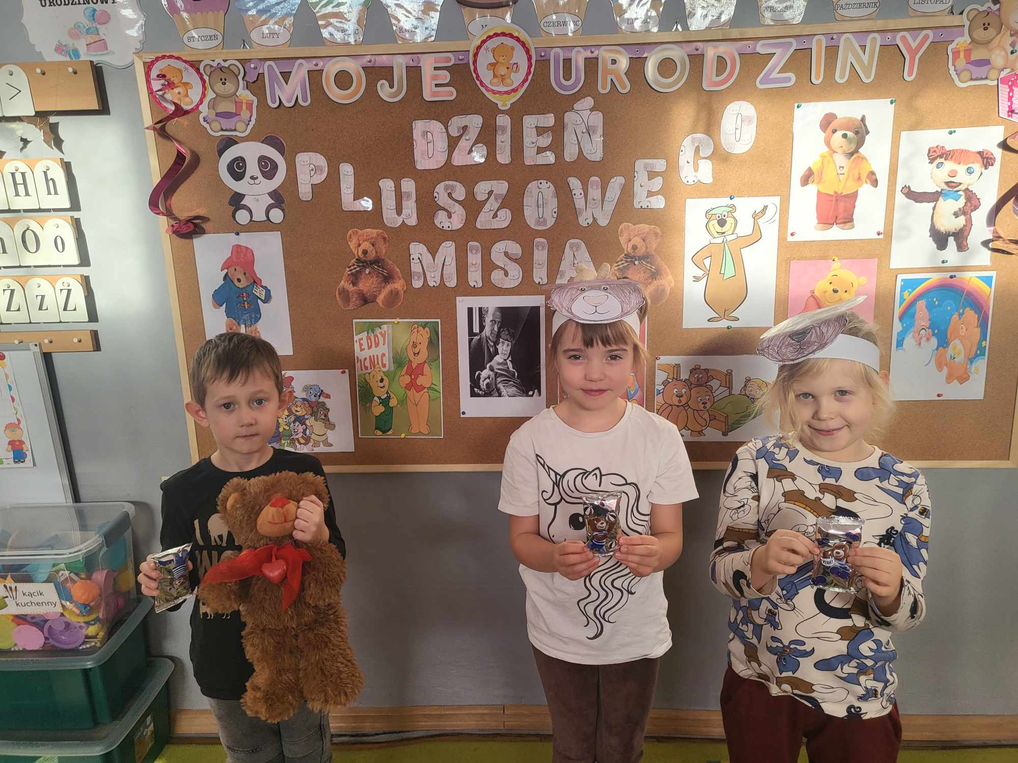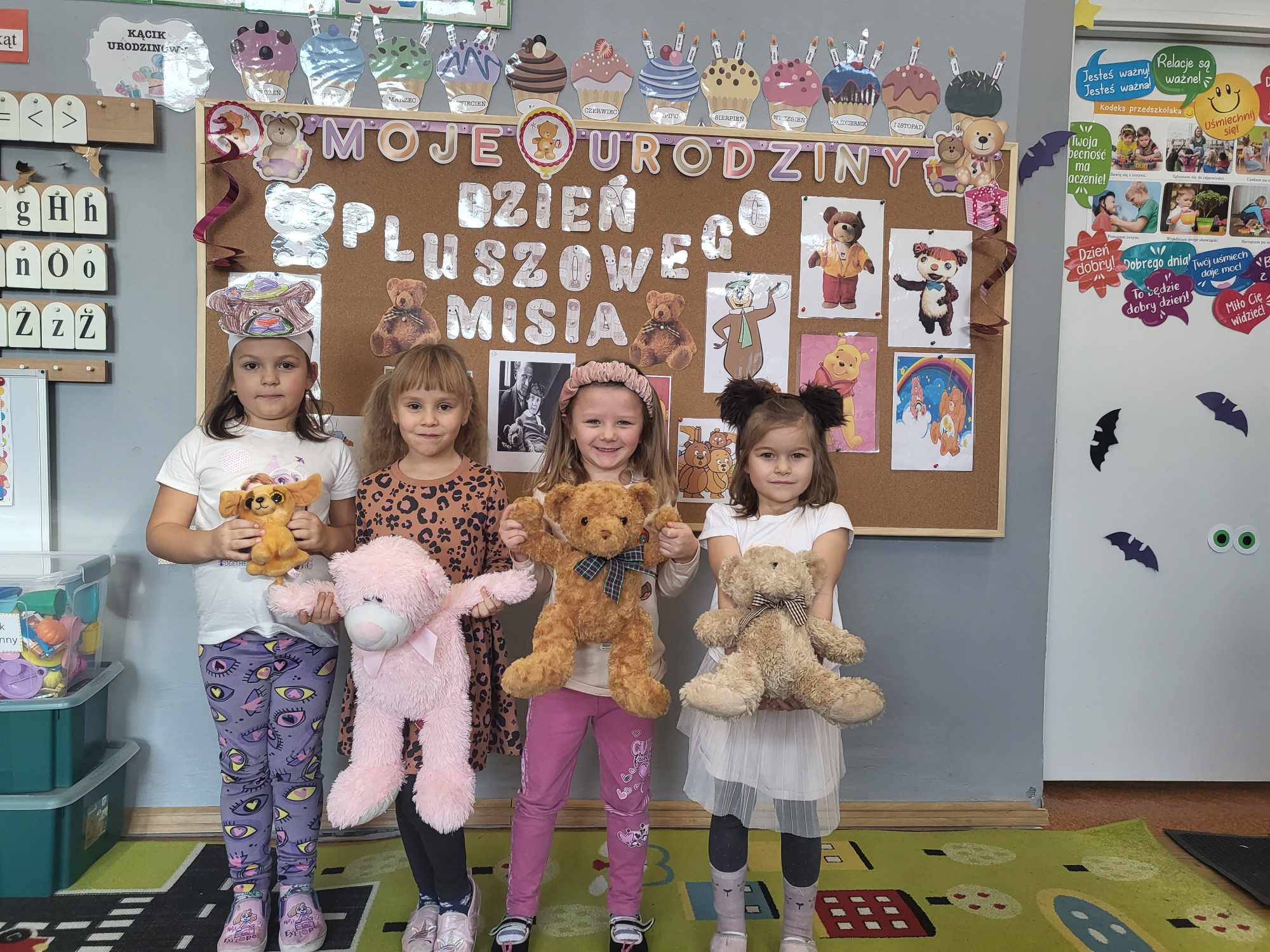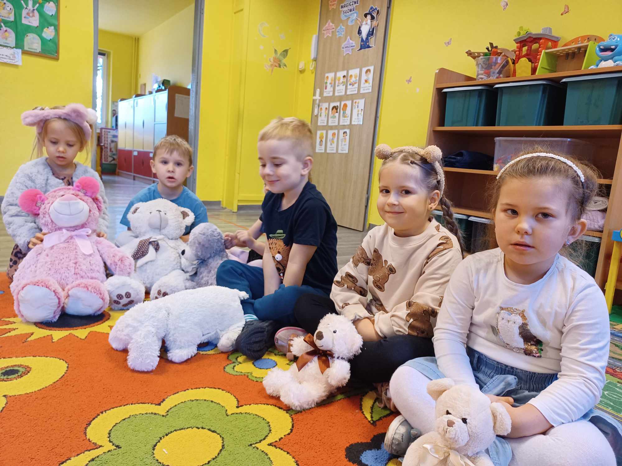 Dnia 27.11.2023r. nasze przedszkolaki obchodziły Dzień Pluszowego Misia. Z tej okazji dzieci przyniosły swoje ukochane Misie,z którymi wspólnie wykonywały zadnia. Na sam początek wspólnie zaśpiewały piosenkę „Jadą, jadą misie”, następnie dowiedziały się w jaki sposób miś powstal, wykonywały Misiowe zadania oraz układały puzzle. Były wspólne tańce, nauka wierszyka. Nie mogło zabraknąć wysłuchania bajki o „Kubusiu Puchatku”, a na koniec zajęć wykonane zostały pracę plastyczne.