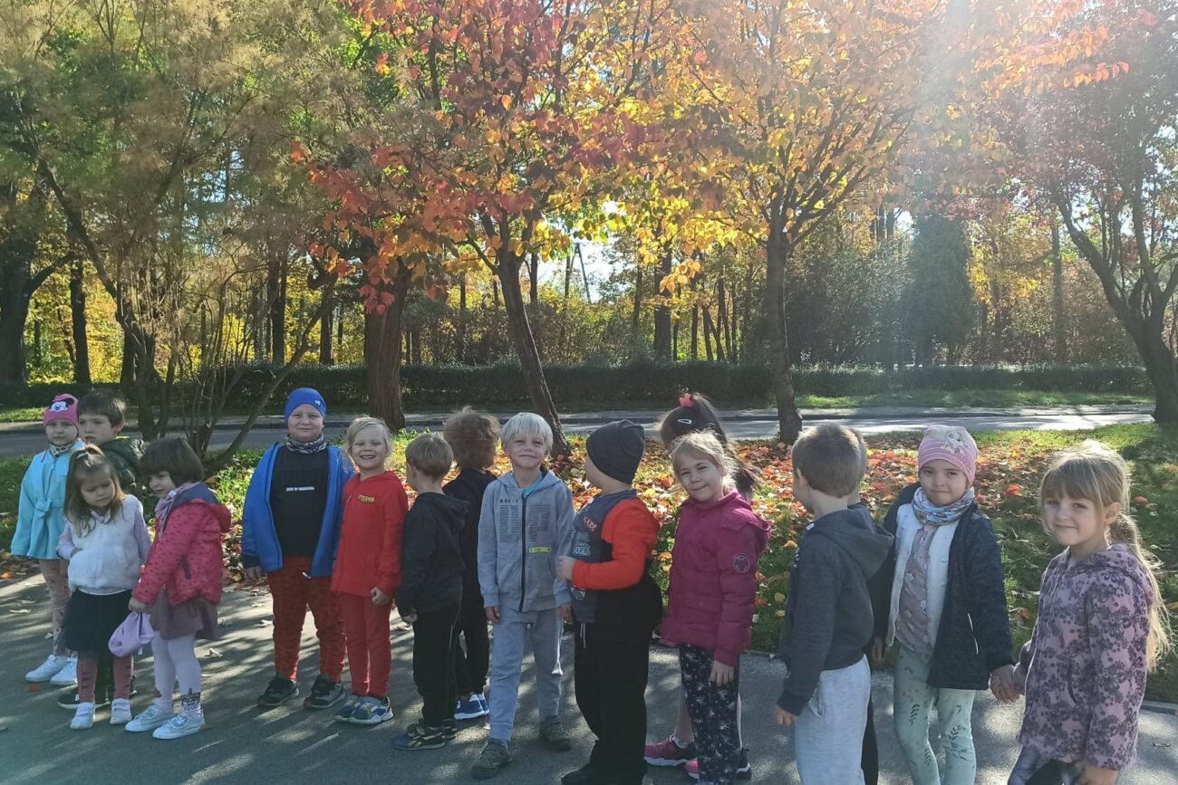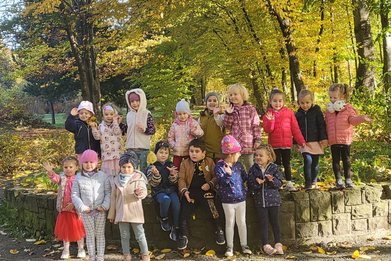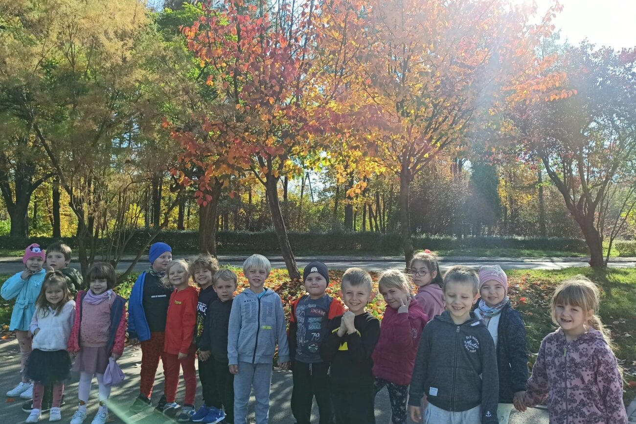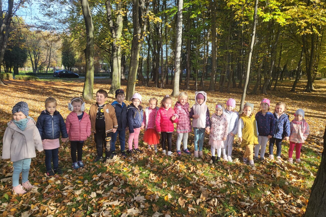 Jesień to piękna pora roku, raz pełna kolorów i wspaniałych widoków innym razem mokra i mglista. W pogodne dni korzystamy ze spacerów i zabaw na świeżym powietrzu. Przedszkolaki chętnie podziwiają miejscowy park w jesiennej szacie, otaczającą przyrodę, rozpoznają gatunki drzew oraz zbierają liście.