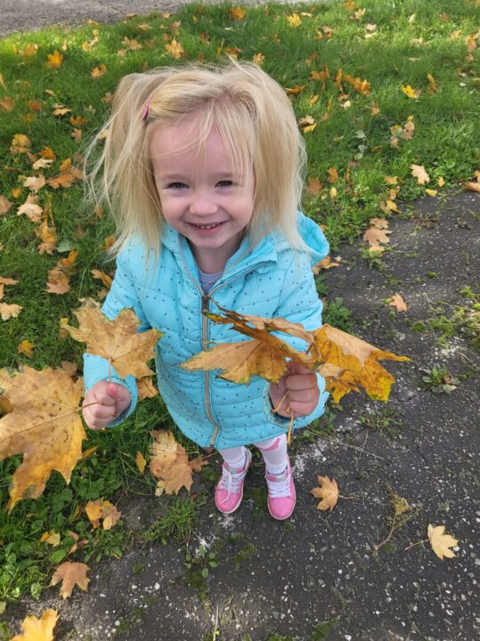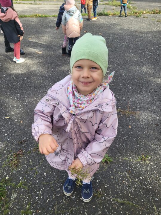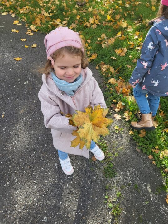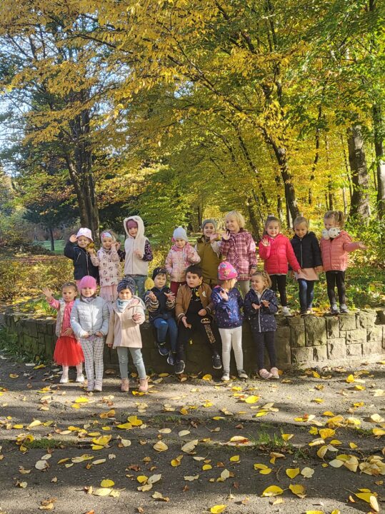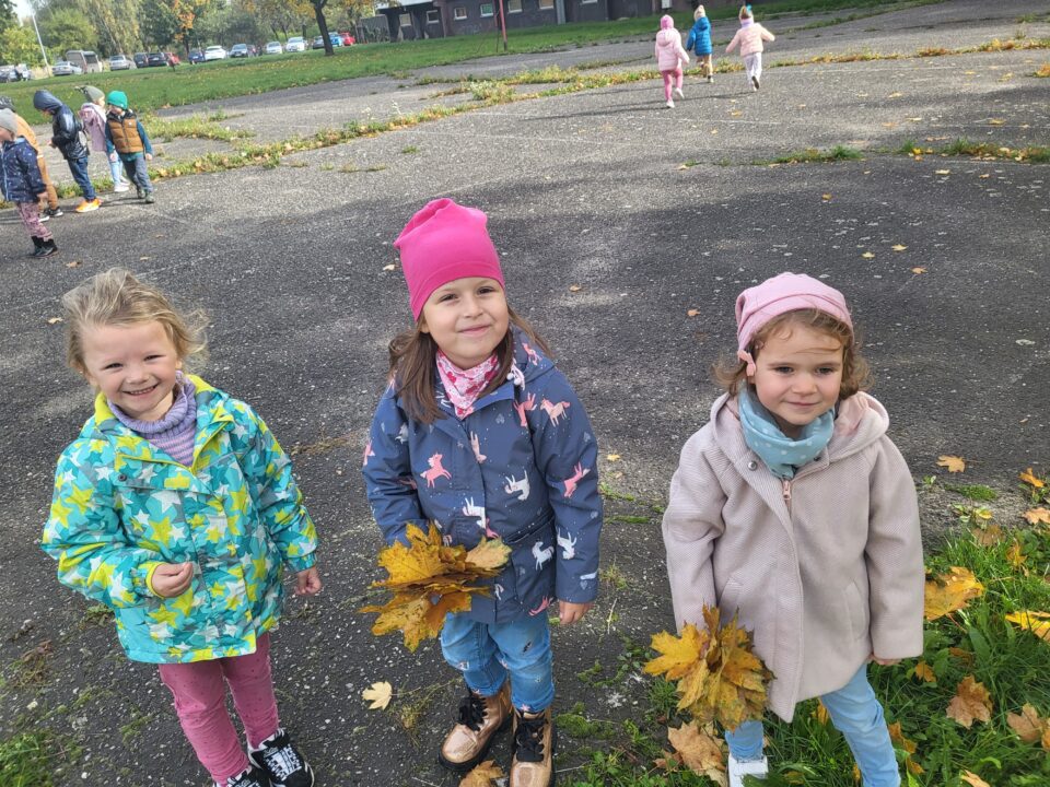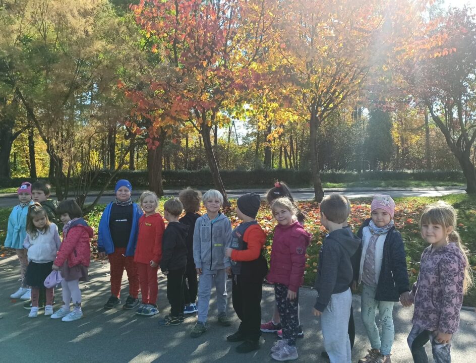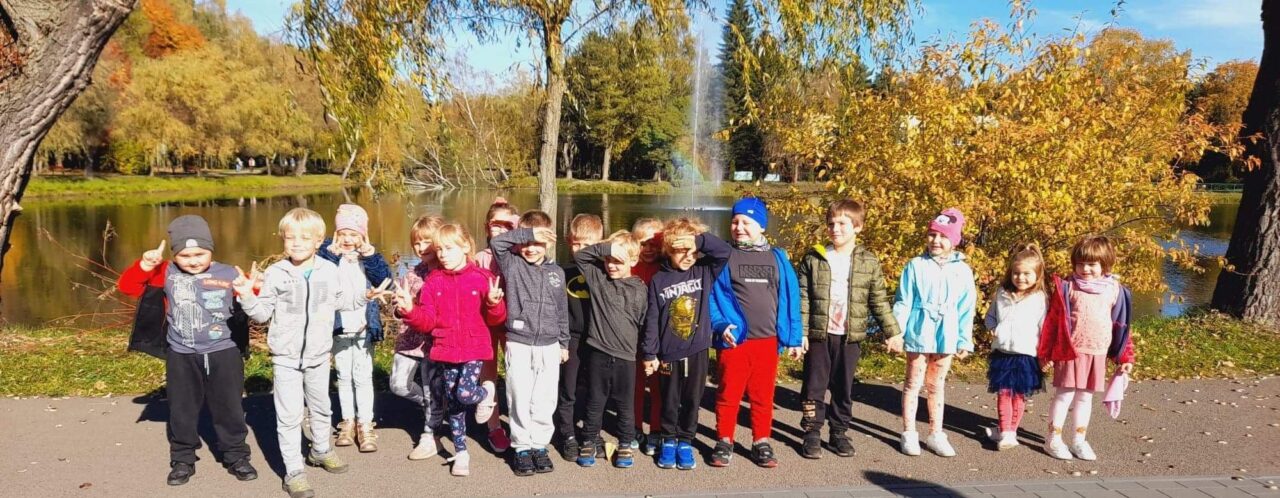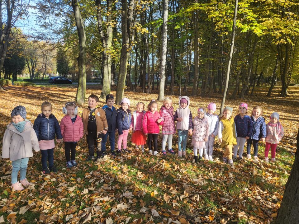 Jesień to piękna pora roku, raz pełna kolorów i wspaniałych widoków innym razem mokra i mglista. W pogodne dni korzystamy ze spacerów i zabaw na świeżym powietrzu. Przedszkolaki chętnie podziwiają miejscowy park w jesiennej szacie, otaczającą przyrodę, rozpoznają gatunki drzew oraz zbierają liście.