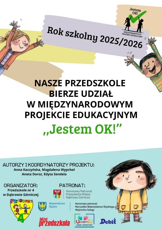 W roku szkolnym 2025/2026 grupa „Motylki” w okresie od 01.11.2025r. do 31.01.2026r. weźmie udział w Międzynarodowym Projekcie edukacyjnym „Jestem OK!”.