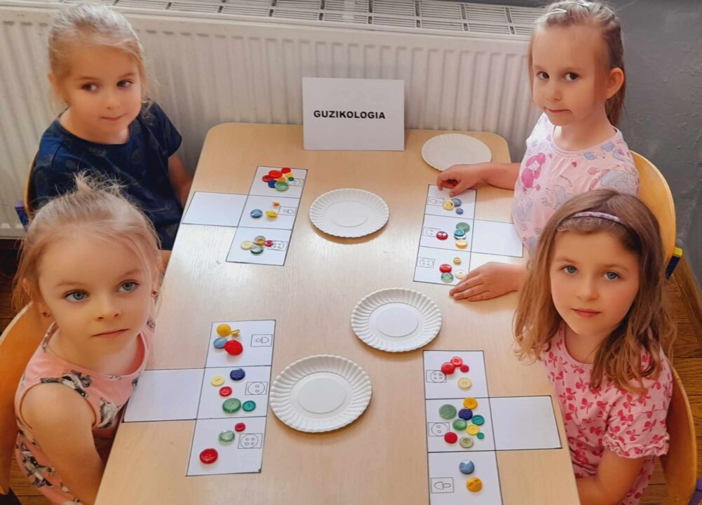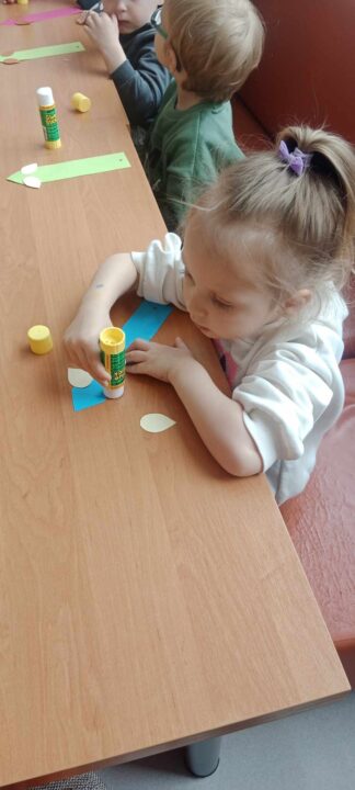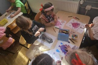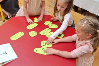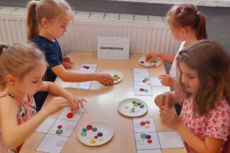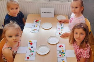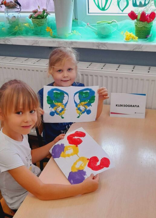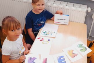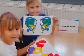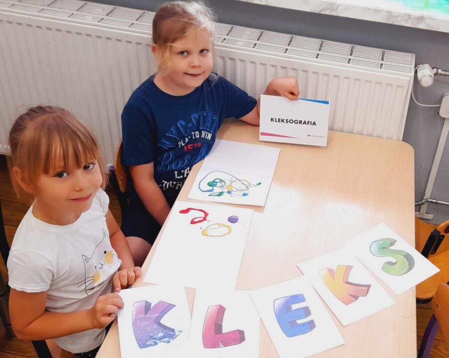 - Uczestniczyły w zabawach rozwijających kreatywność na podstawie bajki:,, Akademia Pana Kleksa”, gdzie wykonywały przy oznakowanych stanowiskach różne zadania do wykonania, min. układały z rozsypanki literowej napis: „KLEKS” oraz tworzyły kleksy za pomocą farby na kartce papieru.