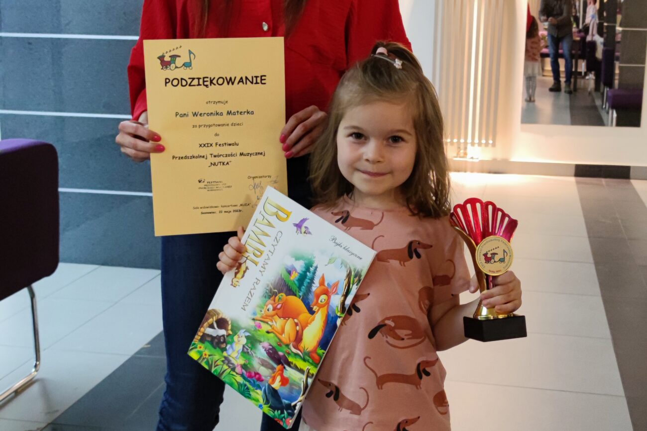 Dnia 22.05.2023r. w Sali Widowiskowo-Koncertowej MUZA w Sosnowcu odbył się XXIX Festiwal Przedszkolnej Twórczości Muzycznej „NUTKA”, podczas którego dzieci z kilkudziesięciu sosnowieckich przedszkoli prezentowały swoje umiejętności wokalne i taneczne. Nasze Przedszkole reprezentowała Melania Prusaczyk z grupy „Biedronki” z piosenką pt.: „Popatrzcie na jamniczka”.