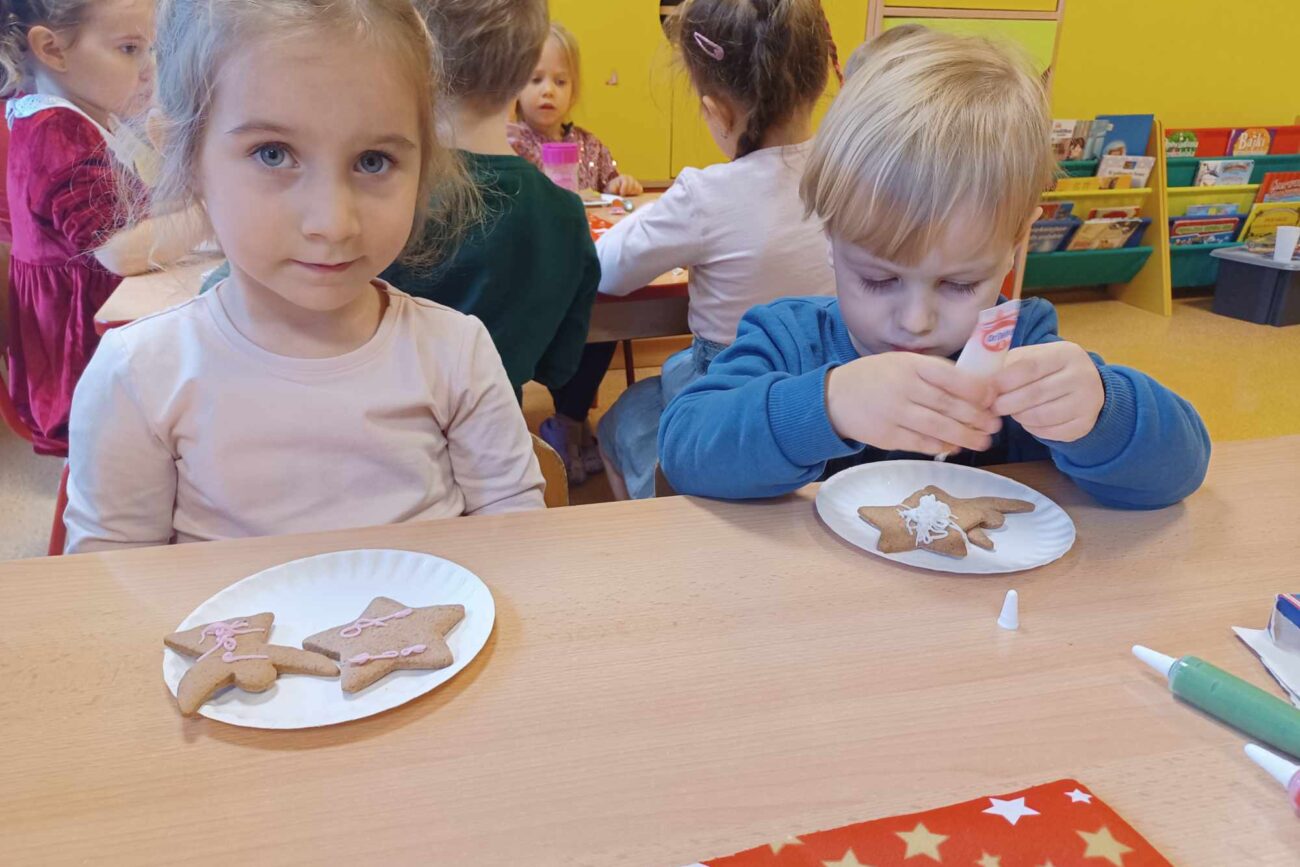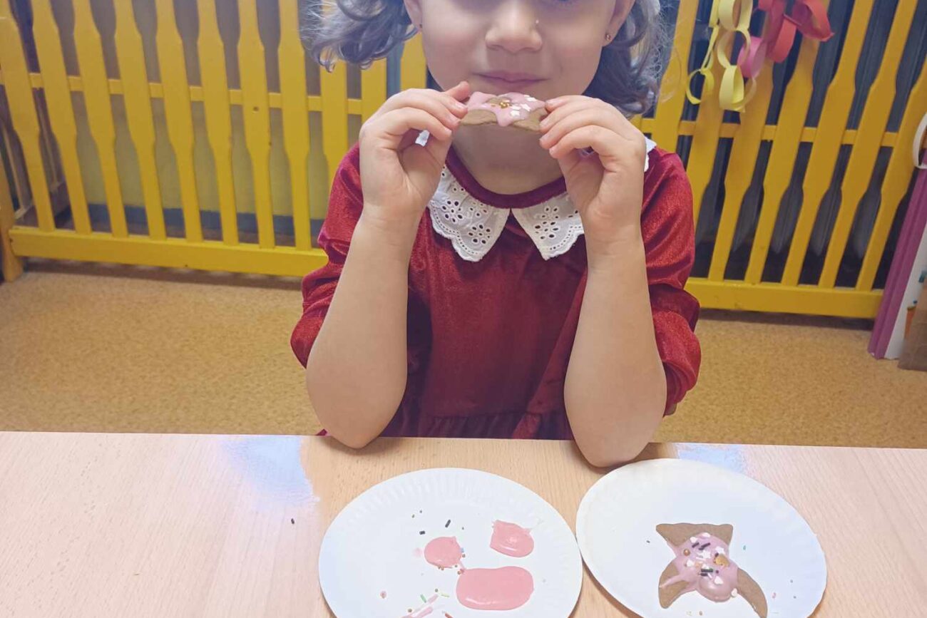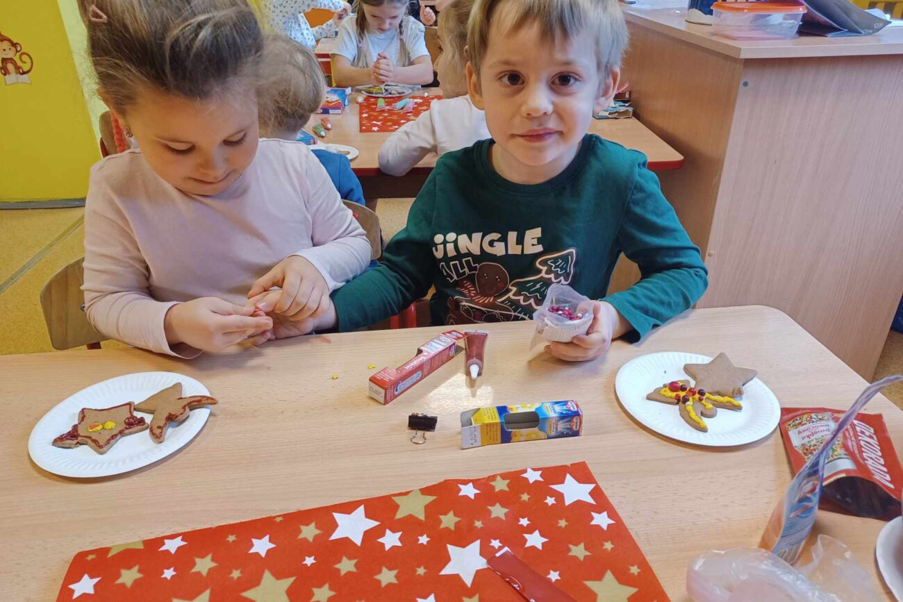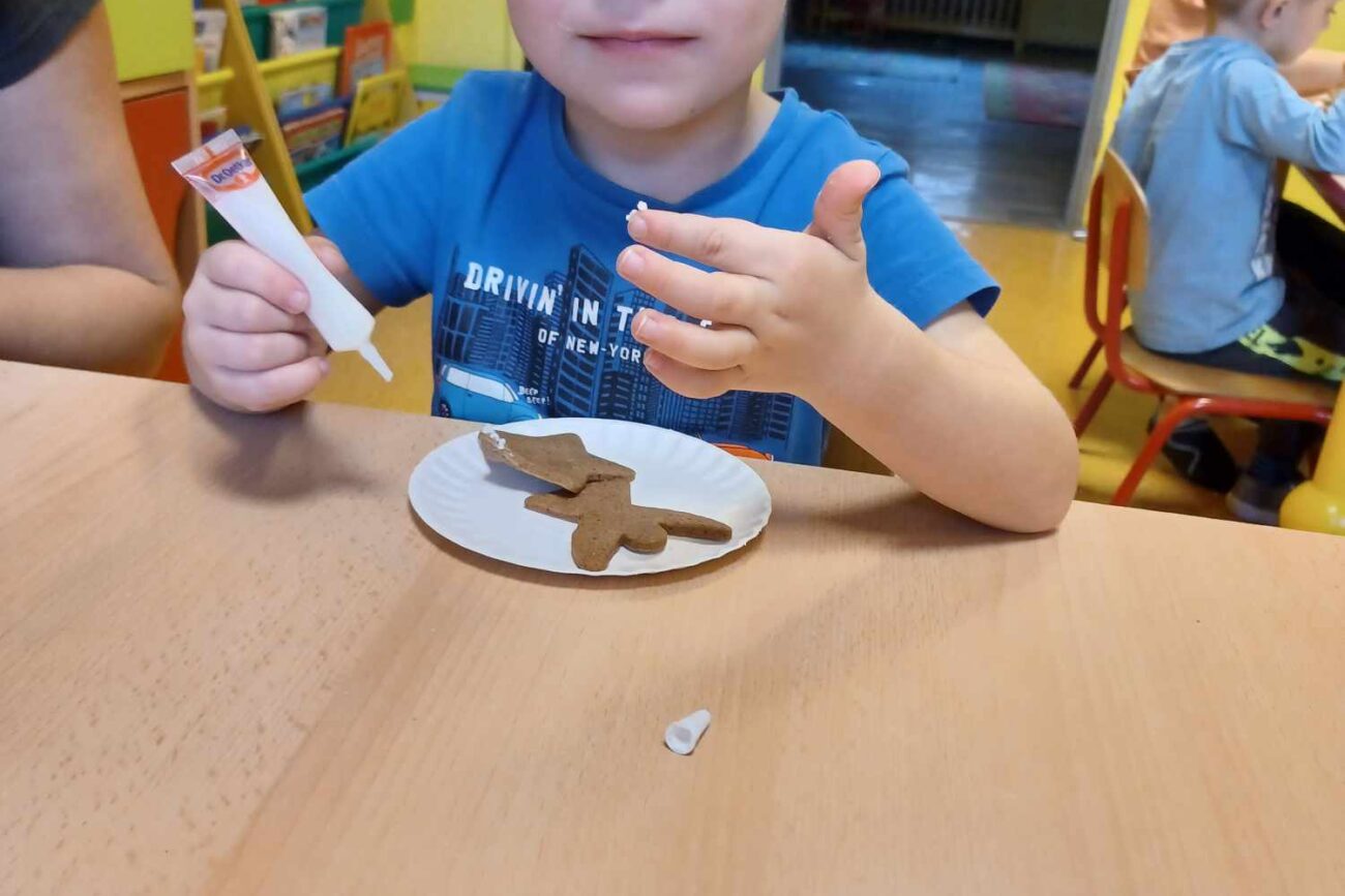15 grudnia 2023r. w naszym przedszkolu unosił się zapach korzennych przypraw, a wszystko dlatego, że dzieci z grupy „Motylki” oraz „Misie” tego dnia piekły świąteczne pierniczki. Najpierw odpowiednio się przygotowały dbając o czyste rączki. Poznały też składniki i sposób wykonania ciasta, potrzebne przybory kuchenne, a także zasady bezpieczeństwa. Gdy wszystko było gotowe przedszkolaki z ogromnym zapałem i zaangażowaniem zabrały się do pracy – dekorowały wcześniej przygotowane pierniczki kolorowym lukrem i barwnymi posypkami. Warsztaty z pieczenia poprowadziła pani Ania. Pod jej czujnym okiem powstały przepiękne pierniki w świątecznych kształtach: gwiazdki, śnieżynki i aniołki. Dziękujemy Rodzicom za pomoc w przygotowaniu pysznych pierniczków ![]()