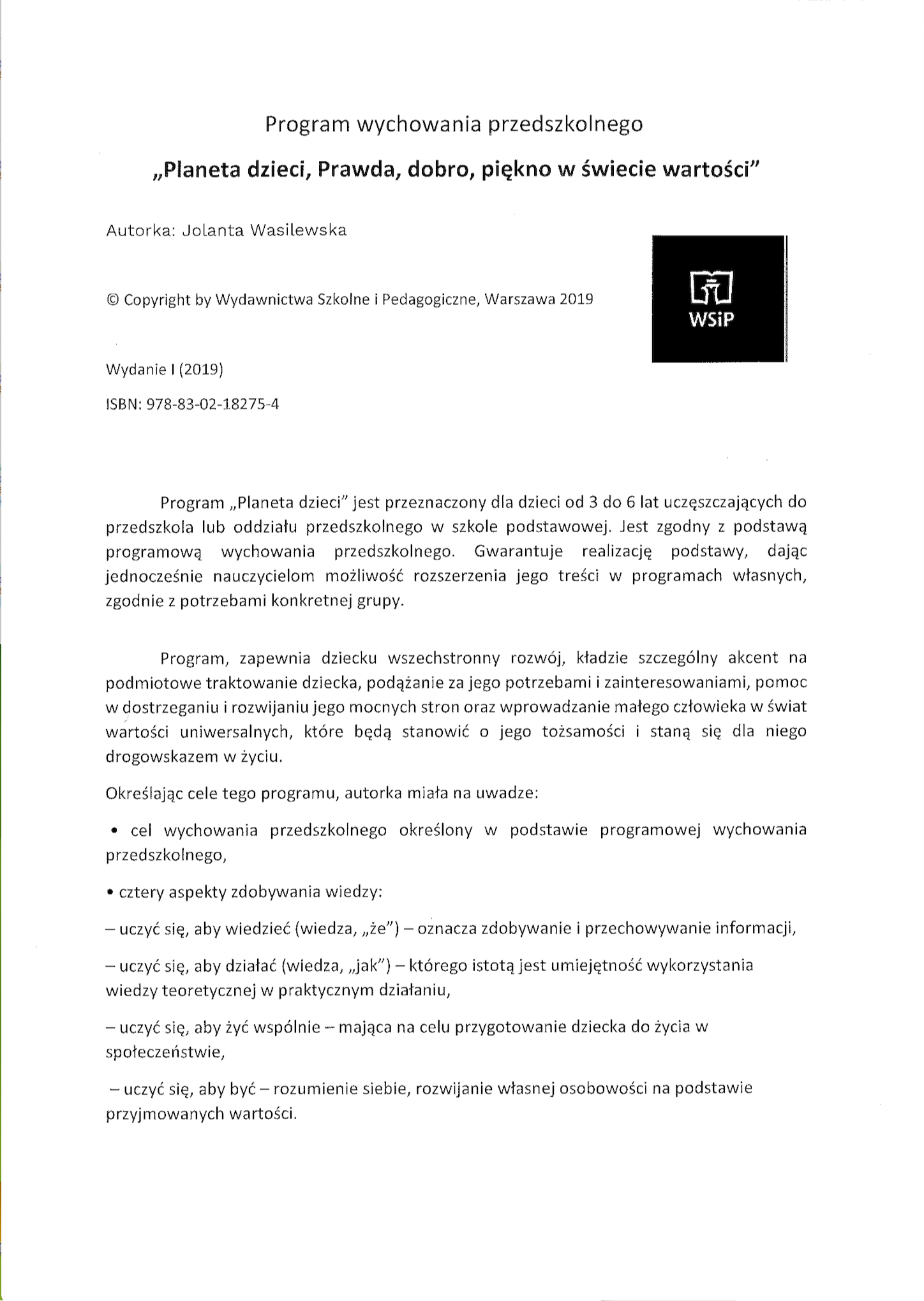 Program wychowania przedszkolnego „Planeta dzieci, Prawda, dobro, piękno w świecie wartości”