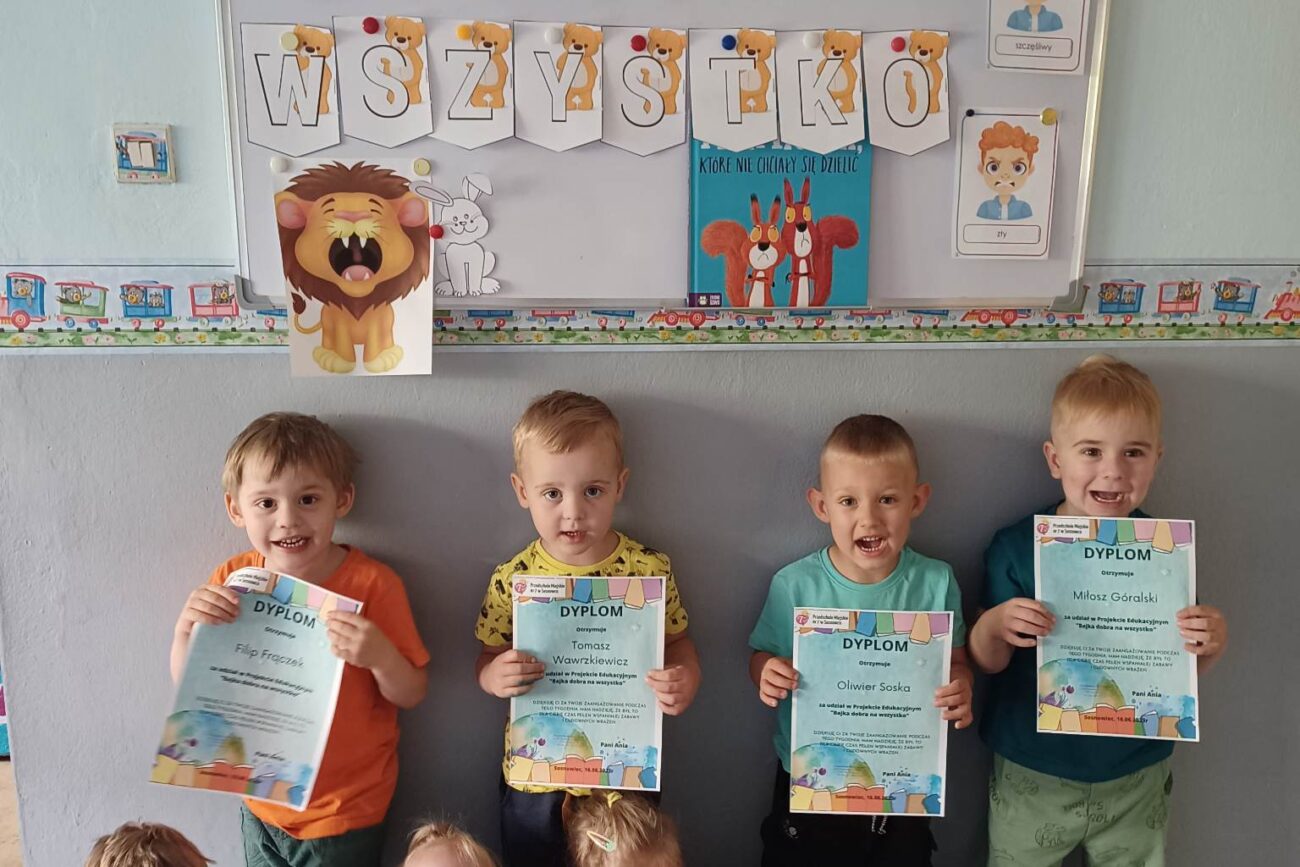 Grupa „Misie” w dniach od 12.06-16.06.2023 brała udział w projekcie edukacyjnym pt.”Bajka dobra na wszystko” przygotowanym przez panią Anię. Celem tego projektu było wspomaganie rozwoju dziecka, pomoc w przezwyciężaniu leków wieku przedszkolnego oraz kształtowanie właściwych postaw społecznych. Jak dobrze wiemy, świat bajek jest dla maluchów jedną z najbardziej ekscytujących i absorbujących krain, jakie poznają we wczesnym dzieciństwie. Dziecko zapoznaje się w nich z sytuacjami wzbudzajacymi niepokój oraz znajduje cudowne rozwiązanie problemów. Dzieci podczas zajęć słuchały różnych bajek, zastanawiając się wspólnie czy zachowania danych bohaterów były dobre i czy należy sie tak zachowywać. Wykonywały prace plastyczne a najbardziej utkwiła im praca z maską Lwa, która pozwalała im radzić sobie ze złością.