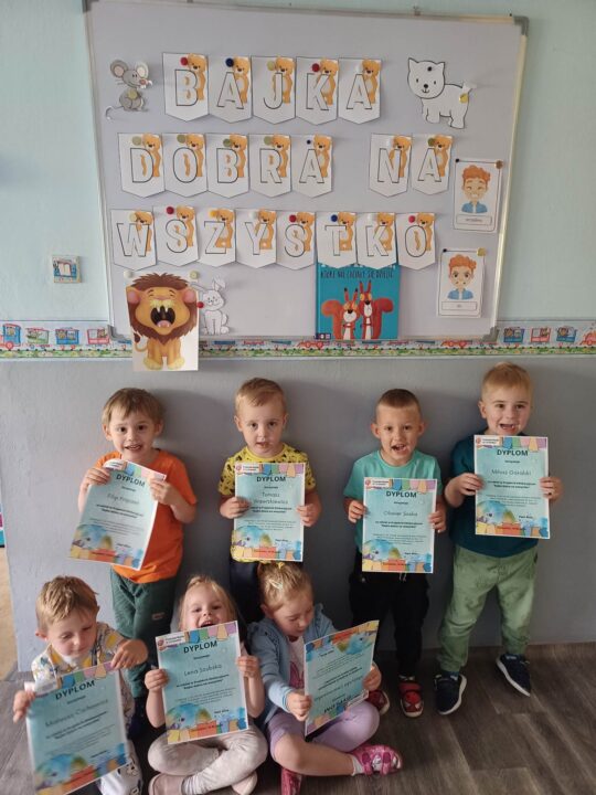 Grupa „Misie” w dniach od 12.06-16.06.2023 brała udział w projekcie edukacyjnym pt.”Bajka dobra na wszystko” przygotowanym przez panią Anię. Celem tego projektu było wspomaganie rozwoju dziecka, pomoc w przezwyciężaniu leków wieku przedszkolnego oraz kształtowanie właściwych postaw społecznych. Jak dobrze wiemy, świat bajek jest dla maluchów jedną z najbardziej ekscytujących i absorbujących krain, jakie poznają we wczesnym dzieciństwie. Dziecko zapoznaje się w nich z sytuacjami wzbudzajacymi niepokój oraz znajduje cudowne rozwiązanie problemów. Dzieci podczas zajęć słuchały różnych bajek, zastanawiając się wspólnie czy zachowania danych bohaterów były dobre i czy należy sie tak zachowywać. Wykonywały prace plastyczne a najbardziej utkwiła im praca z maską Lwa, która pozwalała im radzić sobie ze złością.