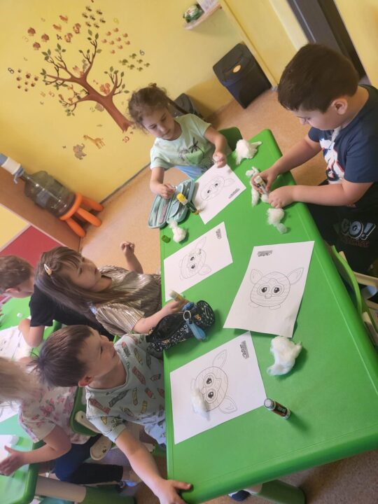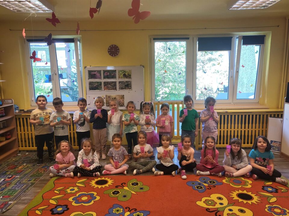 Przedszkolaki z zaciekawieniem wysłuchali „Bajkę o ciepłym i puchatym”. Była rozmowa na temat: co to są ciepłe i puchate oraz zimne i kolczaste słowa. Wszystkim uświadomiło to, że słowa są nieprzewidywalne, mogą sprawiać radość, ale również mogą zranić. Motylki przez cały tydzień za dobre uczynki zbierały do plastikowych kubeczków puchate kuleczki – symbol życzliwości. Dzieci wspólnie szukali ciepłego – puchatego oraz zimnego i kolczastego w naszej codzienności. Przedszkolaki miały za zadanie aby, smutnego stworka uszczęśliwić zdobiąc go ciepłym i puchatym. Nie zabrakło zabaw w których przedszkolaki uczyły się mówić o swoich emocjach. Na zakończenie każde dziecko zabrało do domu swój kubek z ciepłym i puchatym szerząc życzliwość i dobro również wśród rodziny.