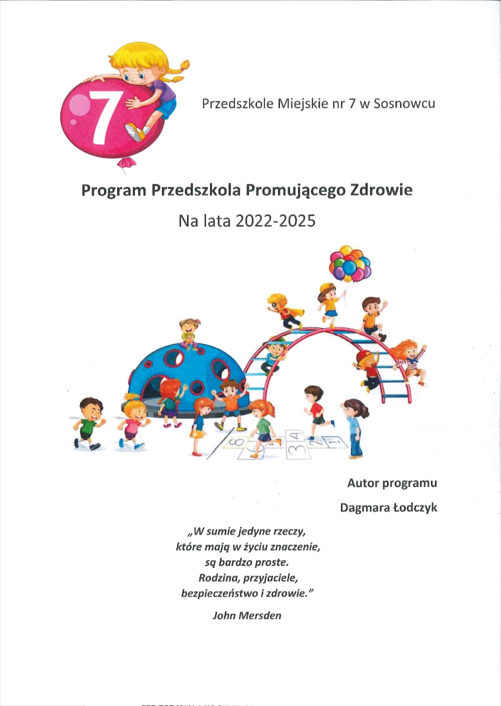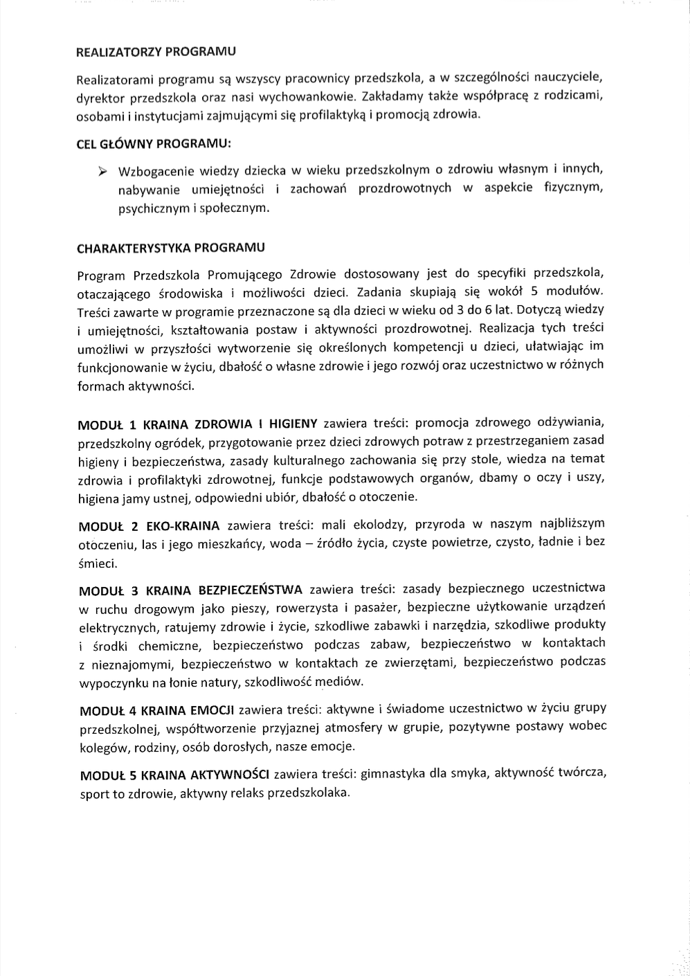 Opracowany przez nauczycieli przedszkola program ma na celu promowanie zdrowego stylu życia poprzez zachęcanie dzieci do większej aktywności fizycznej oraz propagowanie prawidłowych nawyków żywieniowych. Dzięki temu dzieci z naszego przedszkola i ich rodziny będą się cieszyły lepszą kondycją fizyczną oraz stanem zdrowia. Przez cały rok szkolny będziemy podejmować szereg inicjatyw, aby uświadamiać znaczenie zdrowego stylu życia, które będzie owocować w przyszłości.