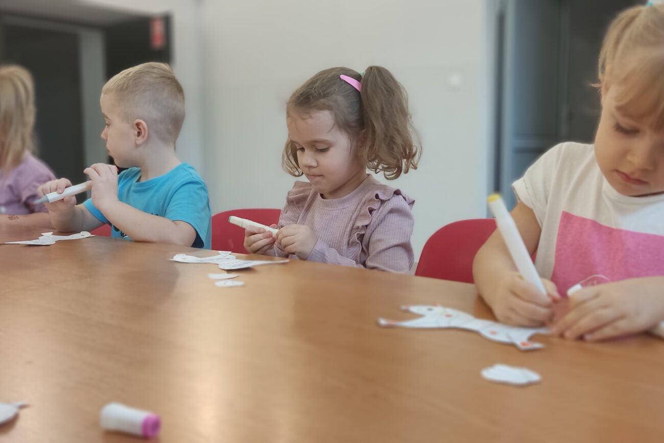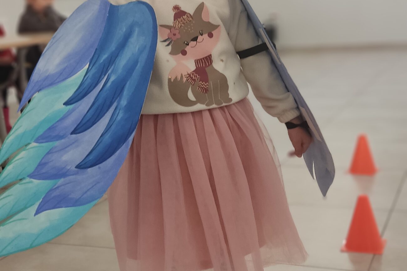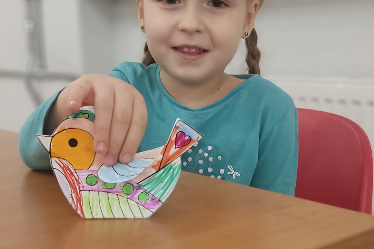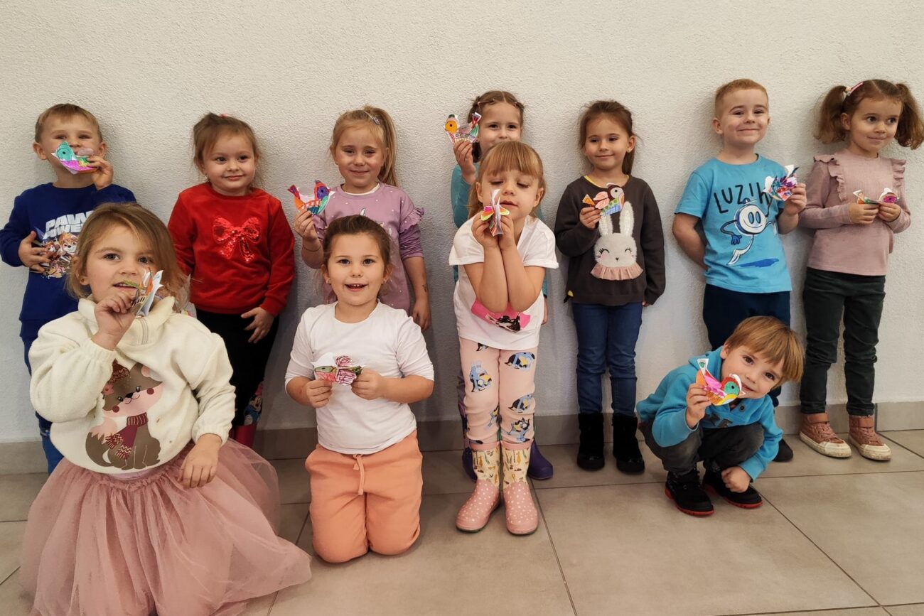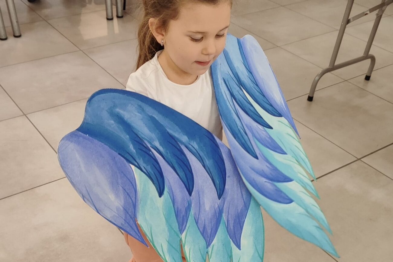 Na warsztatach dowiedziały się jakie ptaki odlatują do ciepłych krajów. Wysłuchały ciekawej bajki, odgadywały ptasie zagadki oraz miały okazję same poczuć się jak ptaki dzięki pięknym skrzydłom. Na koniec wykonały pracę plastyczną.