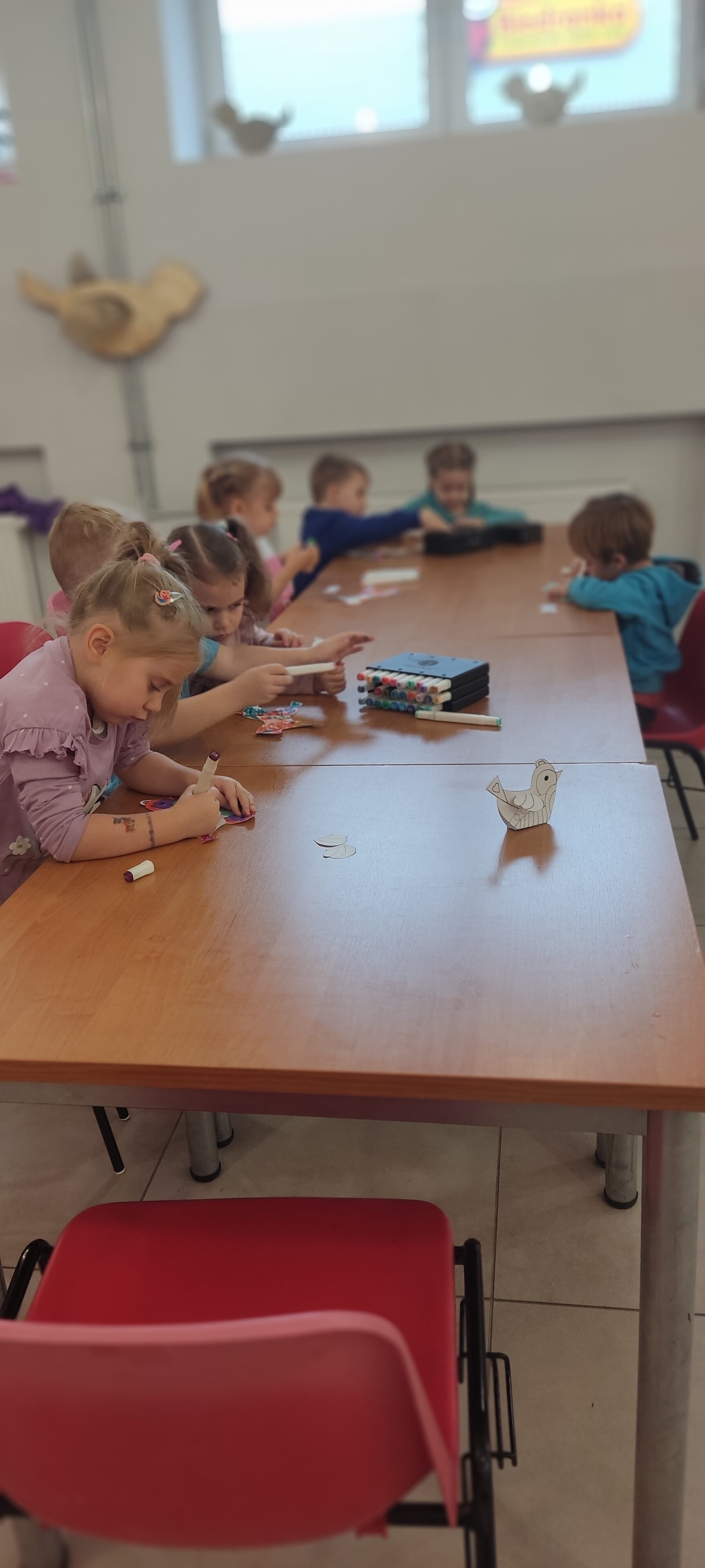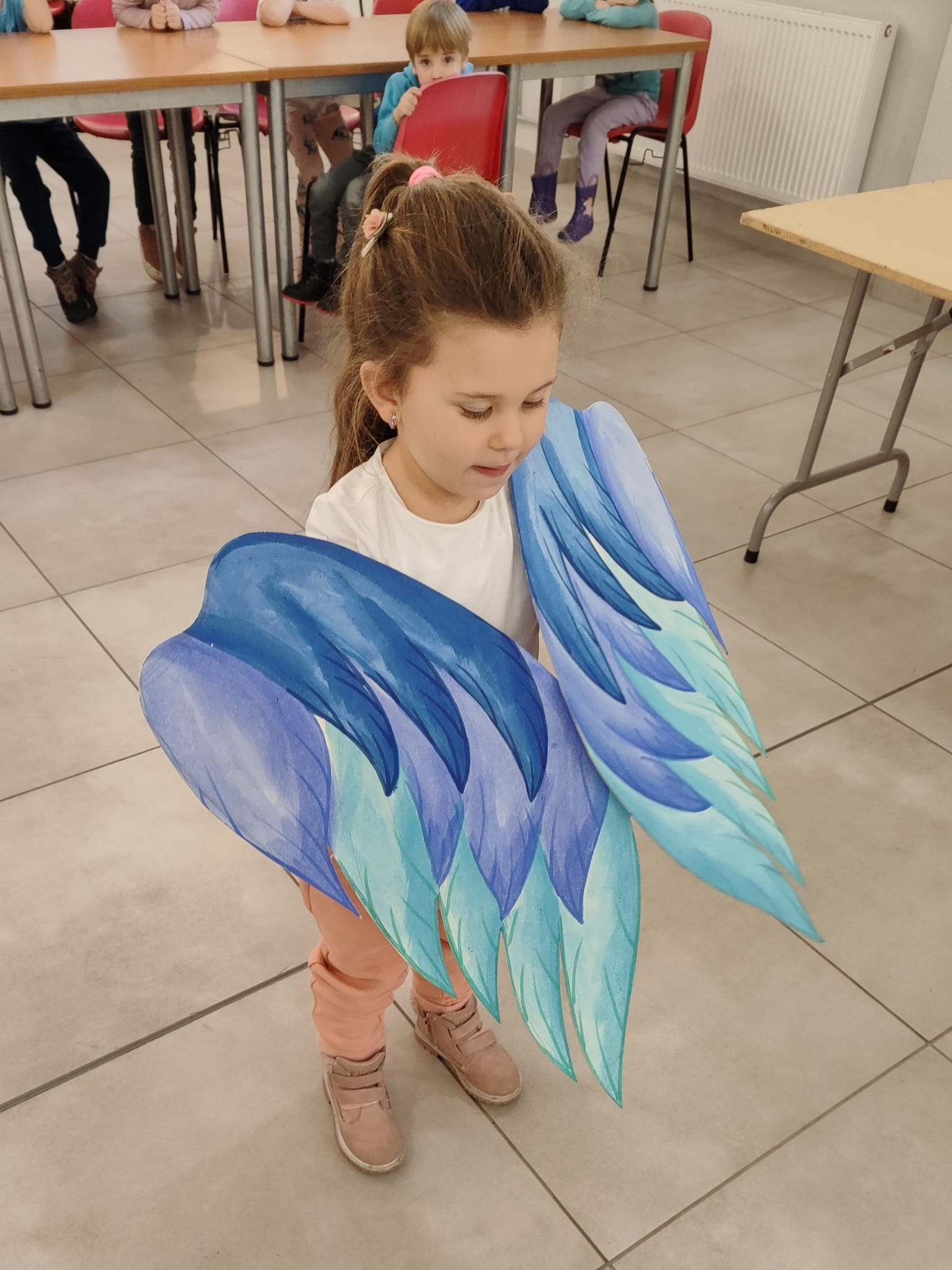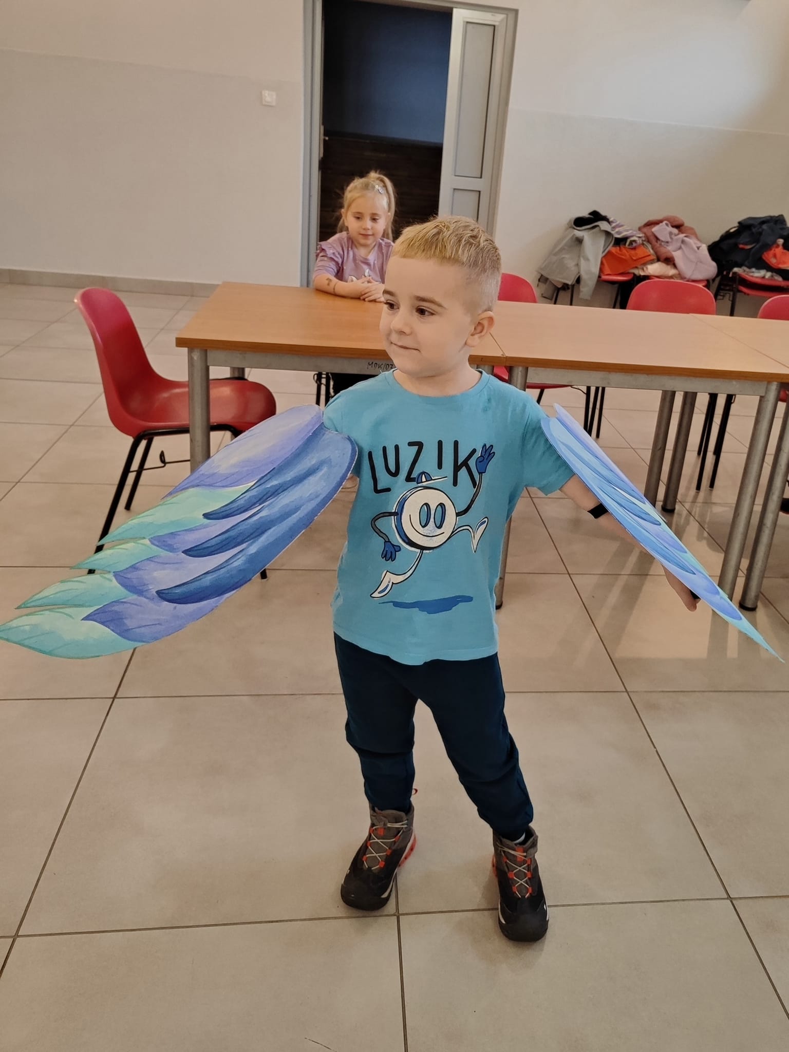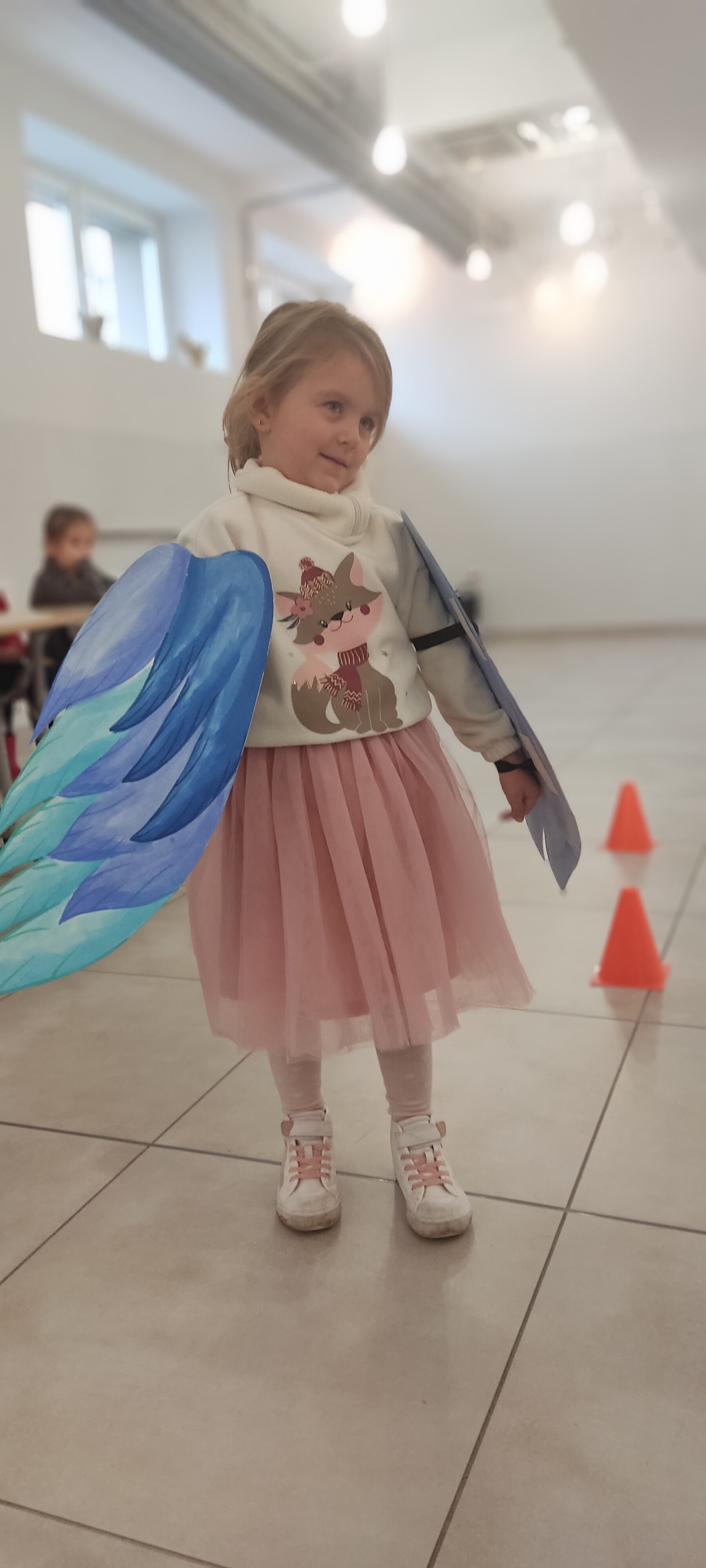 Na warsztatach dowiedziały się jakie ptaki odlatują do ciepłych krajów. Wysłuchały ciekawej bajki, odgadywały ptasie zagadki oraz miały okazję same poczuć się jak ptaki dzięki pięknym skrzydłom. Na koniec wykonały pracę plastyczną.