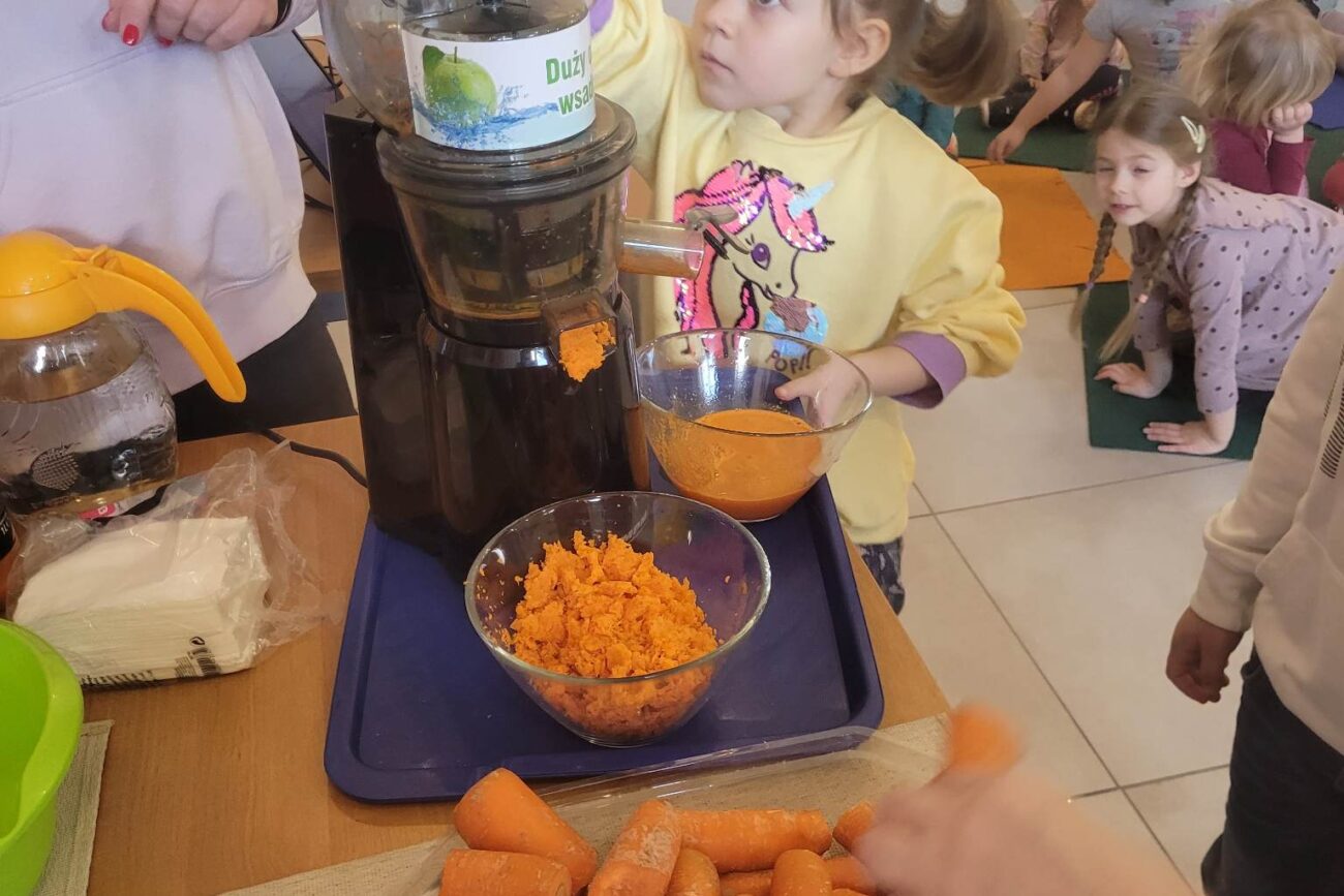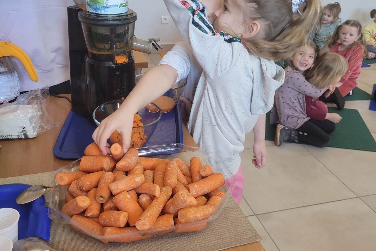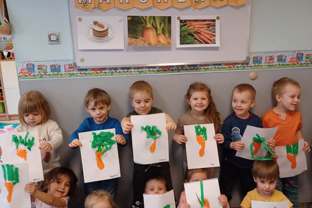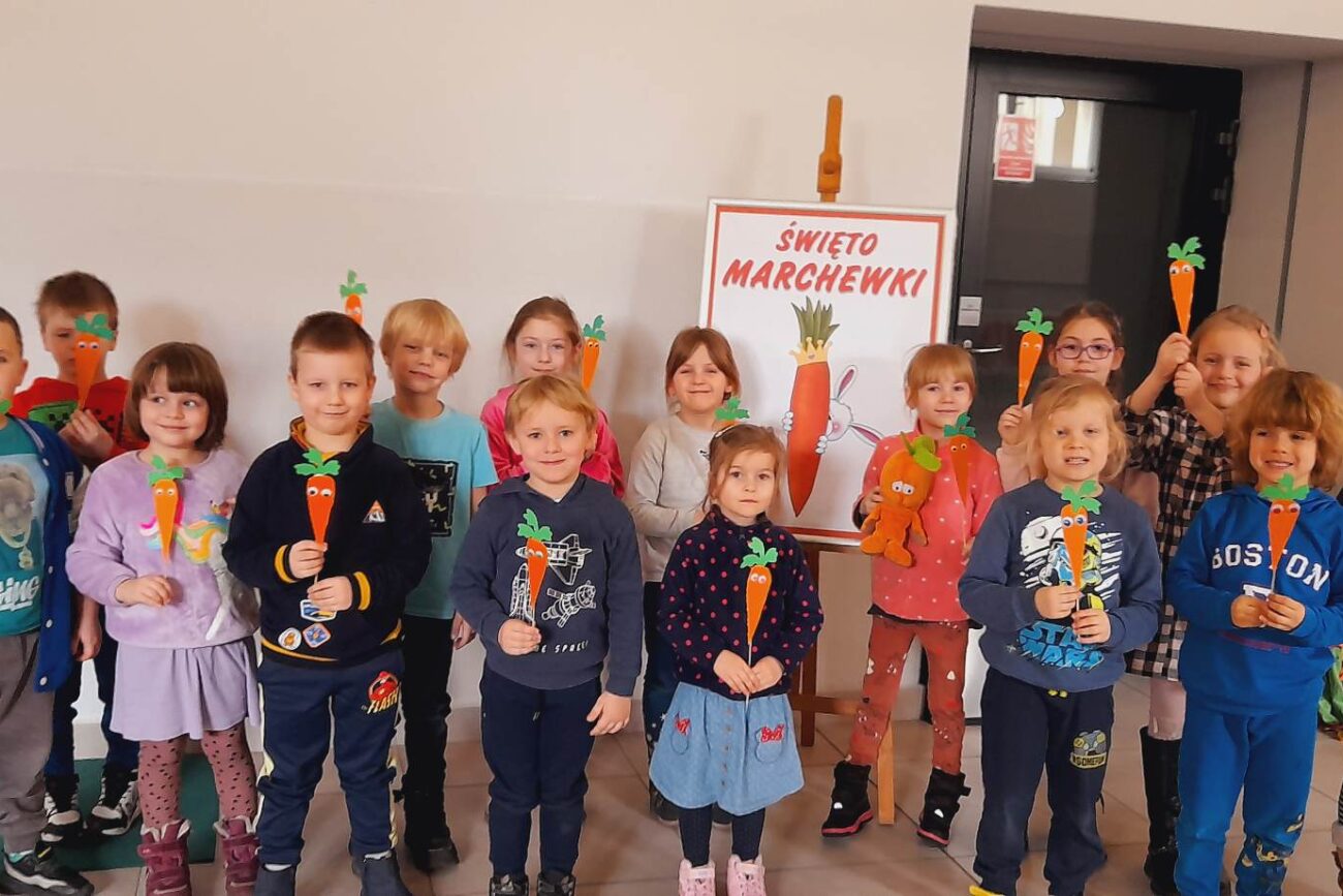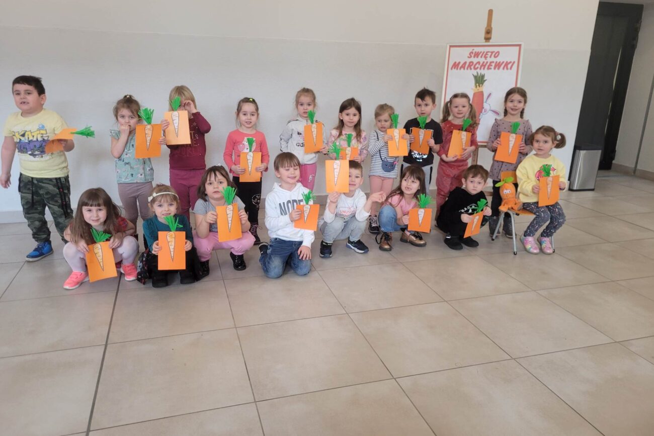 Dnia 03.04. oraz 04.04.2023 .grupa „Biedronki ” oraz grupa ” Motylki” uczestniczyła w zajęciach zorganizowanych przez MDK- Kazimierz Górniczy z okazji ” Dnia Marchewki”. Poprzez różnorodne zadania do wykonania przygotowane przez Panią z Biblioteki dzieci świetnie się bawiły, poznając przy tym wartości odżywcze marchewki. Słuchały piosenki: „Na marchewki urodziny”, a następnie wybierały i nazywały spośród warzyw tylko te, występujące w treści piosenki. Wykonywały zdrowy wyciskany sok marchwiowy i go degustowały, porównując sok naturalnie przygotowany z sokiem ze sklepu. Uczestniczyły w drużynowych zawodach na czas : „Marchewkowe pole”, gdzie miały zebrać jak najszybciej marchewki. Dużą frajdę sprawiła dzieciom zabawa integracyjna z wykorzystaniem chusty Klanza, gdzie miały za zadanie utrzymać jak najdłużej na jej powierzchni, „świeżaki”. Na koniec spotkania wykonały pracę plastyczną Grupa „Biedronki ” oraz ” Motylki” składa podziękowania Pani z Biblioteki za włożony wkład pracy i piękne przygotowanie zajęć oraz przybliżenie dzieciom tematyki zdrowotnej.