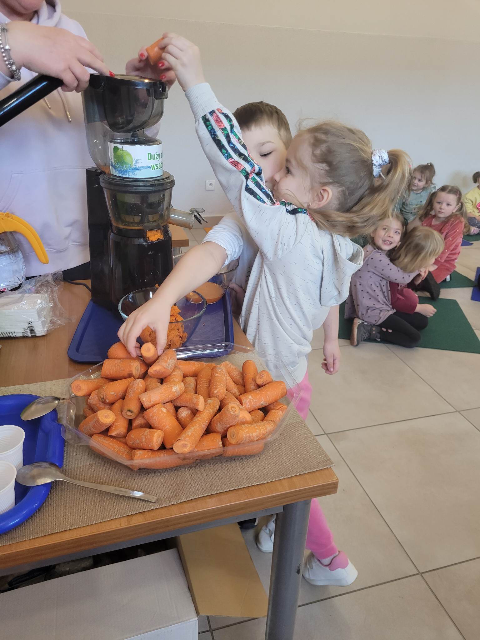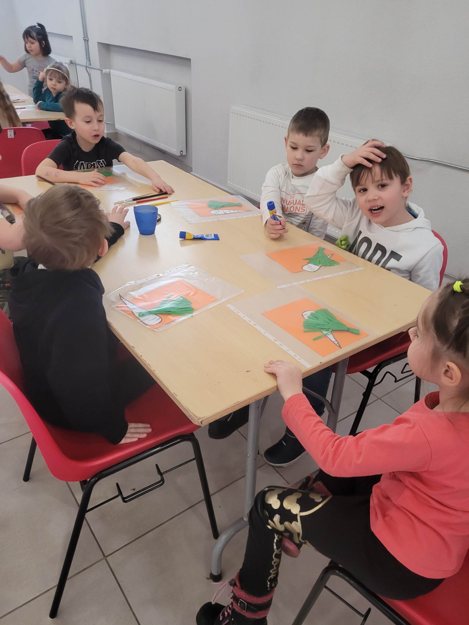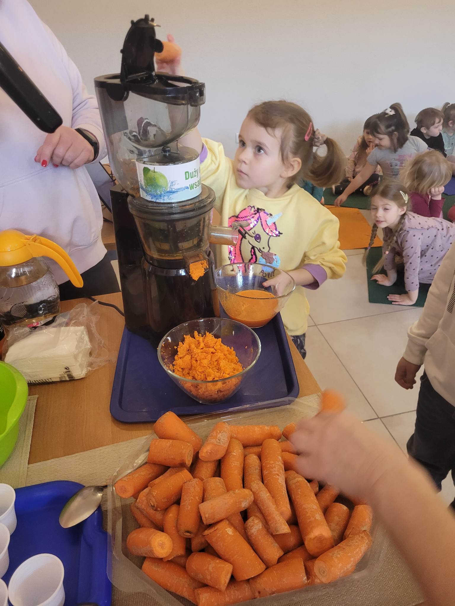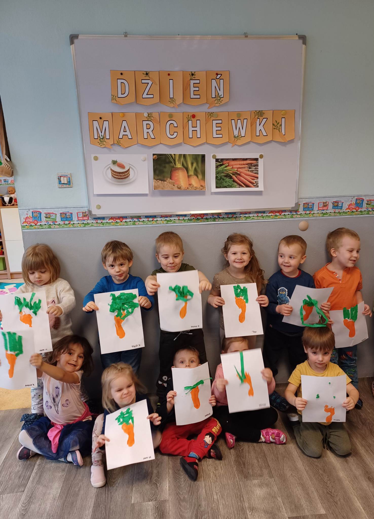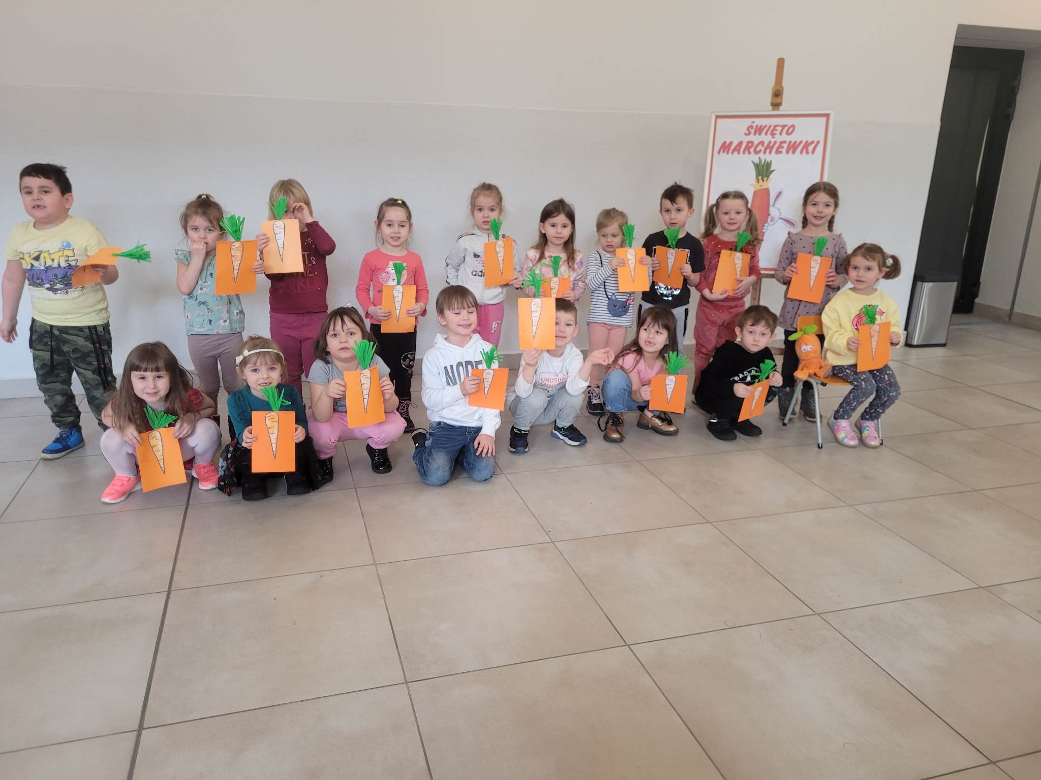 Dnia 03.04. oraz 04.04.2023 .grupa „Biedronki ” oraz grupa ” Motylki” uczestniczyła w zajęciach zorganizowanych przez MDK- Kazimierz Górniczy z okazji ” Dnia Marchewki”. Poprzez różnorodne zadania do wykonania przygotowane przez Panią z Biblioteki dzieci świetnie się bawiły, poznając przy tym wartości odżywcze marchewki. Słuchały piosenki: „Na marchewki urodziny”, a następnie wybierały i nazywały spośród warzyw tylko te, występujące w treści piosenki. Wykonywały zdrowy wyciskany sok marchwiowy i go degustowały, porównując sok naturalnie przygotowany z sokiem ze sklepu. Uczestniczyły w drużynowych zawodach na czas : „Marchewkowe pole”, gdzie miały zebrać jak najszybciej marchewki. Dużą frajdę sprawiła dzieciom zabawa integracyjna z wykorzystaniem chusty Klanza, gdzie miały za zadanie utrzymać jak najdłużej na jej powierzchni, „świeżaki”. Na koniec spotkania wykonały pracę plastyczną Grupa „Biedronki ” oraz ” Motylki” składa podziękowania Pani z Biblioteki za włożony wkład pracy i piękne przygotowanie zajęć oraz przybliżenie dzieciom tematyki zdrowotnej.