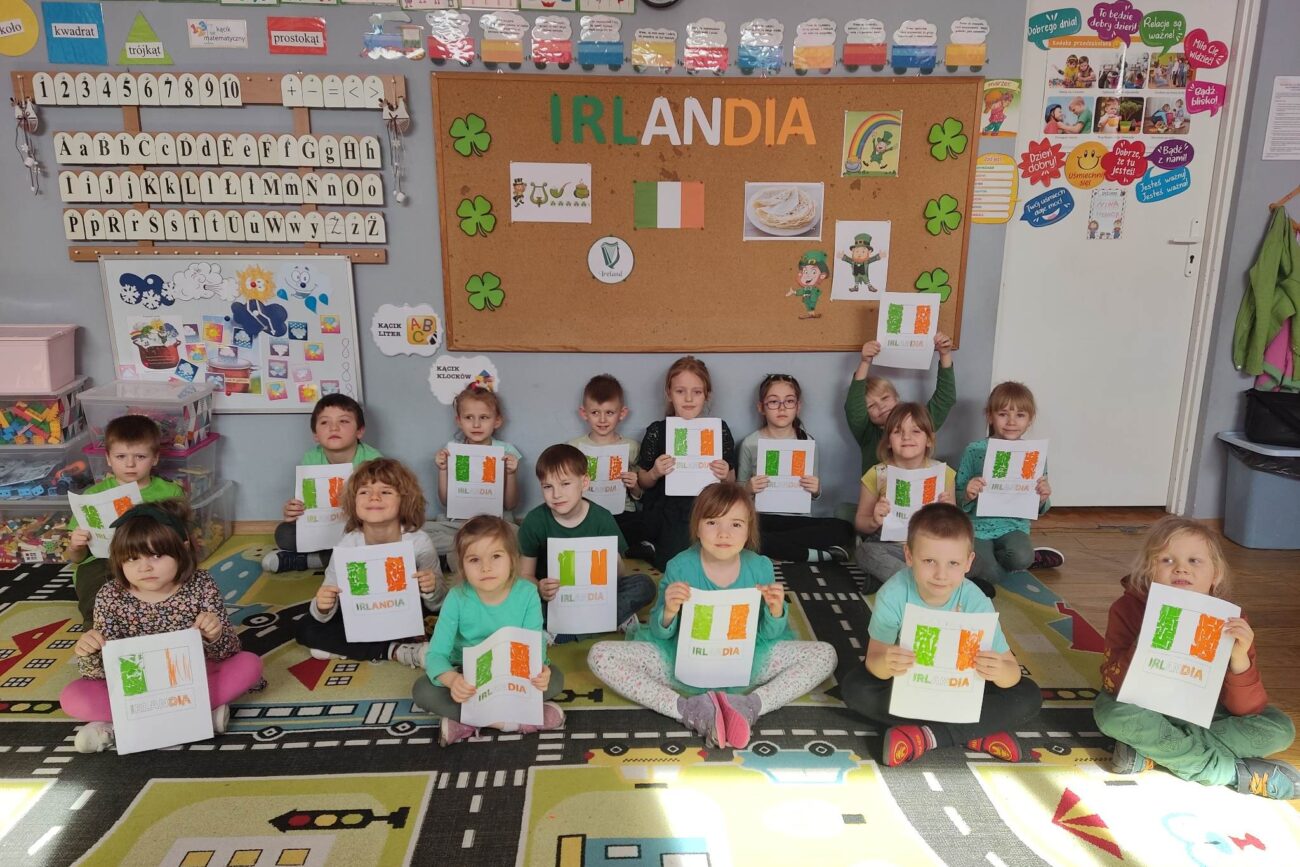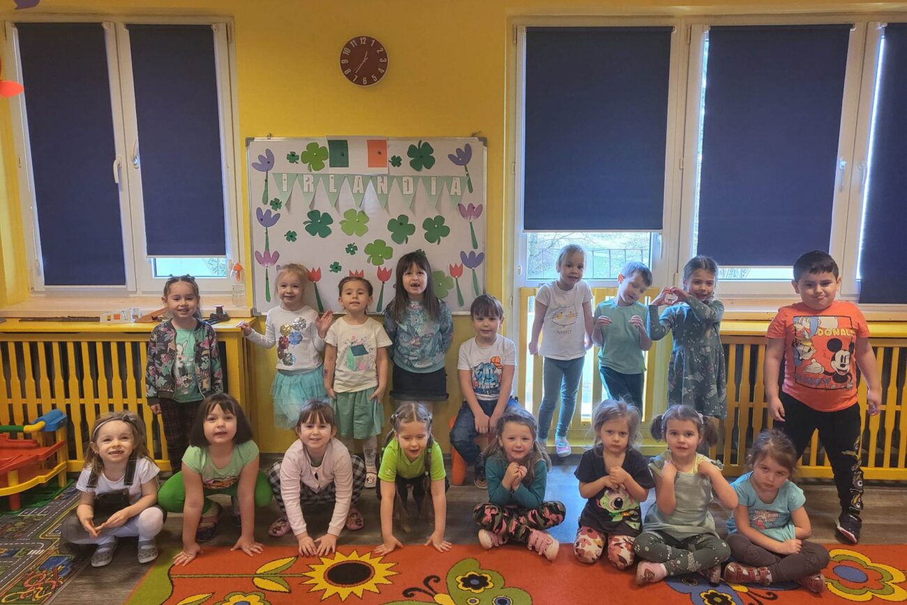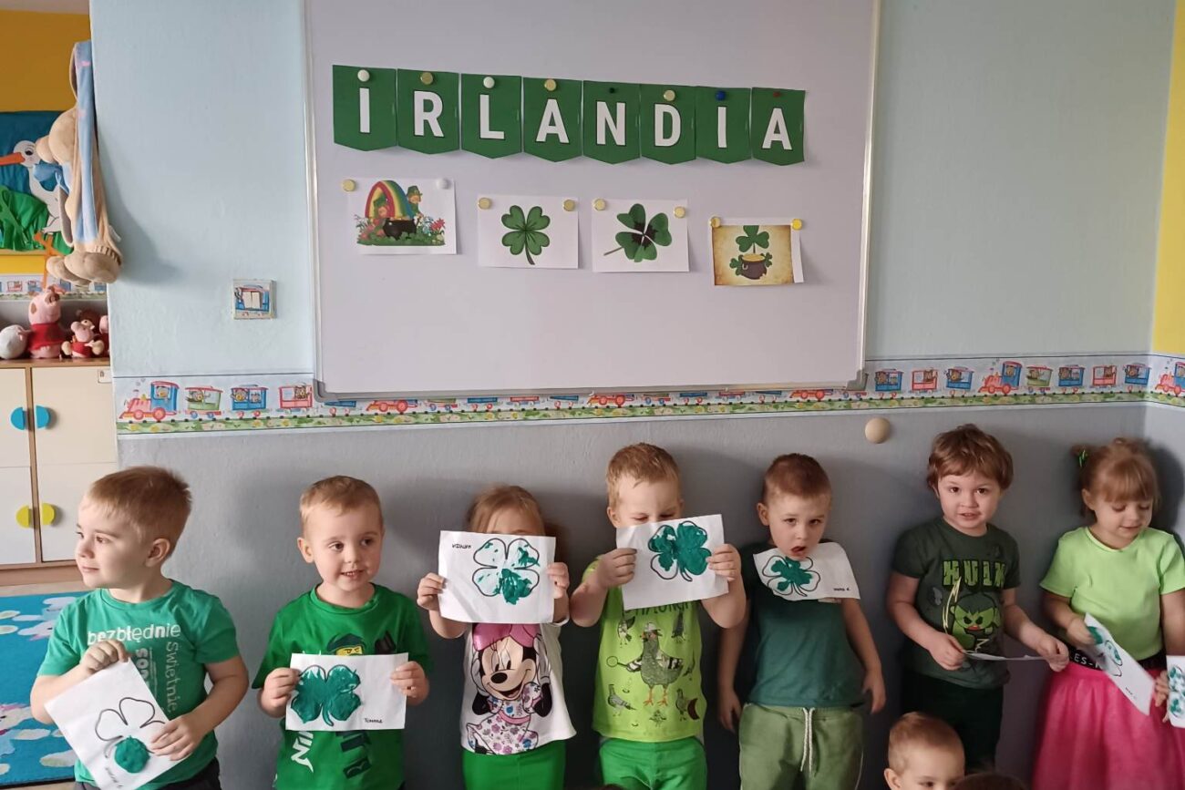 W dniu 17.03.2023r. nasze Przedszkolaki poznały kolejny kraj Europejski – Irlandię. Zaponzały się z wyglądem flagi, nazwę stolicy, położenie na mapie, a także wysłuchały hymnu. Obowiązującym kolorem tego dnia była zieleń, nawiązująca do trawiastego krajobrazu Irlandii i symbolizująca koniczynę. Dzieci poznały małego skrzata Irlandii o imieniu Leprechaun, który, jak głosi legenda, ukrywa złoto na końcu tęczy. Przedszkolaki próbowały zatańczyć irlandzki taniec oraz pobawiły się w zabawę „naleśnik”. W Irlandii jednym z ulubionych słodkich przysmaków jest naleśnik, dlatego Pani Iwonka dla Motylków i Misiów przygotowała na obiad przepyszne naleśniki 😉
