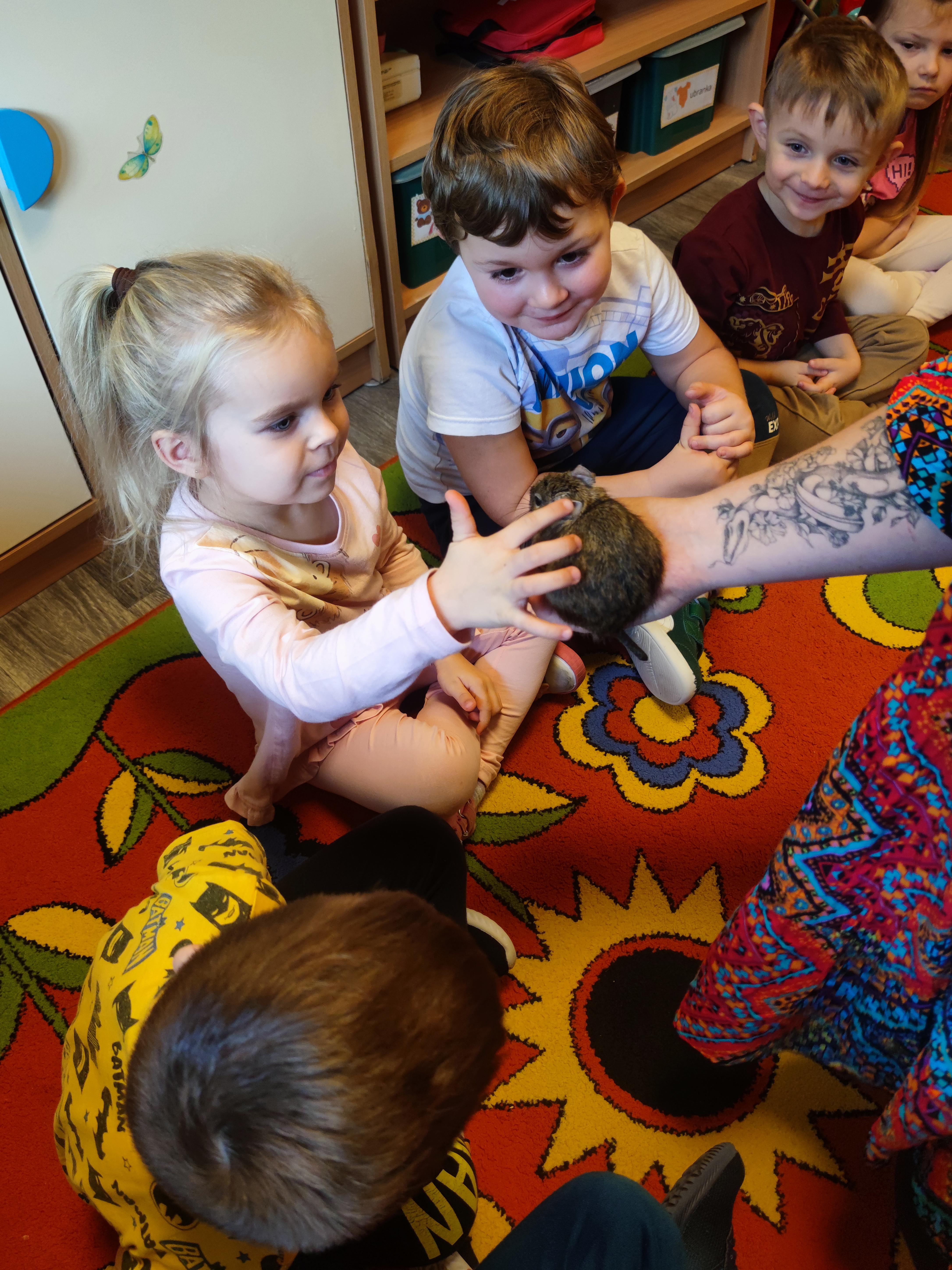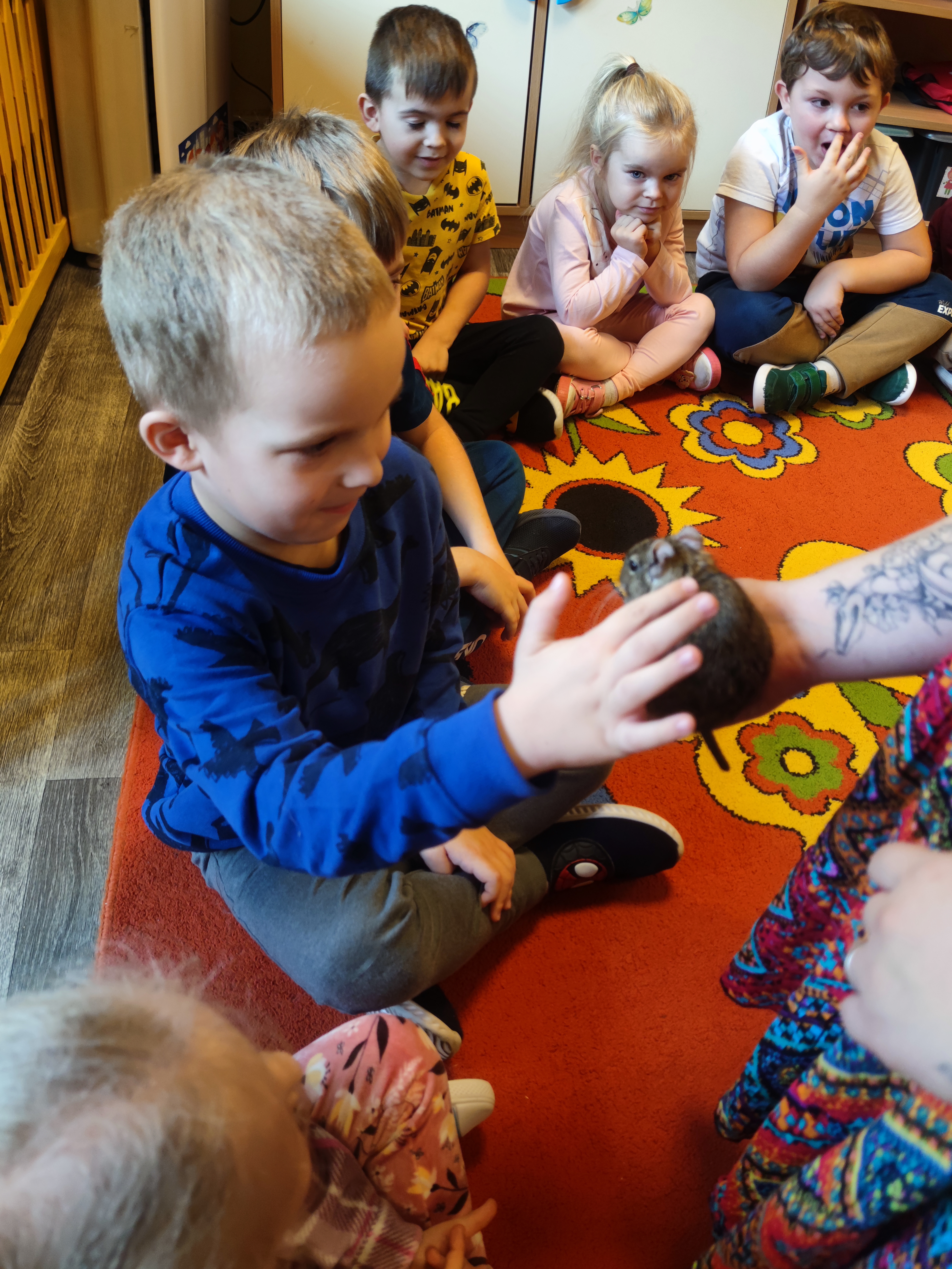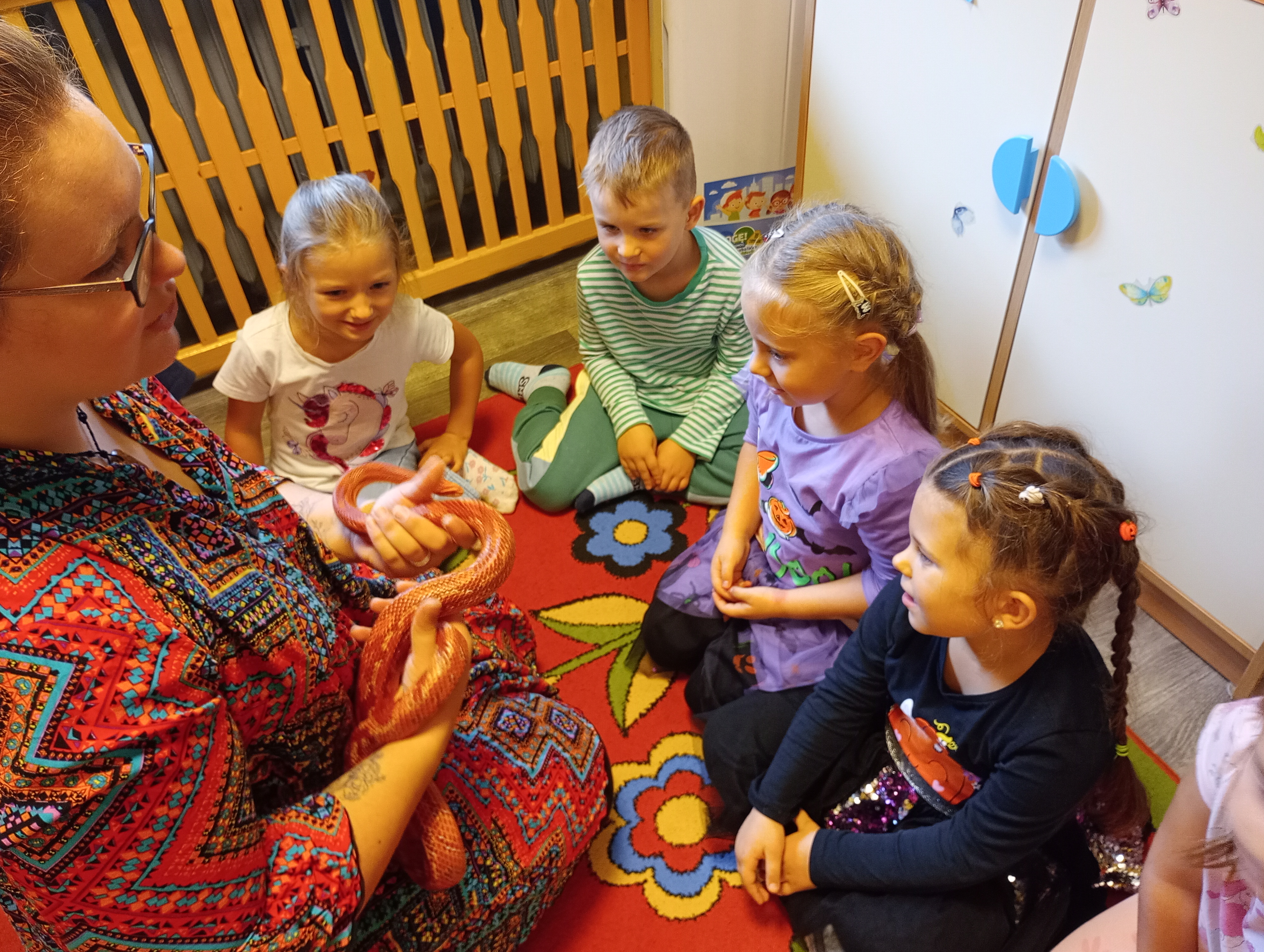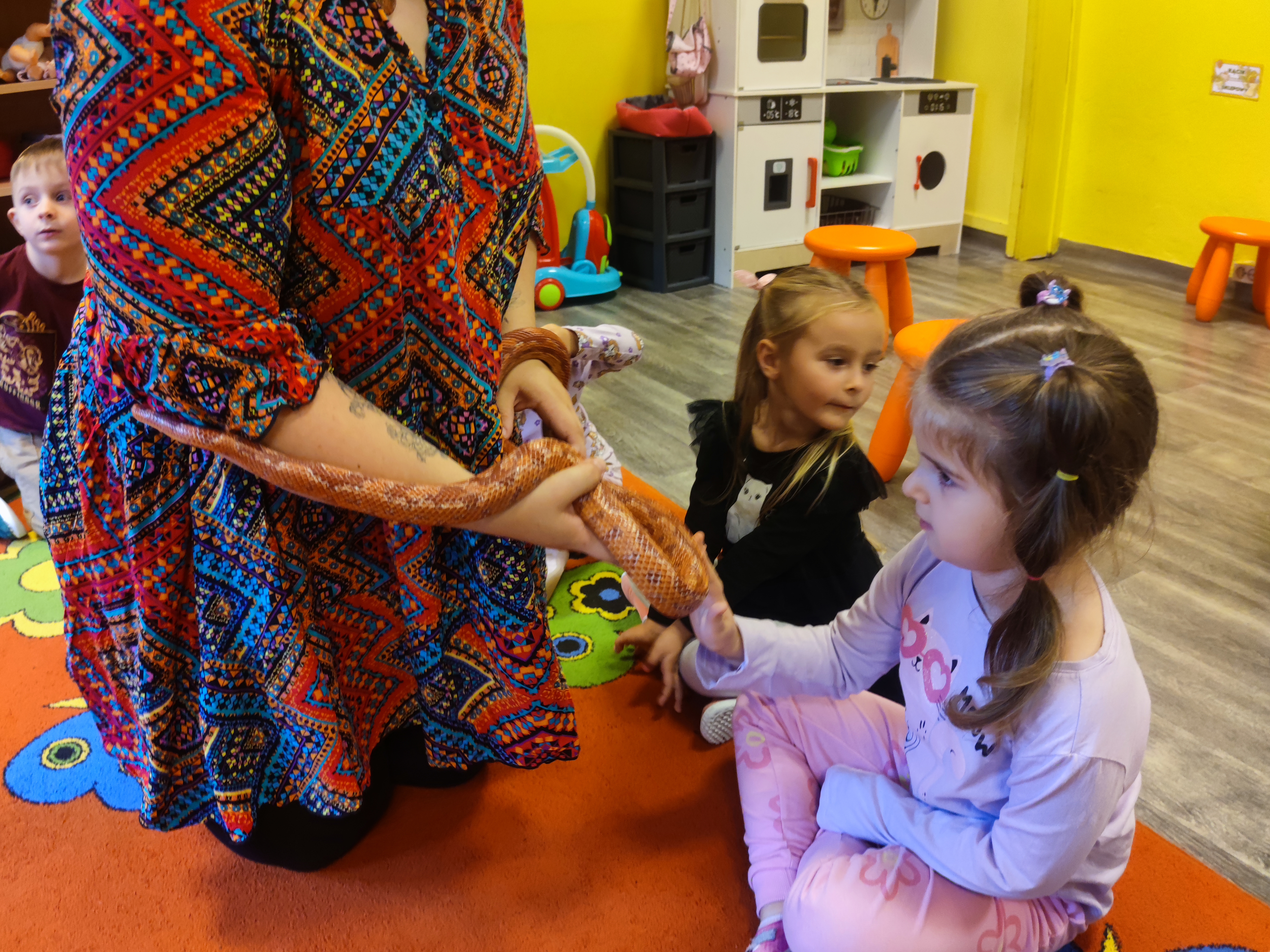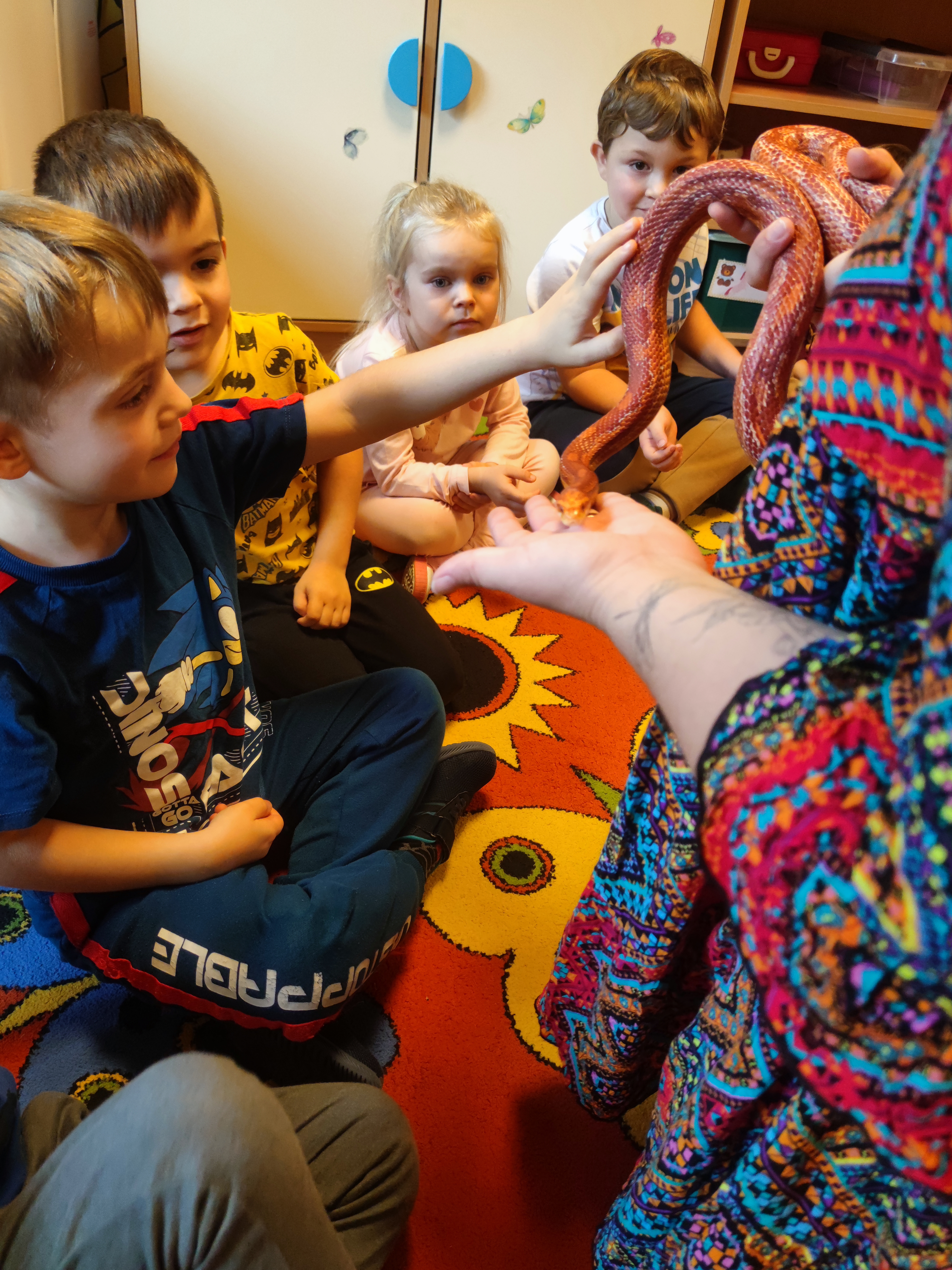 31 października nasze przedszkolaki miały okazję uczestniczyć w niecodziennych zajęciach. Dzięki firmie Walabia – Żywa Edukacja, w naszym przedszkolu mogliśmy gościć niecodziennych gości, a między innymi: Krzysia – małą i zwinną koszatniczkę o sporych i pozbawionych futerka uszkach, Jurka – malutkiego jeża o kujących, szarobrunatnych kolcach, Zbożówkę – wijącego się węża oraz Wiolę – powolnego żółwia. Pod czujnym okiem prowadzących każde dziecko mogło z bliska zobaczyć, dotknąć i głaskać do woli te przesympatyczne zwierzątka. Nasze przedszkolaki miały też okazje poznać wiele ciekawostek o życiu i upodobaniach tych niecodziennych gości.