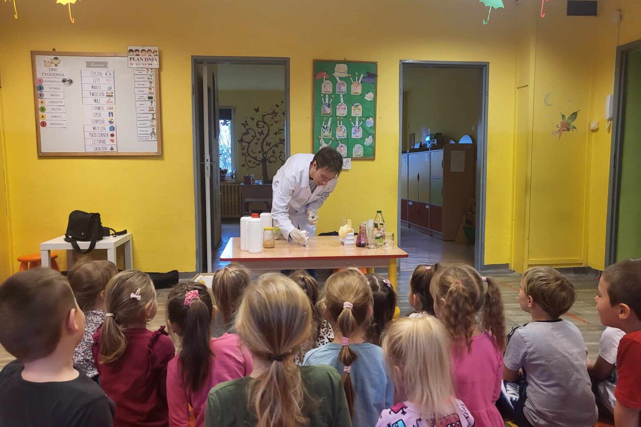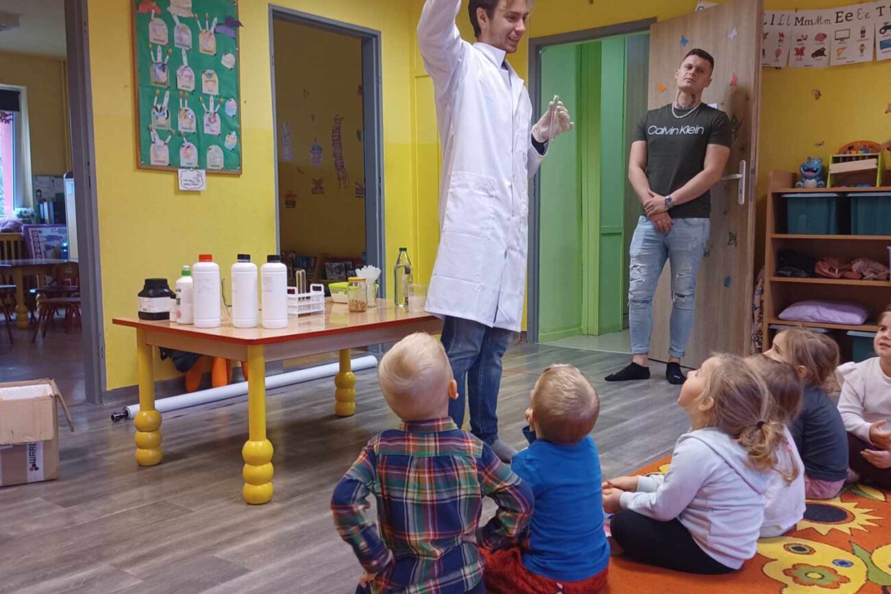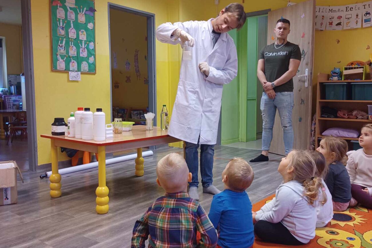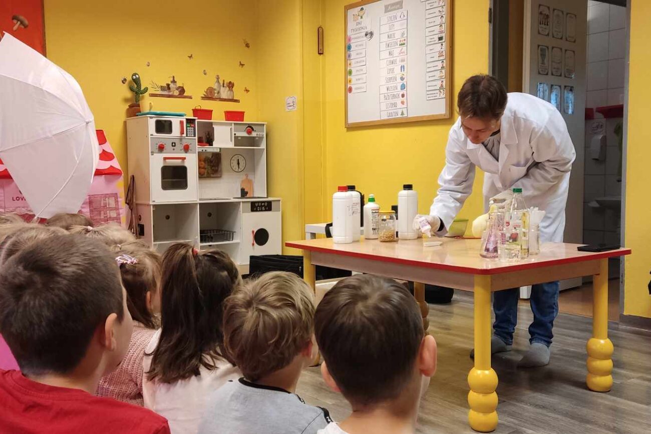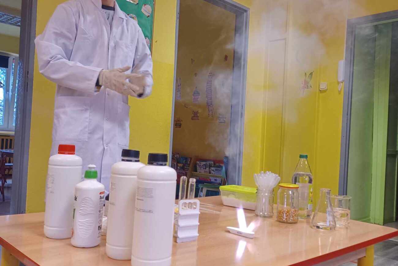 Przedszkolaki z zafascynowaniem przyglądały się przeprowadzanym eksperymentom z wykorzystaniem mniej lub bardziej dostępnych składników, m.in. gliceryny, płynu do mycia naczyń, wody utlenionej czy sody oczyszczonej. Dowiedziały się, w jaki sposób wykonać pastę do zębów dla słonia, co zrobić, by ziarenka kukurydzy zaczęły tańczyć, a także jak można rozpalić ognisko bez patyków i zapałek. Obserwowały i przewidywały, jaki kolor powstanie z połączenia dwóch bezbarwnych cieczy. Poznały wyposażenie chemika, w tym jego środki ochronne (tj. fartuch, rękawiczki) oraz nazwy niezbędnych mu naczyń i przyborów.