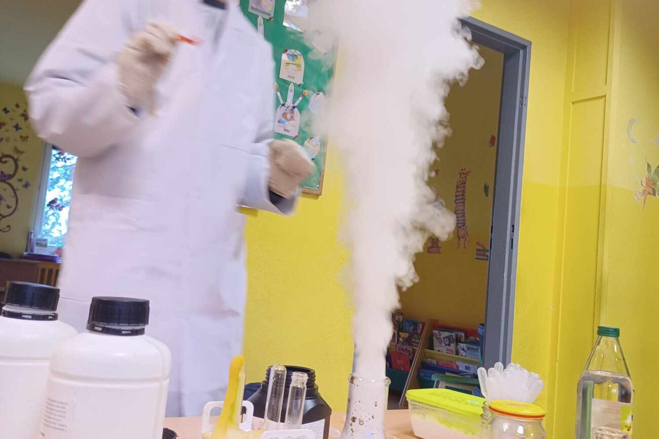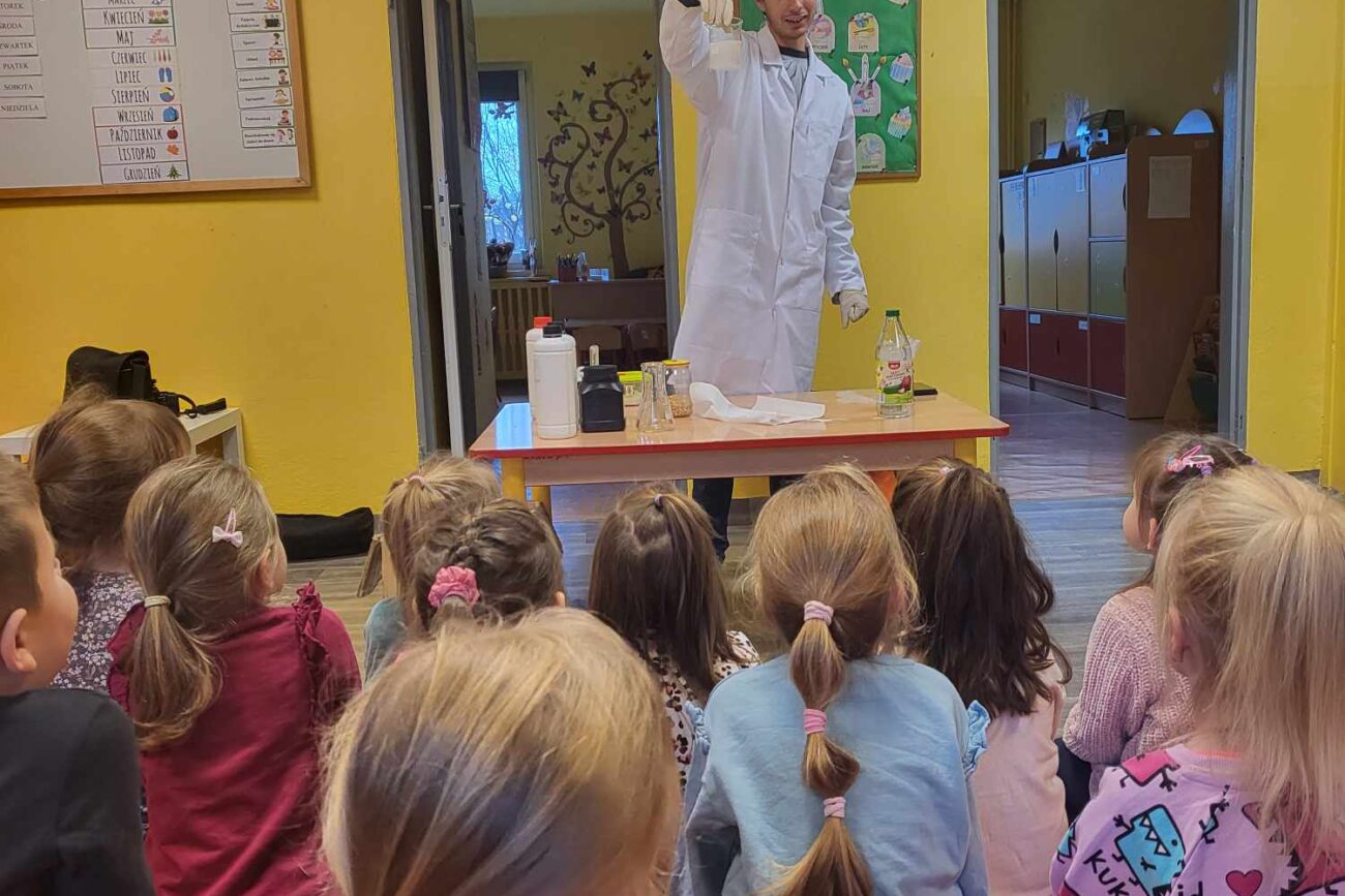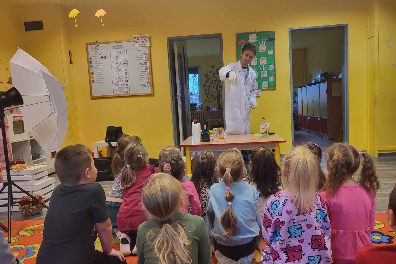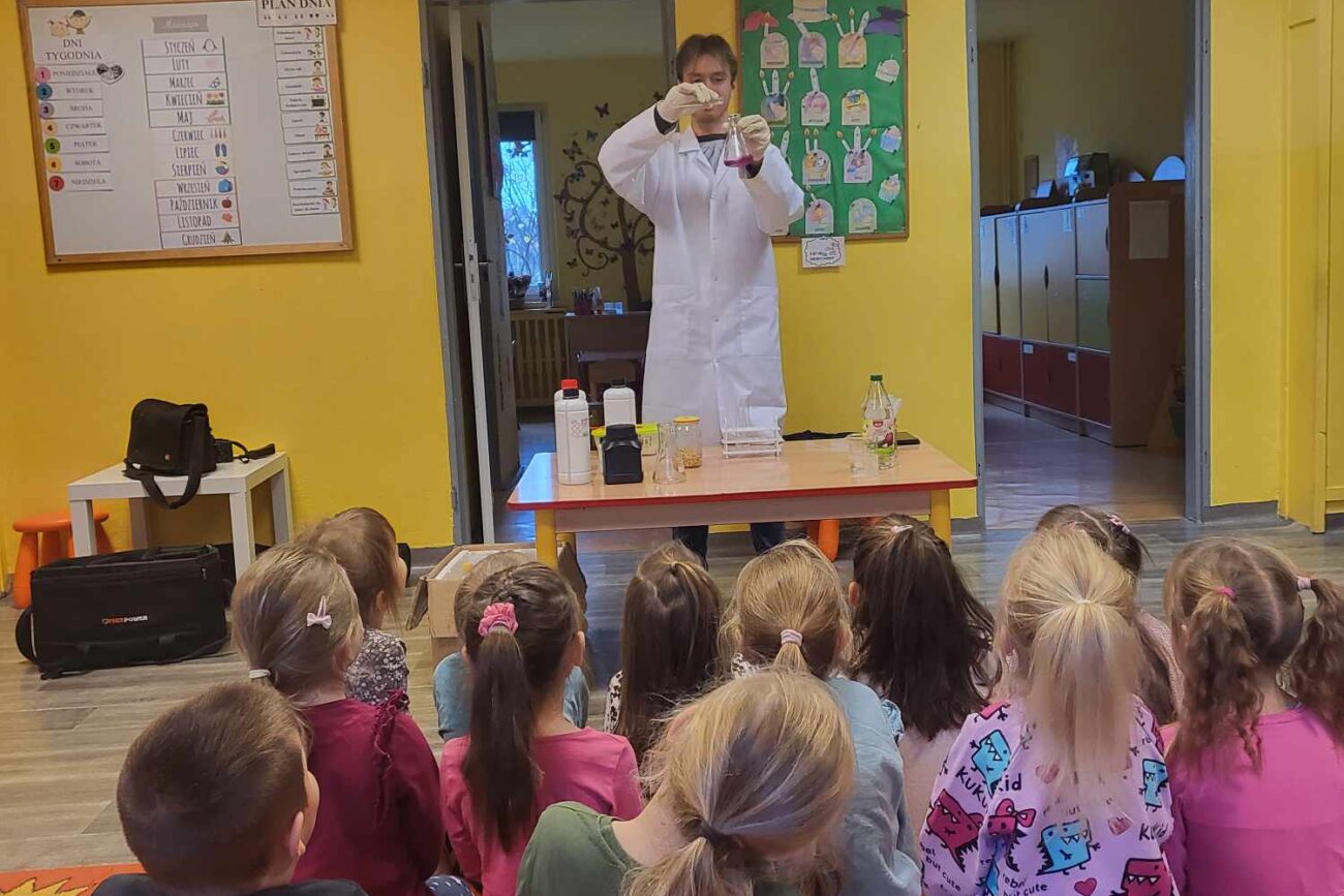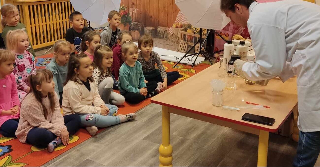 Przedszkolaki z zafascynowaniem przyglądały się przeprowadzanym eksperymentom z wykorzystaniem mniej lub bardziej dostępnych składników, m.in. gliceryny, płynu do mycia naczyń, wody utlenionej czy sody oczyszczonej. Dowiedziały się, w jaki sposób wykonać pastę do zębów dla słonia, co zrobić, by ziarenka kukurydzy zaczęły tańczyć, a także jak można rozpalić ognisko bez patyków i zapałek. Obserwowały i przewidywały, jaki kolor powstanie z połączenia dwóch bezbarwnych cieczy. Poznały wyposażenie chemika, w tym jego środki ochronne (tj. fartuch, rękawiczki) oraz nazwy niezbędnych mu naczyń i przyborów.