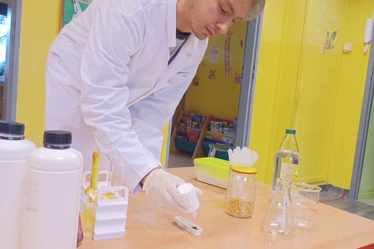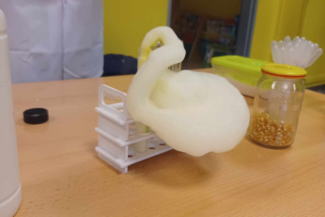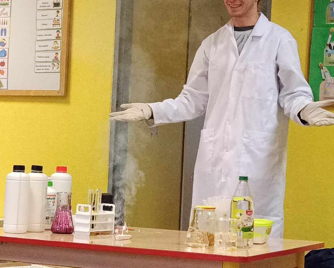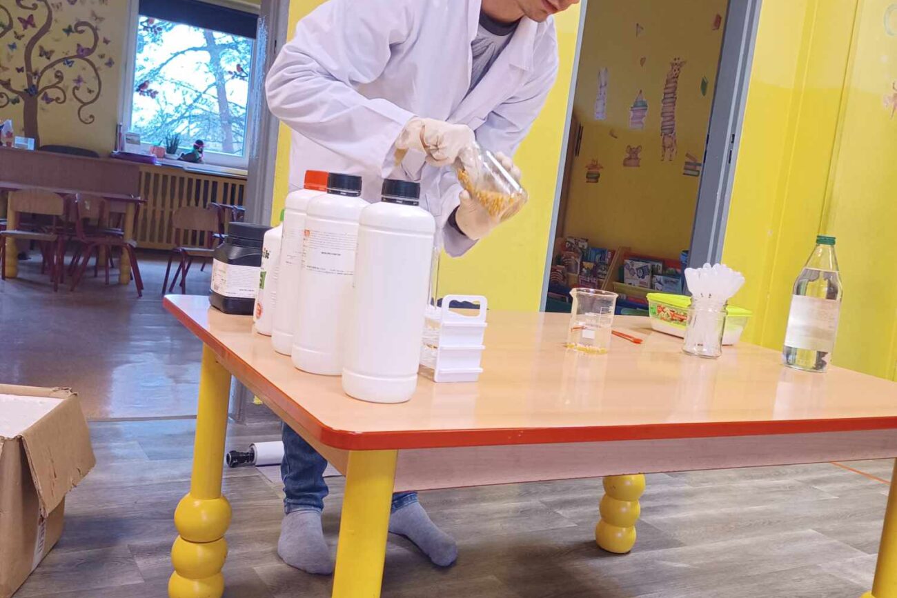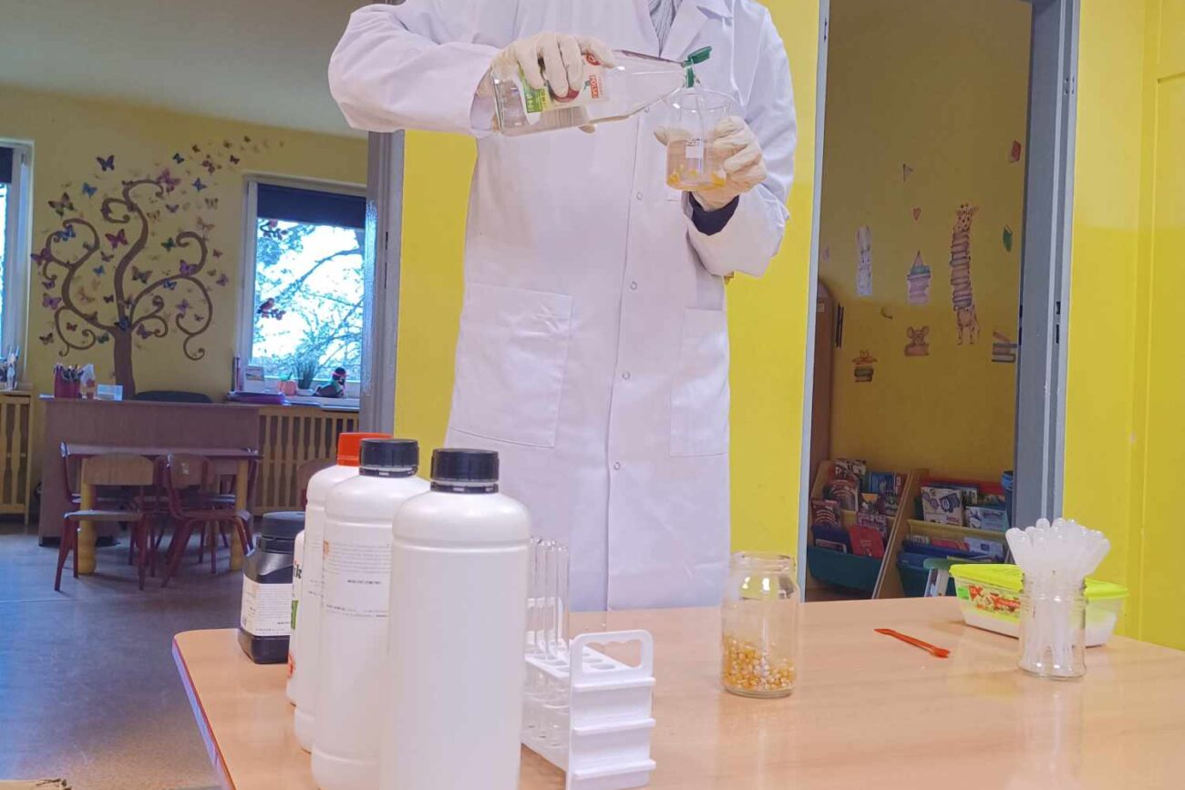 Przedszkolaki z zafascynowaniem przyglądały się przeprowadzanym eksperymentom z wykorzystaniem mniej lub bardziej dostępnych składników, m.in. gliceryny, płynu do mycia naczyń, wody utlenionej czy sody oczyszczonej. Dowiedziały się, w jaki sposób wykonać pastę do zębów dla słonia, co zrobić, by ziarenka kukurydzy zaczęły tańczyć, a także jak można rozpalić ognisko bez patyków i zapałek. Obserwowały i przewidywały, jaki kolor powstanie z połączenia dwóch bezbarwnych cieczy. Poznały wyposażenie chemika, w tym jego środki ochronne (tj. fartuch, rękawiczki) oraz nazwy niezbędnych mu naczyń i przyborów.