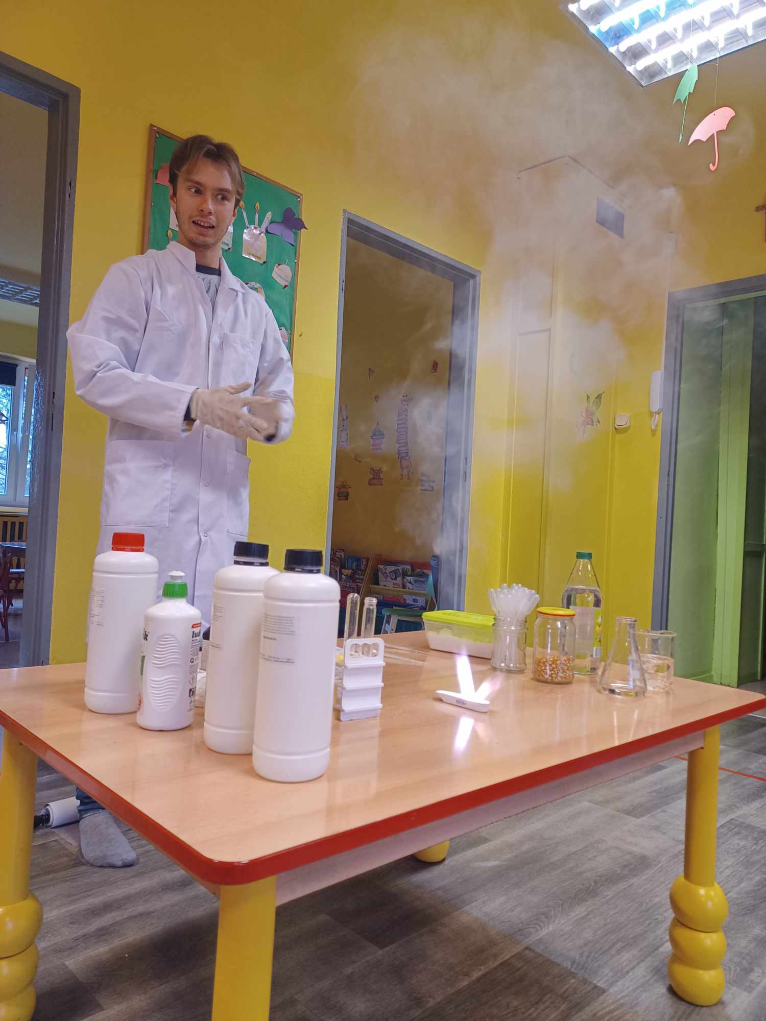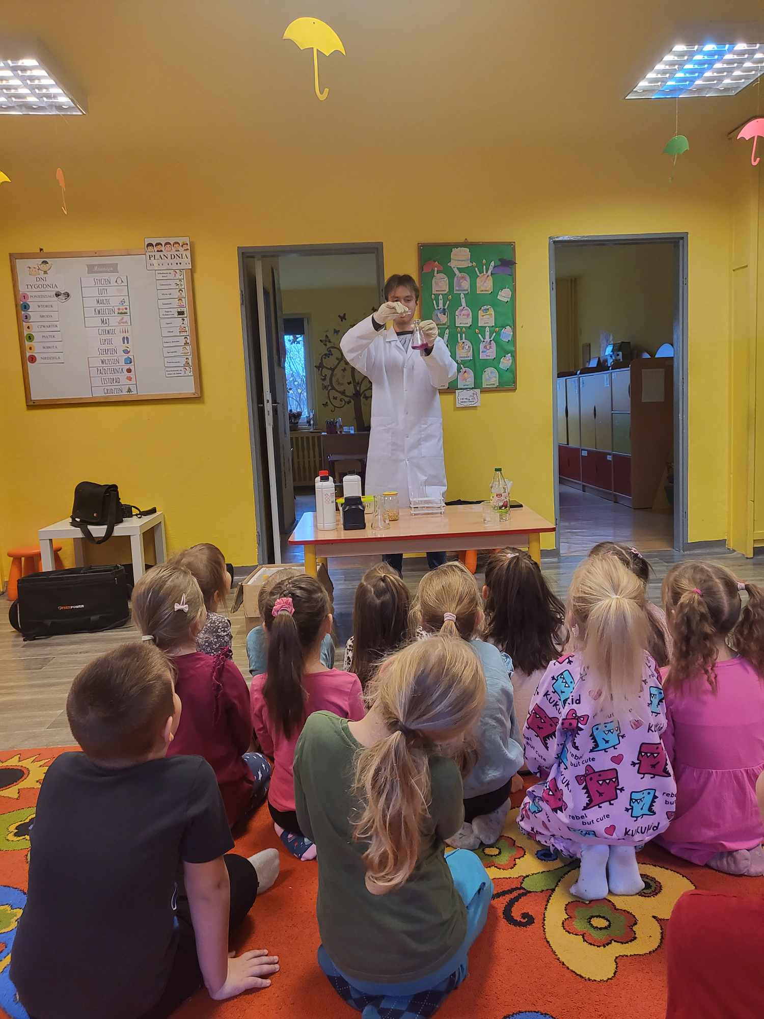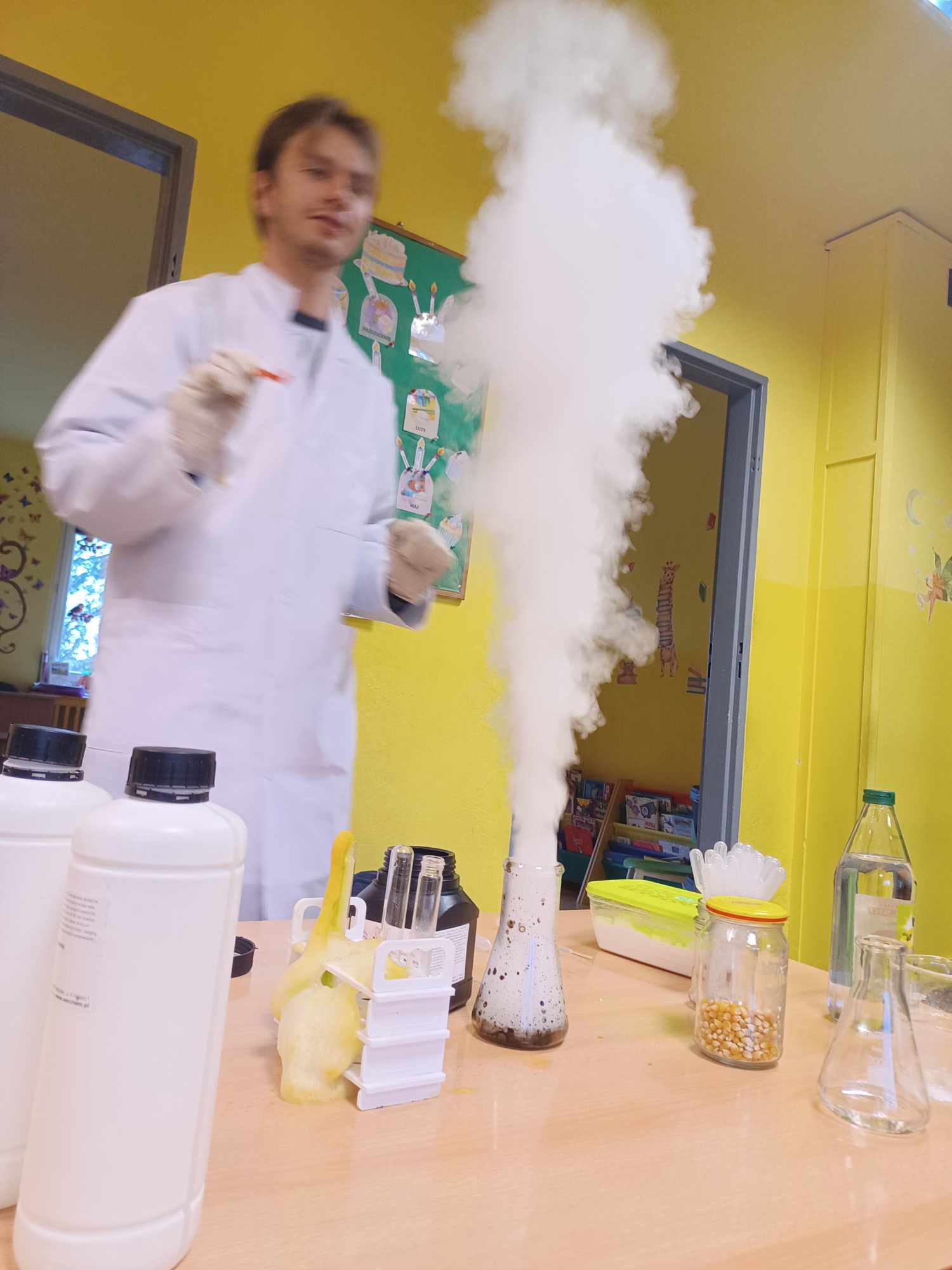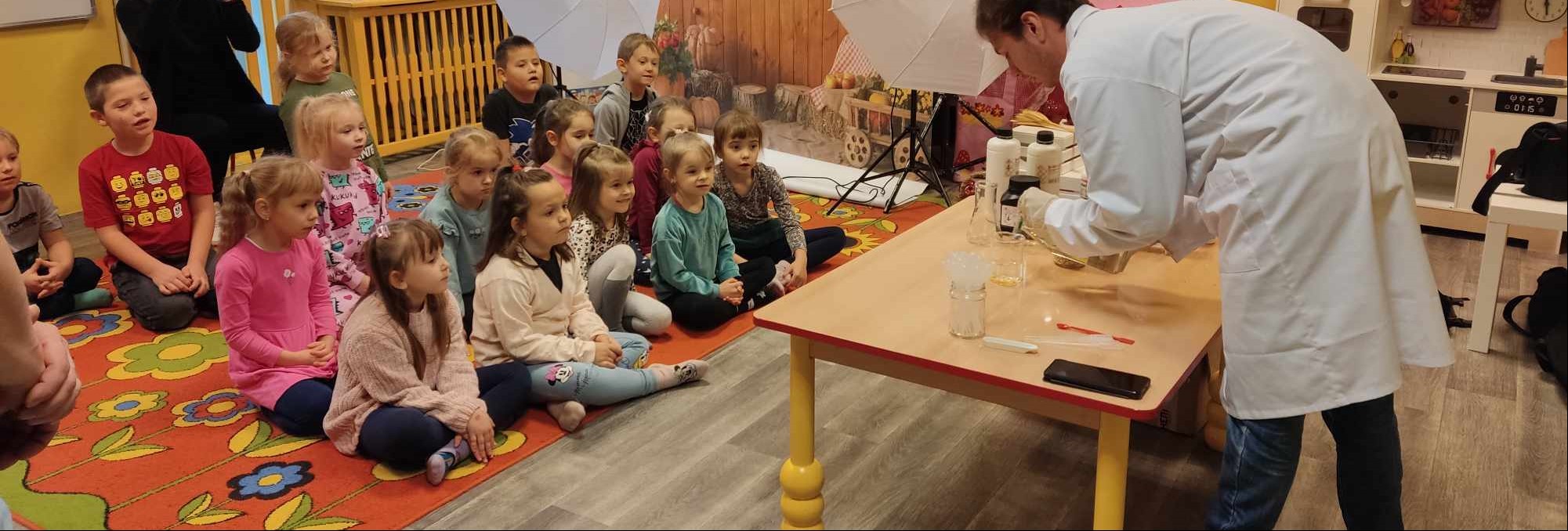 Przedszkolaki z zafascynowaniem przyglądały się przeprowadzanym eksperymentom z wykorzystaniem mniej lub bardziej dostępnych składników, m.in. gliceryny, płynu do mycia naczyń, wody utlenionej czy sody oczyszczonej. Dowiedziały się, w jaki sposób wykonać pastę do zębów dla słonia, co zrobić, by ziarenka kukurydzy zaczęły tańczyć, a także jak można rozpalić ognisko bez patyków i zapałek. Obserwowały i przewidywały, jaki kolor powstanie z połączenia dwóch bezbarwnych cieczy. Poznały wyposażenie chemika, w tym jego środki ochronne (tj. fartuch, rękawiczki) oraz nazwy niezbędnych mu naczyń i przyborów.