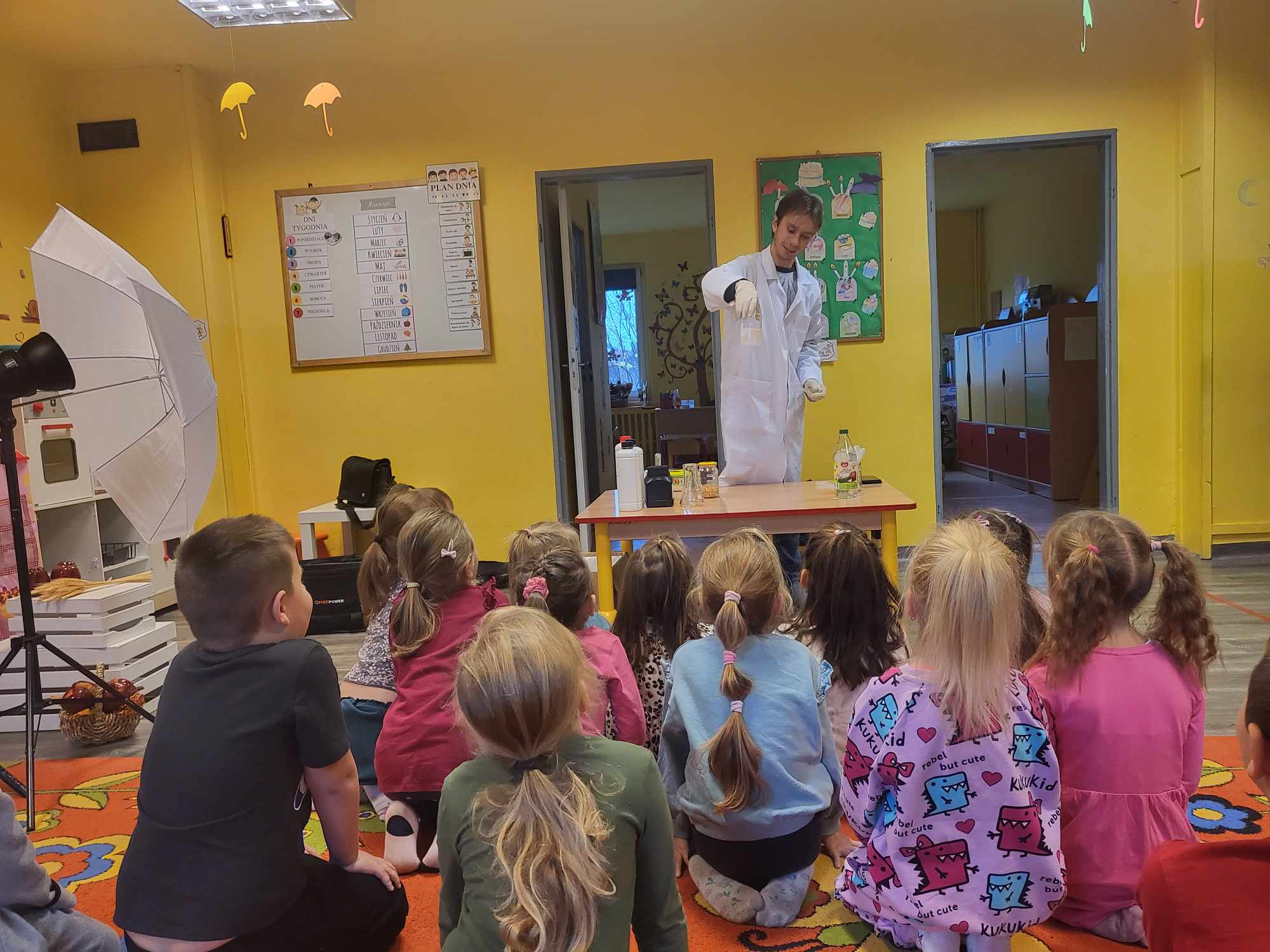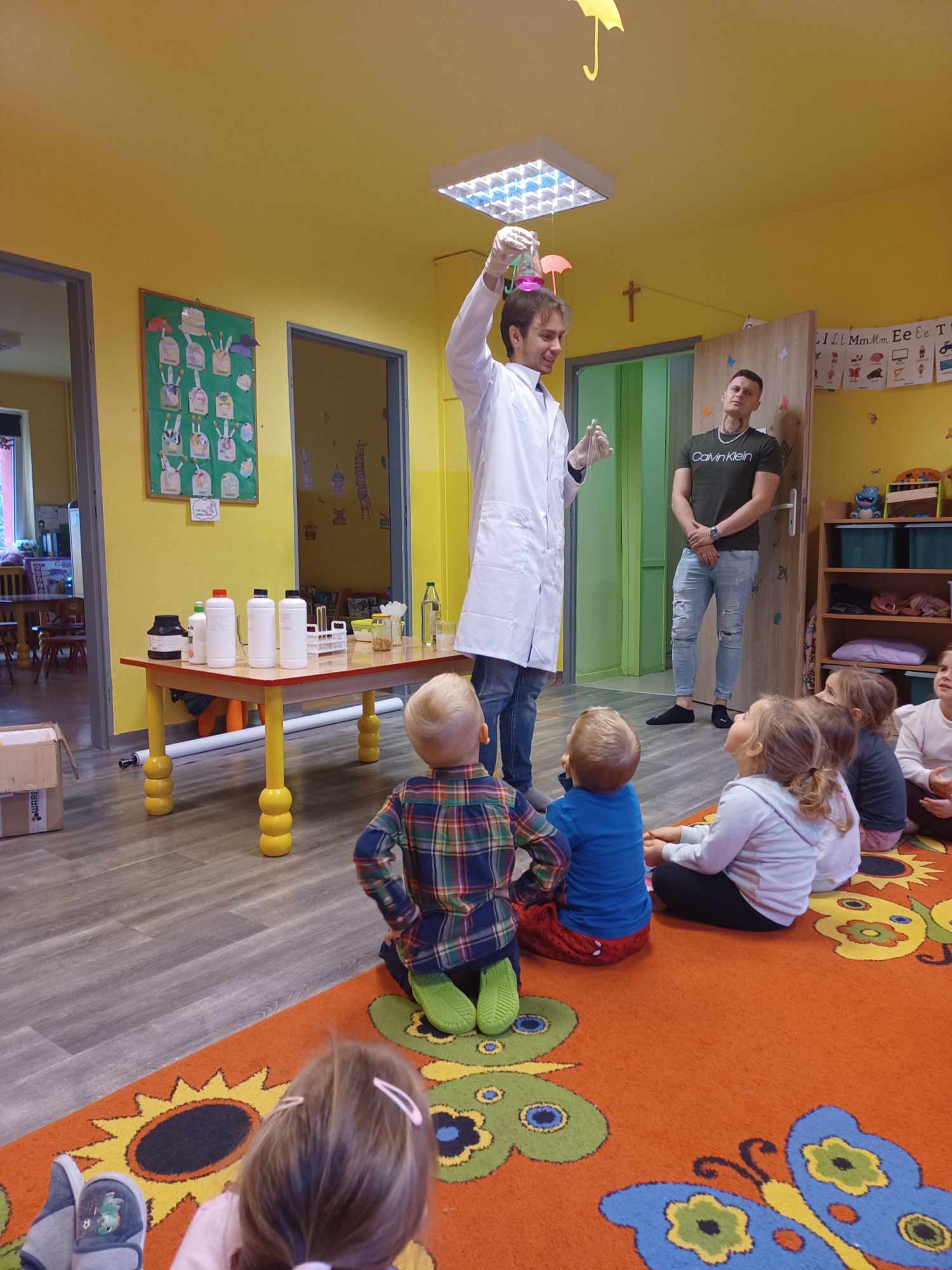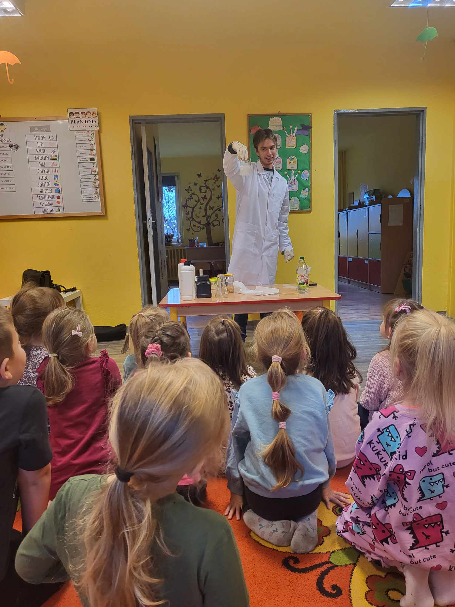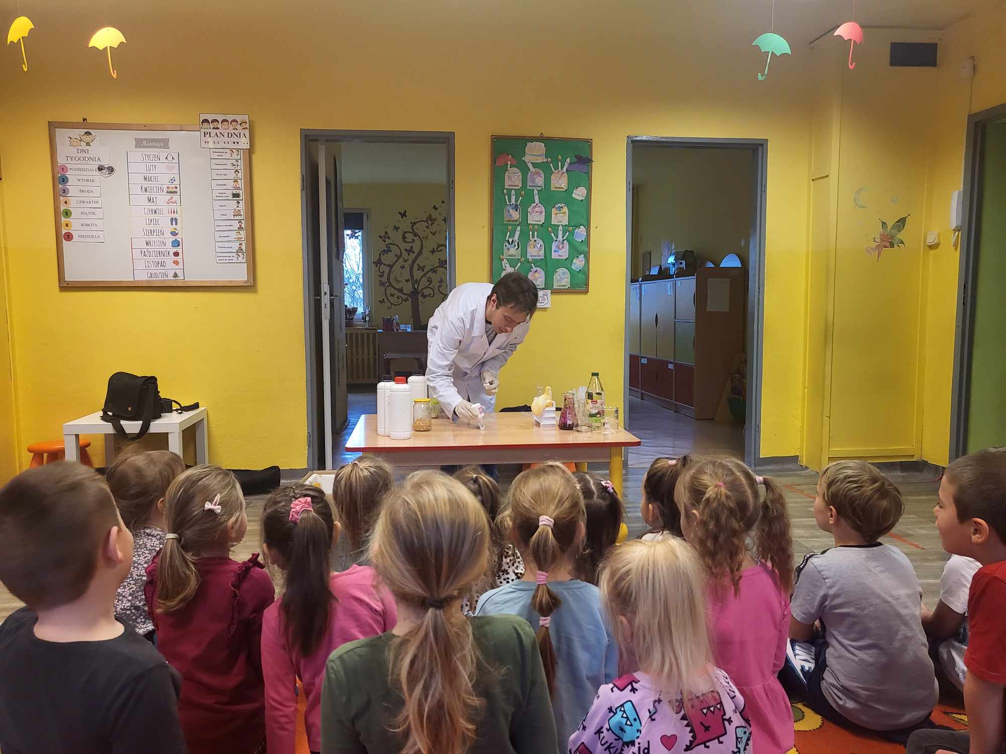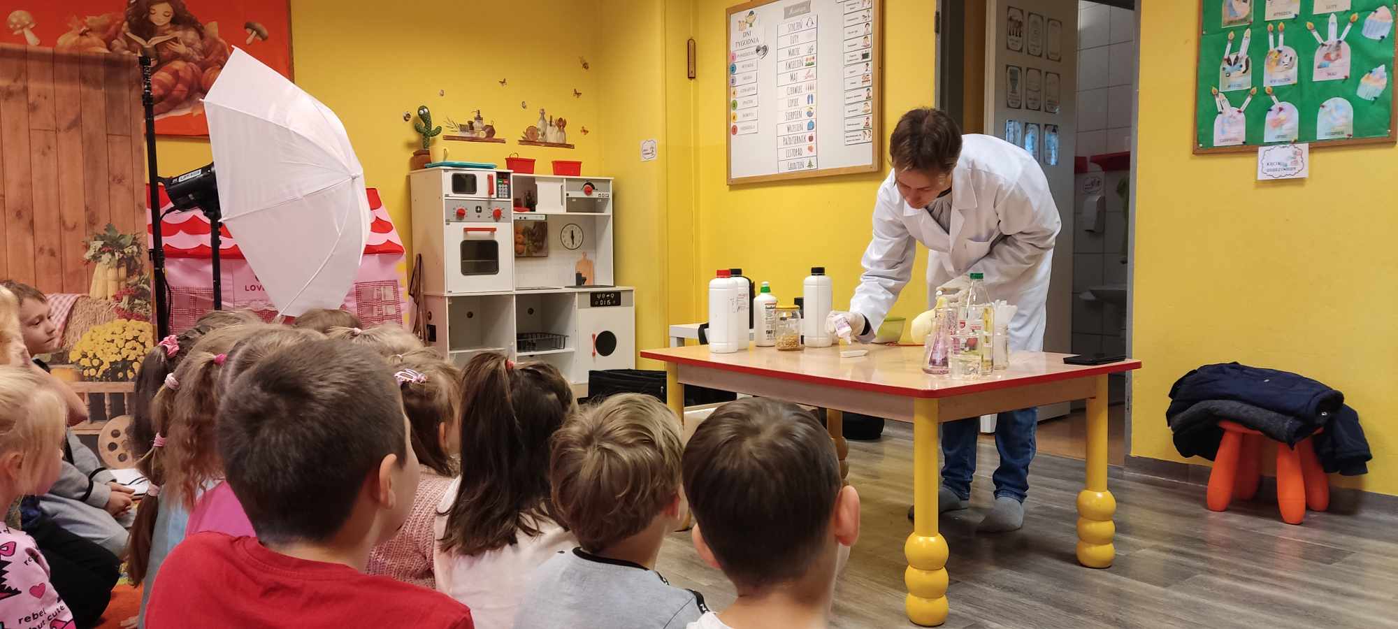 Przedszkolaki z zafascynowaniem przyglądały się przeprowadzanym eksperymentom z wykorzystaniem mniej lub bardziej dostępnych składników, m.in. gliceryny, płynu do mycia naczyń, wody utlenionej czy sody oczyszczonej. Dowiedziały się, w jaki sposób wykonać pastę do zębów dla słonia, co zrobić, by ziarenka kukurydzy zaczęły tańczyć, a także jak można rozpalić ognisko bez patyków i zapałek. Obserwowały i przewidywały, jaki kolor powstanie z połączenia dwóch bezbarwnych cieczy. Poznały wyposażenie chemika, w tym jego środki ochronne (tj. fartuch, rękawiczki) oraz nazwy niezbędnych mu naczyń i przyborów.