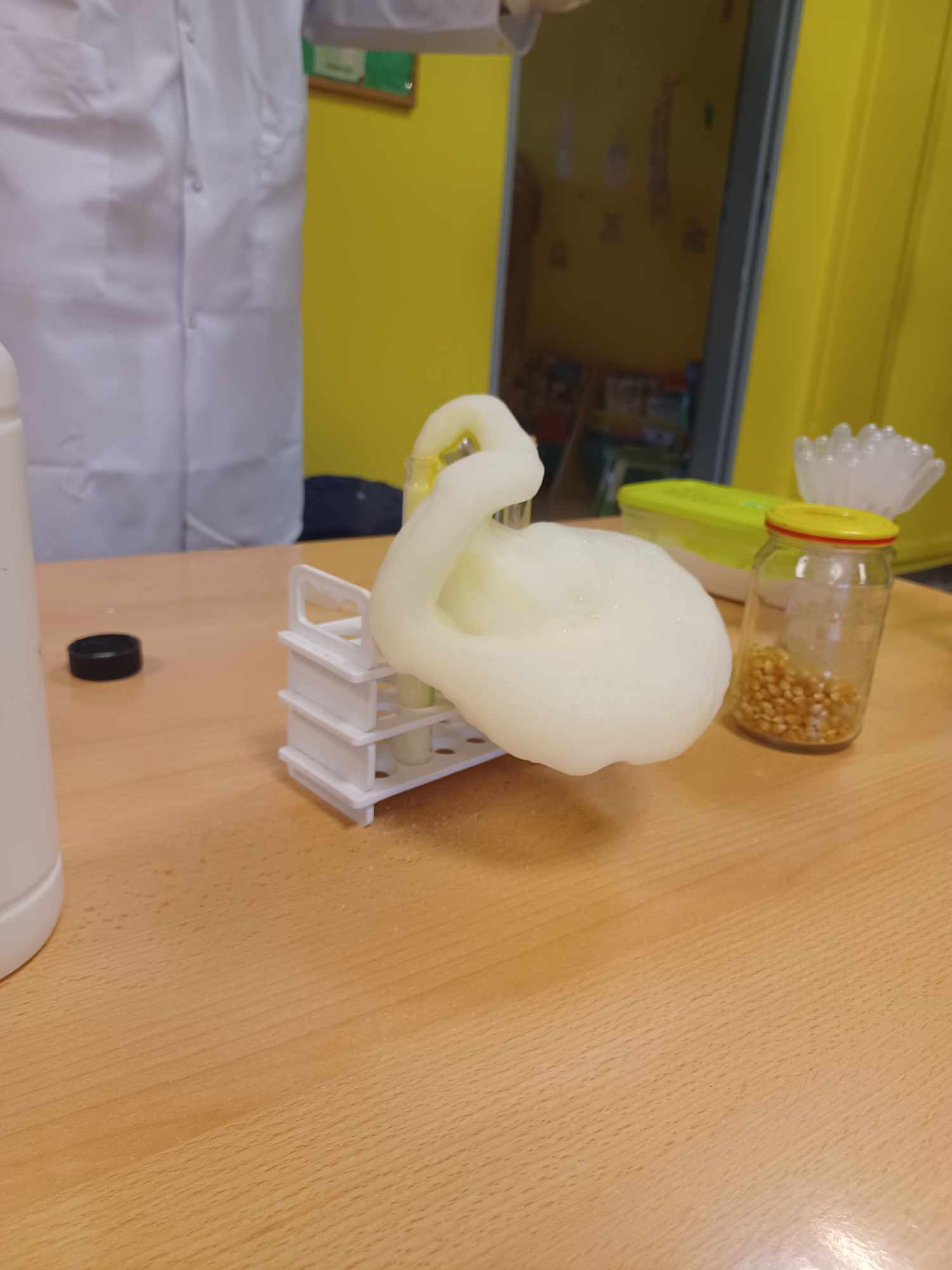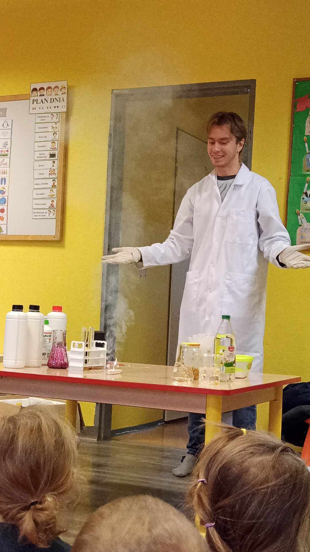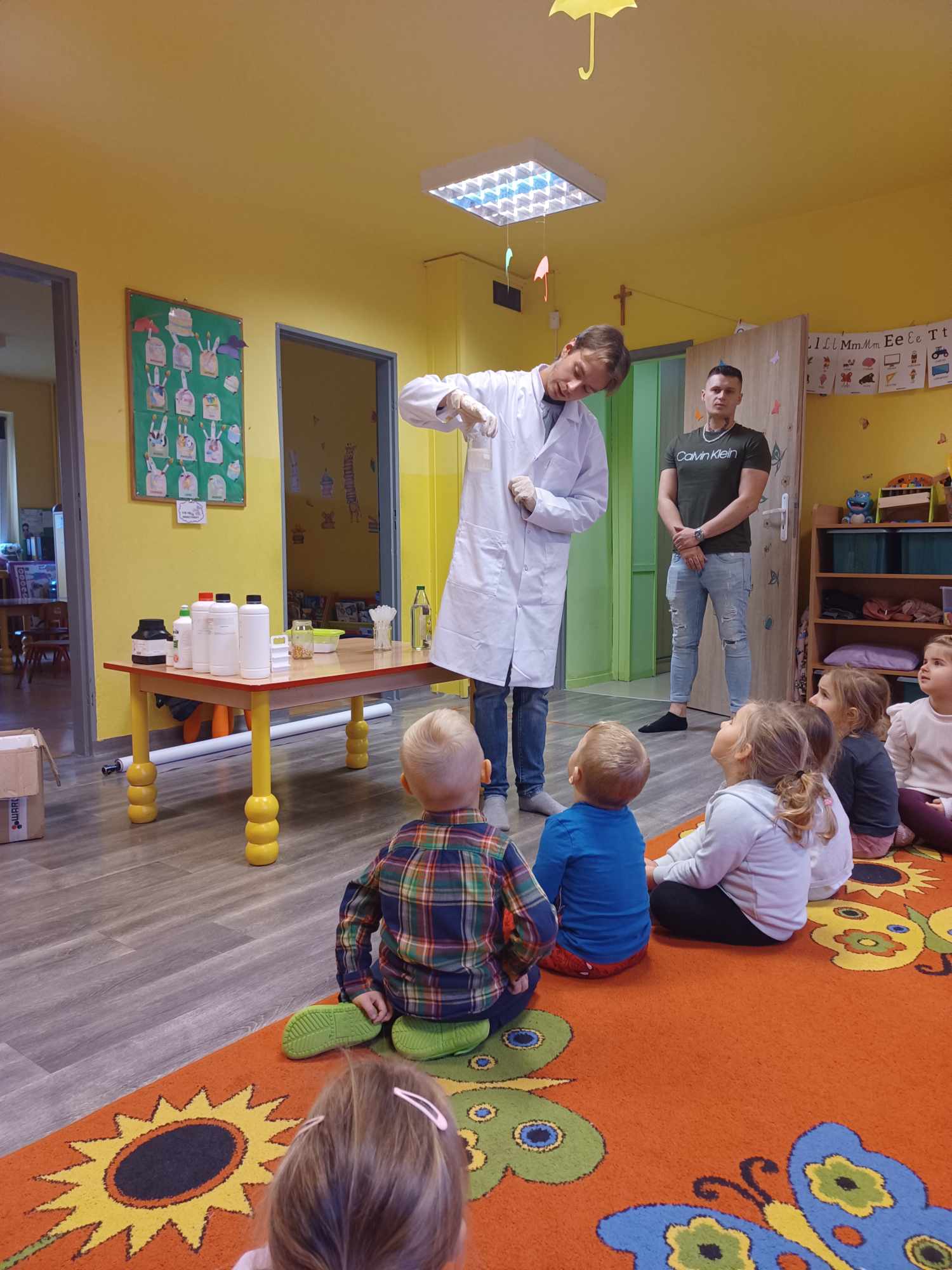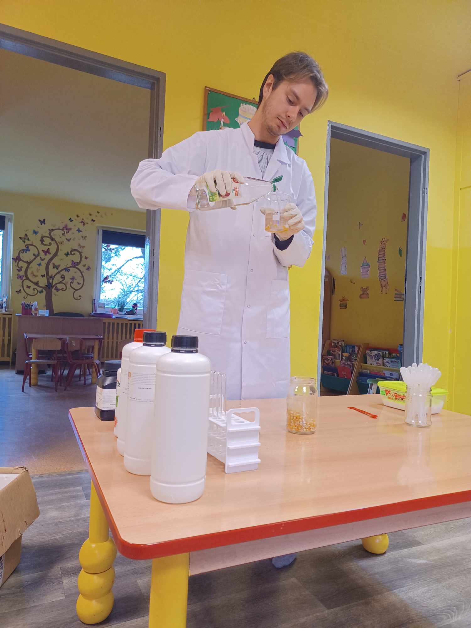 Przedszkolaki z zafascynowaniem przyglądały się przeprowadzanym eksperymentom z wykorzystaniem mniej lub bardziej dostępnych składników, m.in. gliceryny, płynu do mycia naczyń, wody utlenionej czy sody oczyszczonej. Dowiedziały się, w jaki sposób wykonać pastę do zębów dla słonia, co zrobić, by ziarenka kukurydzy zaczęły tańczyć, a także jak można rozpalić ognisko bez patyków i zapałek. Obserwowały i przewidywały, jaki kolor powstanie z połączenia dwóch bezbarwnych cieczy. Poznały wyposażenie chemika, w tym jego środki ochronne (tj. fartuch, rękawiczki) oraz nazwy niezbędnych mu naczyń i przyborów.
