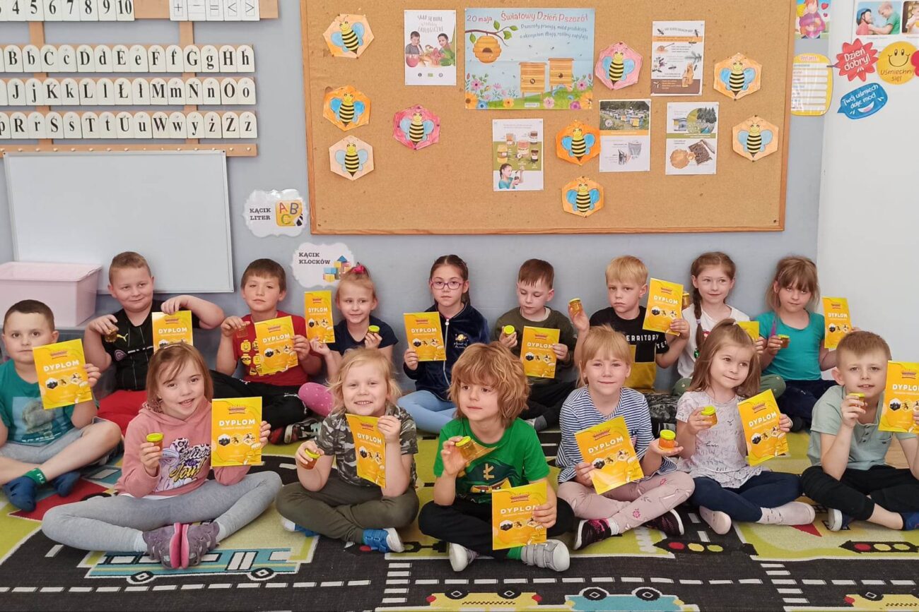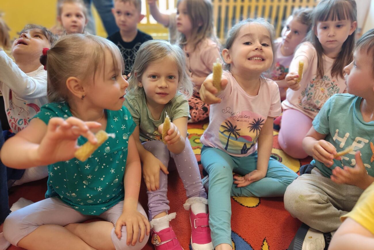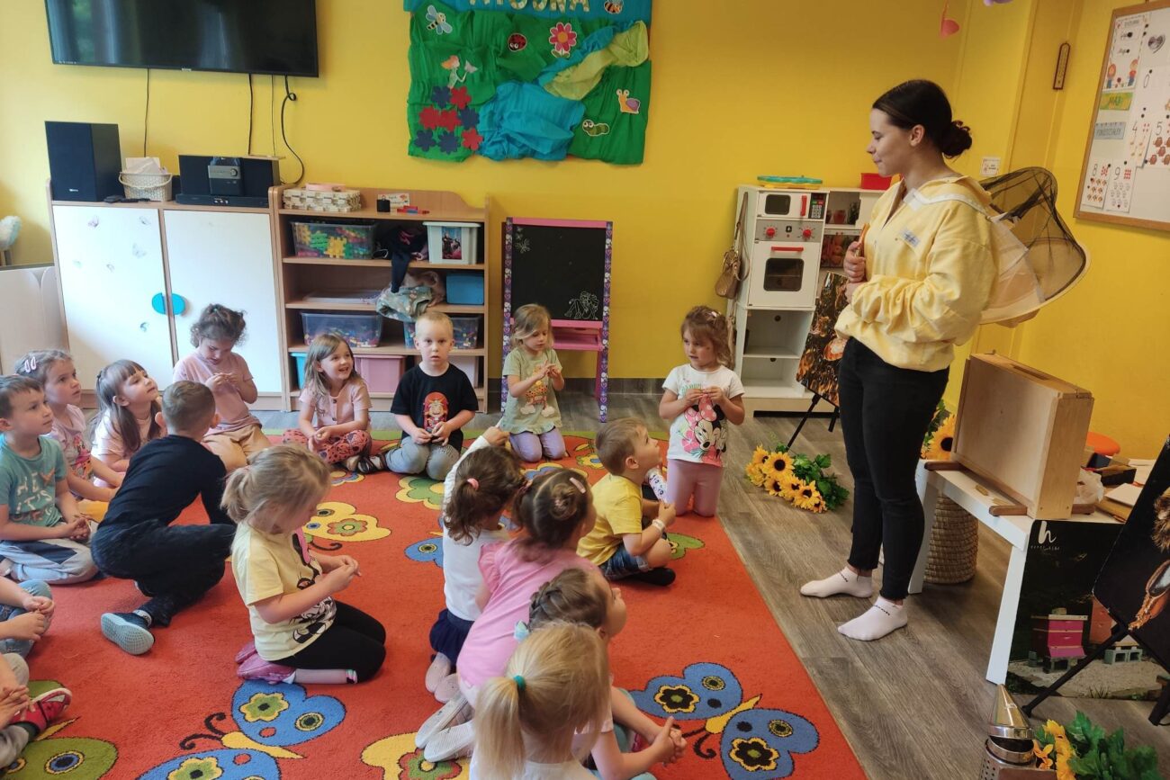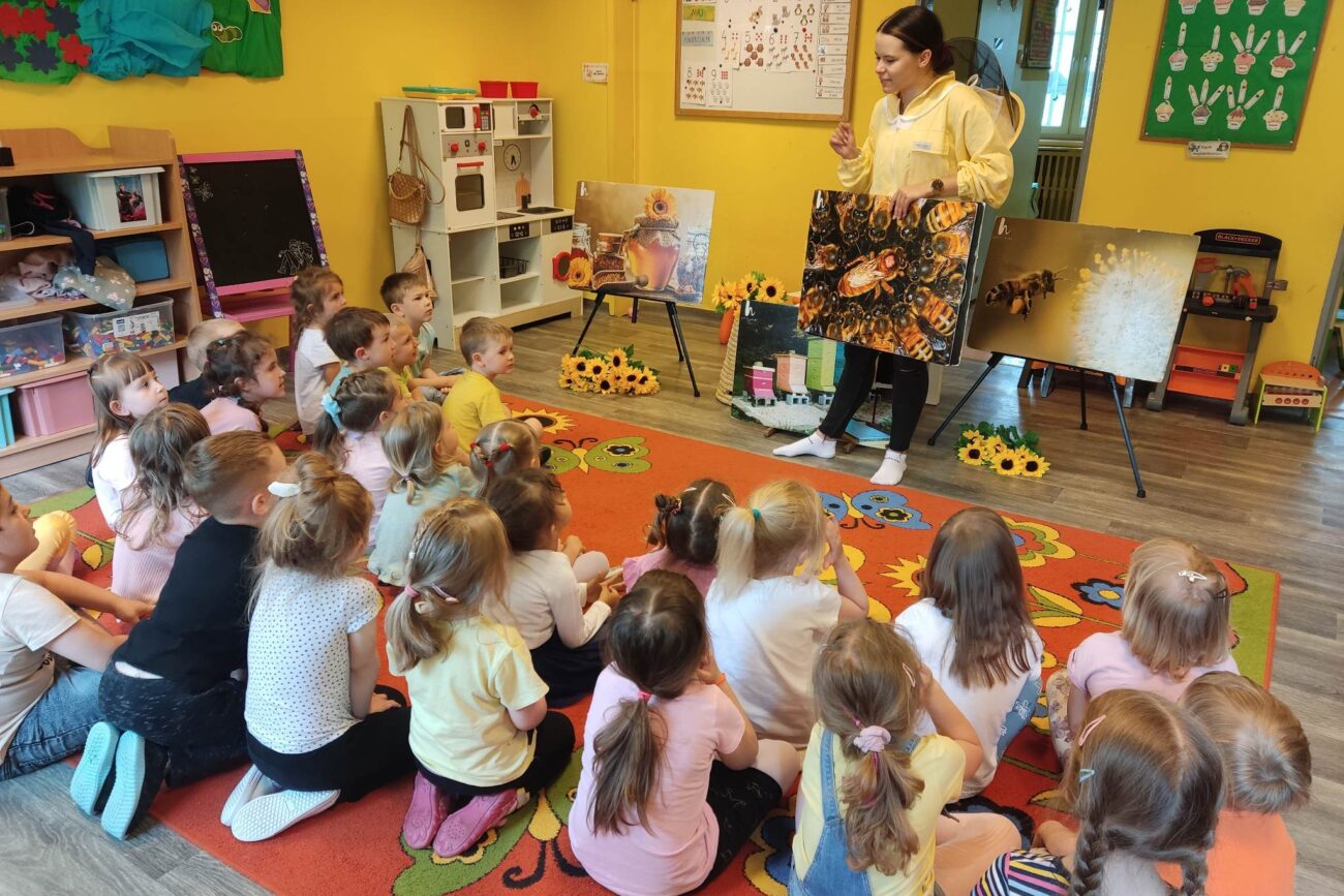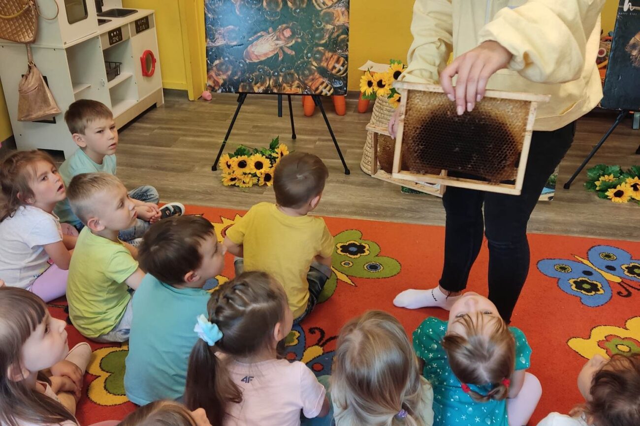 W dniu 29 maja w naszym przedszkolu odbyły się warsztaty pszczelarskie „Skąd się bierze miód?”. Dzieci miały możliwość poznać zwyczaje pszczół oraz dowiedzieć się jaką ogromną rolę pełnią w środowisku naturalnym. Przedszkolaki miały okazję obejrzeć strój pszczelarza i przyrządy, których używa on w swojej codziennej pracy. Niewątpliwą atrakcją była możliwość zobaczenia pszczół w szklanym ulu i wypatrywanie ich królowej. Na warsztatach dzieci samodzielnie wykonały świece z wosku pszczelego. Każdy uczestnik otrzymał dyplom oraz słoiczek pysznego miodu.