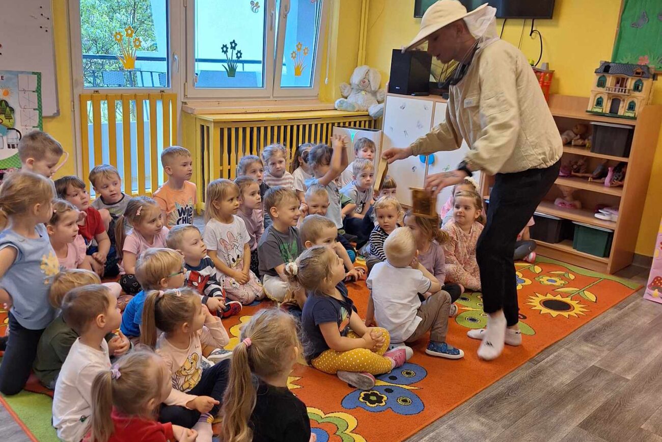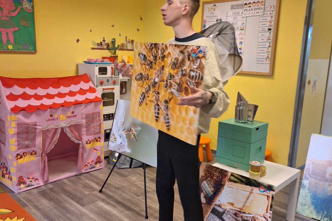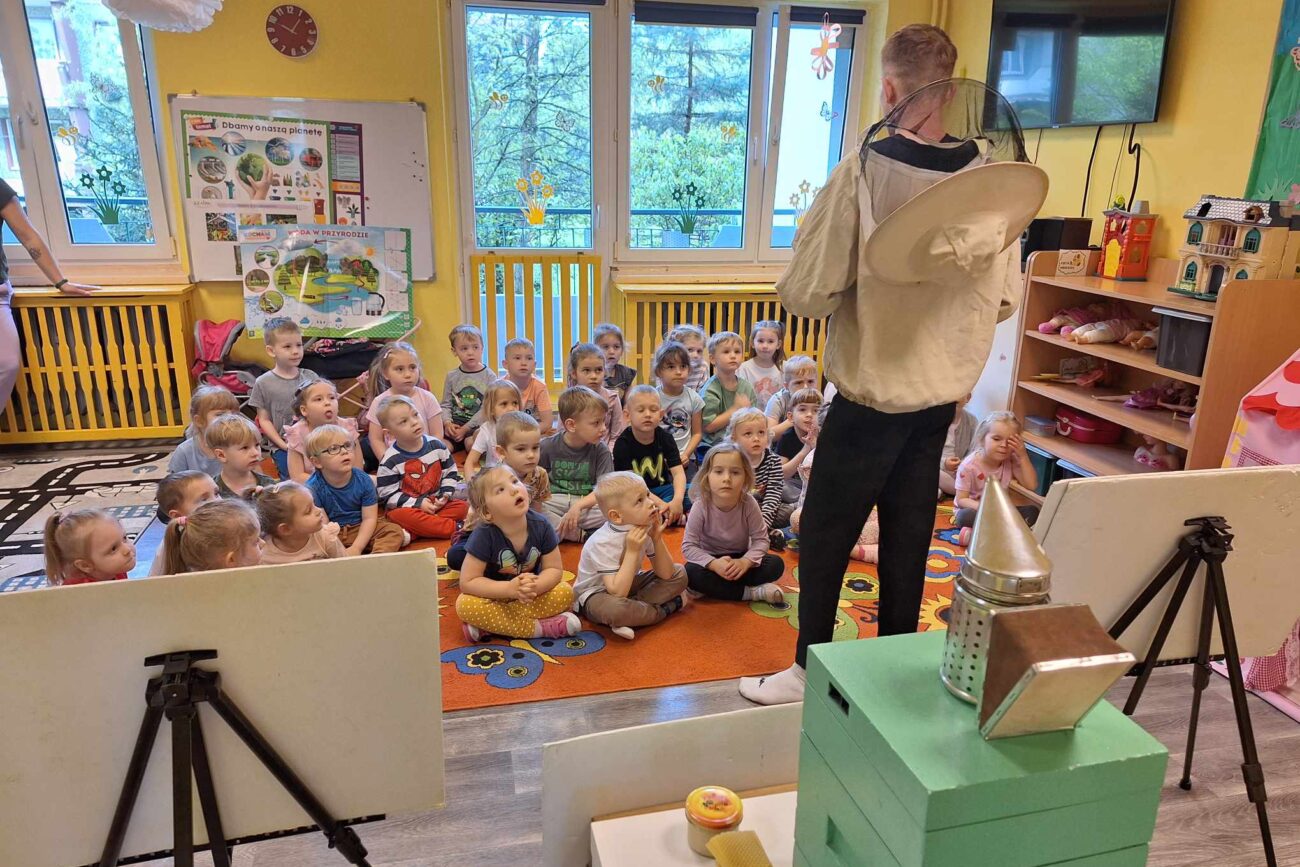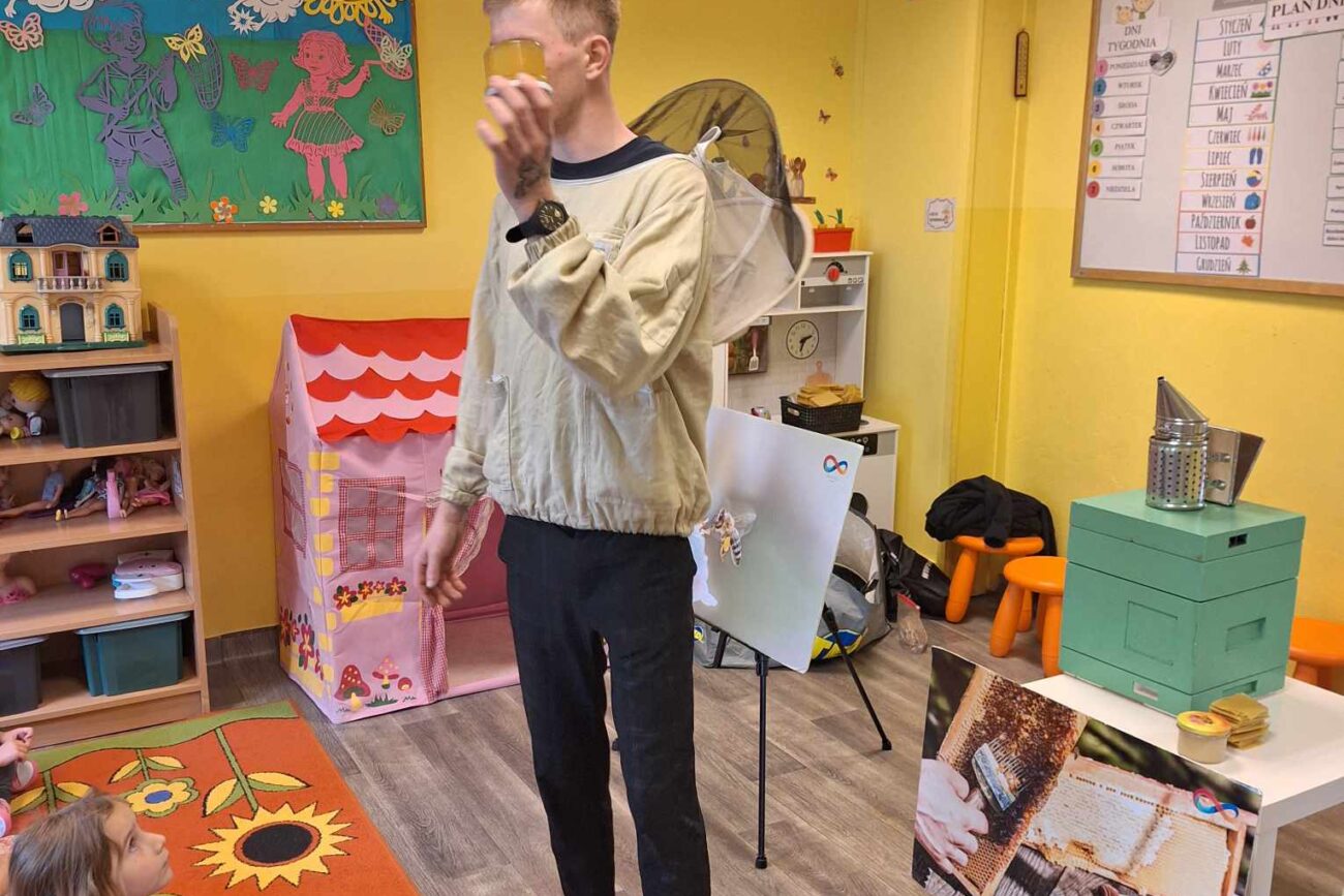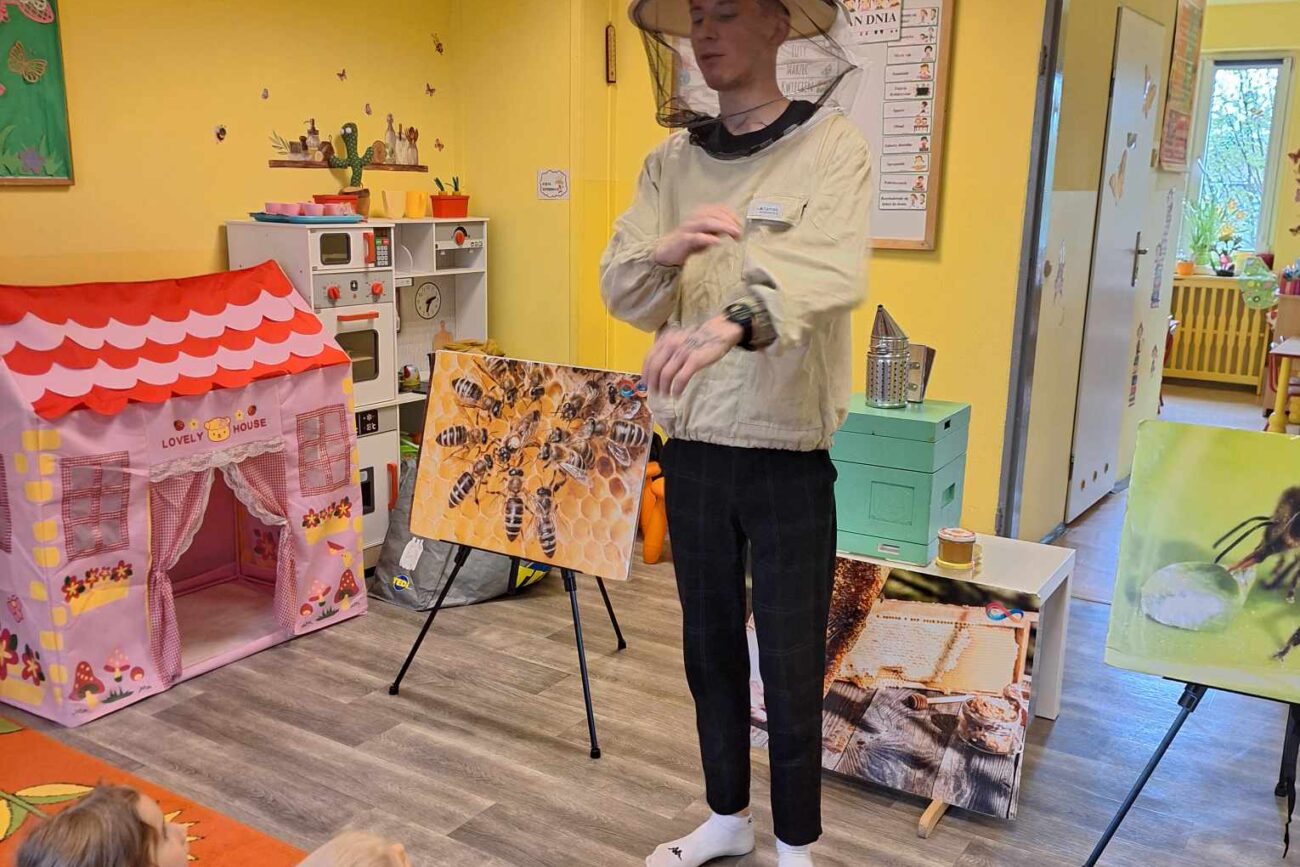 W dniu dzisiejszym gościliśmy w naszym przedszkolu IMAGO GRUPĘ, zajmującą się hodowlą pszczół. Prowadzący warsztaty Pan Michał oczarował naszych przedszkolaków! Przekazał ciekawe informacje o życiu pszczół, podkreślając ich kluczową rolę w przyrodzie. Uczniowie dowiedzieli się jak powstaje miód. Dużą atrakcją było oglądanie prawdziwego ula z pszczołami, stroju pszczelarza oraz przyrządów, których używa w swojej codziennej pracy. Pan Michał wyjaśnił, jak wygląda życie w ulu. Opowiedział o sposobach porozumiewania się pszczół i zdradził nam inne tajemnice z życia tych pracowitych owadów. Wyjaśnił, jak przebiega proces, który kończy się napełnianiem słoików miodem. Uczestnicy warsztatów mieli możliwość uformowania własnej świecy z wosku pszczelego. Na pamiątkę otrzymali dyplomy, odznaki pszczelarza i słoiczek miodu. To była wspaniała, ciekawa, żywa lekcja przyrody.