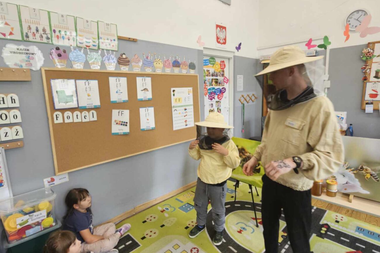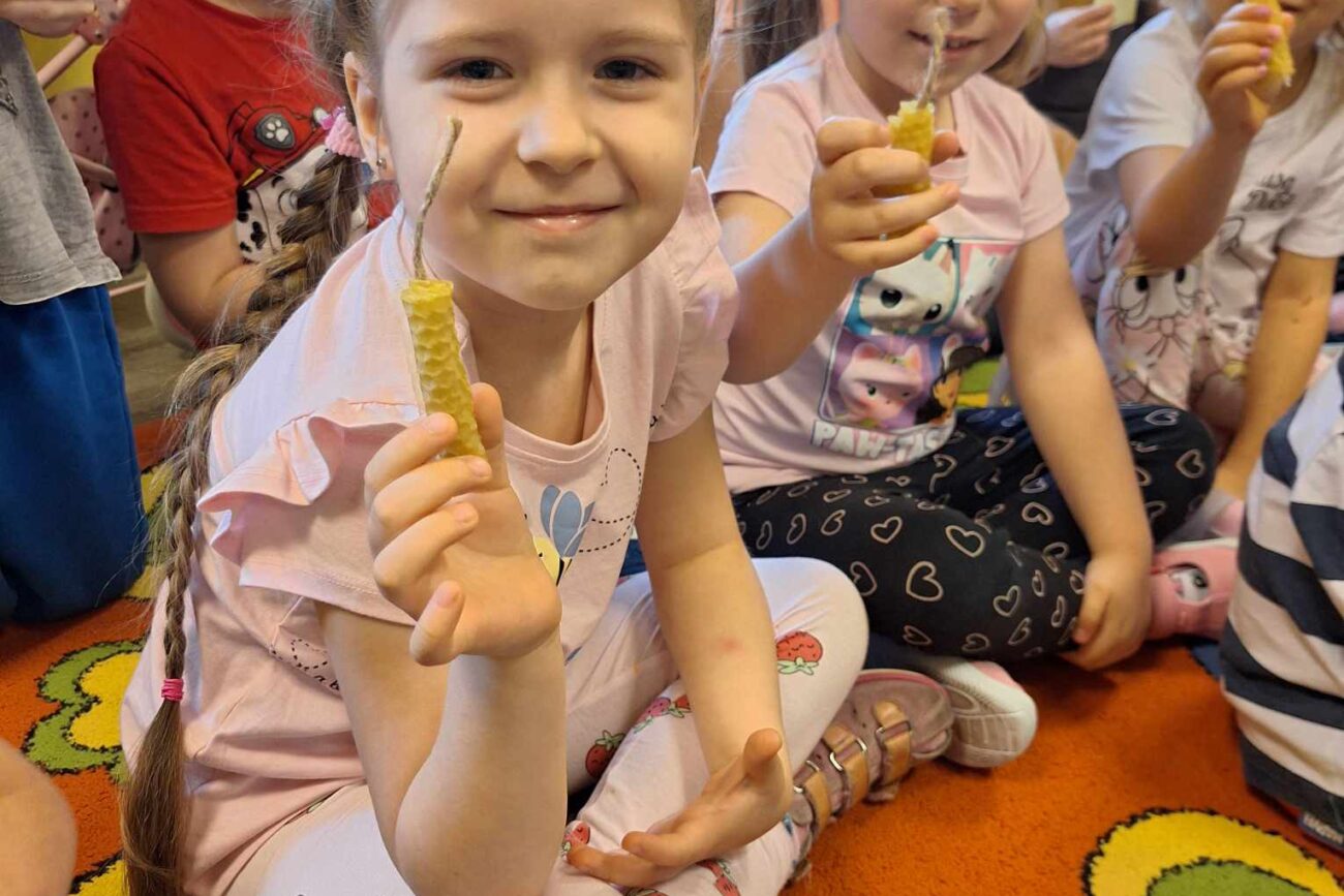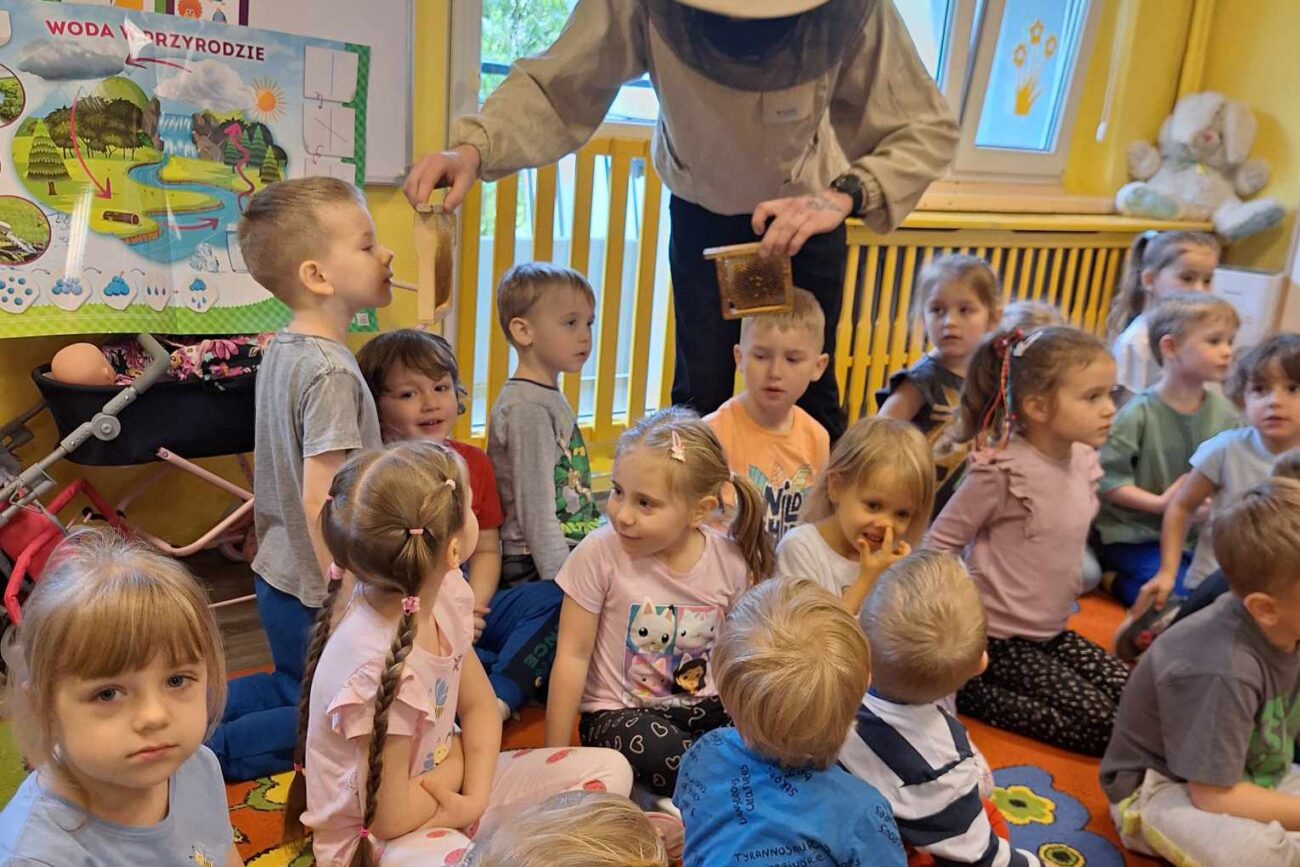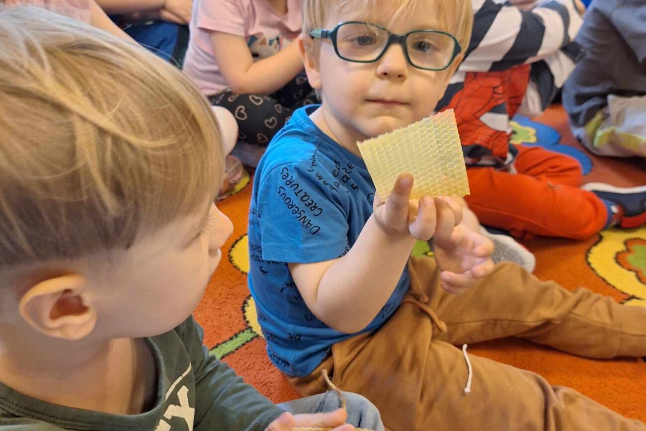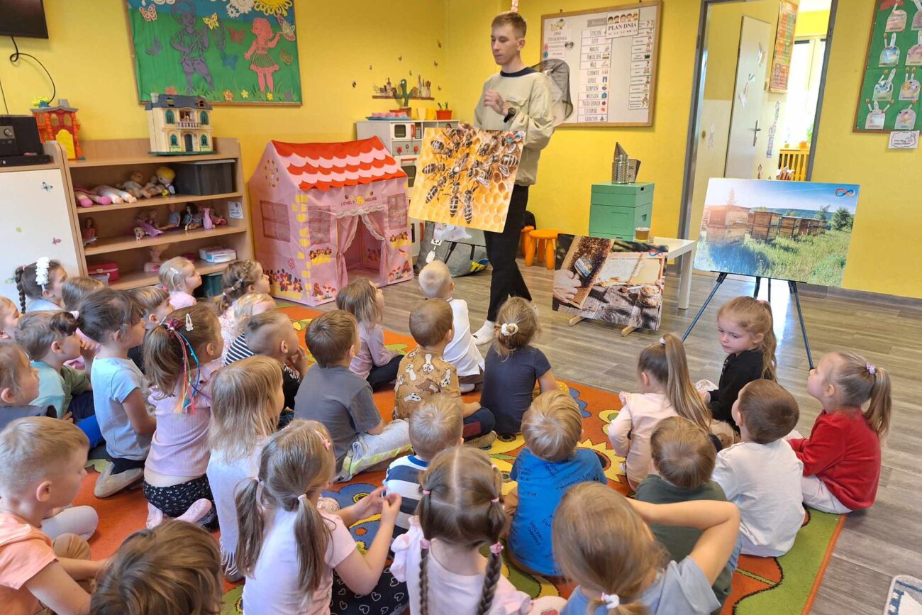 W dniu dzisiejszym gościliśmy w naszym przedszkolu IMAGO GRUPĘ, zajmującą się hodowlą pszczół. Prowadzący warsztaty Pan Michał oczarował naszych przedszkolaków! Przekazał ciekawe informacje o życiu pszczół, podkreślając ich kluczową rolę w przyrodzie. Uczniowie dowiedzieli się jak powstaje miód. Dużą atrakcją było oglądanie prawdziwego ula z pszczołami, stroju pszczelarza oraz przyrządów, których używa w swojej codziennej pracy. Pan Michał wyjaśnił, jak wygląda życie w ulu. Opowiedział o sposobach porozumiewania się pszczół i zdradził nam inne tajemnice z życia tych pracowitych owadów. Wyjaśnił, jak przebiega proces, który kończy się napełnianiem słoików miodem. Uczestnicy warsztatów mieli możliwość uformowania własnej świecy z wosku pszczelego. Na pamiątkę otrzymali dyplomy, odznaki pszczelarza i słoiczek miodu. To była wspaniała, ciekawa, żywa lekcja przyrody.
