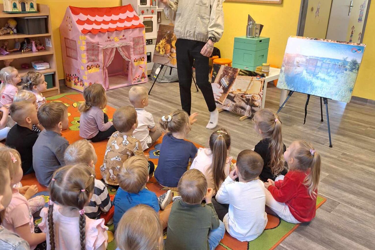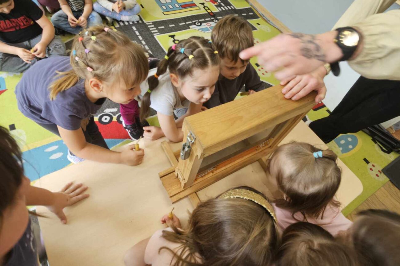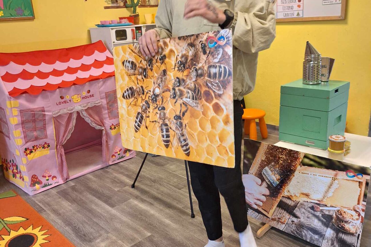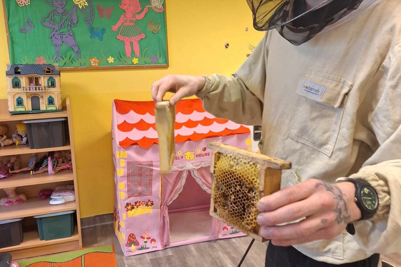 W dniu dzisiejszym gościliśmy w naszym przedszkolu IMAGO GRUPĘ, zajmującą się hodowlą pszczół. Prowadzący warsztaty Pan Michał oczarował naszych przedszkolaków! Przekazał ciekawe informacje o życiu pszczół, podkreślając ich kluczową rolę w przyrodzie. Uczniowie dowiedzieli się jak powstaje miód. Dużą atrakcją było oglądanie prawdziwego ula z pszczołami, stroju pszczelarza oraz przyrządów, których używa w swojej codziennej pracy. Pan Michał wyjaśnił, jak wygląda życie w ulu. Opowiedział o sposobach porozumiewania się pszczół i zdradził nam inne tajemnice z życia tych pracowitych owadów. Wyjaśnił, jak przebiega proces, który kończy się napełnianiem słoików miodem. Uczestnicy warsztatów mieli możliwość uformowania własnej świecy z wosku pszczelego. Na pamiątkę otrzymali dyplomy, odznaki pszczelarza i słoiczek miodu. To była wspaniała, ciekawa, żywa lekcja przyrody.
