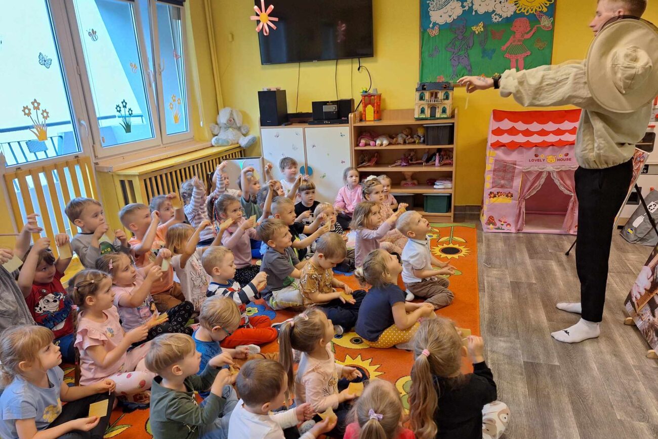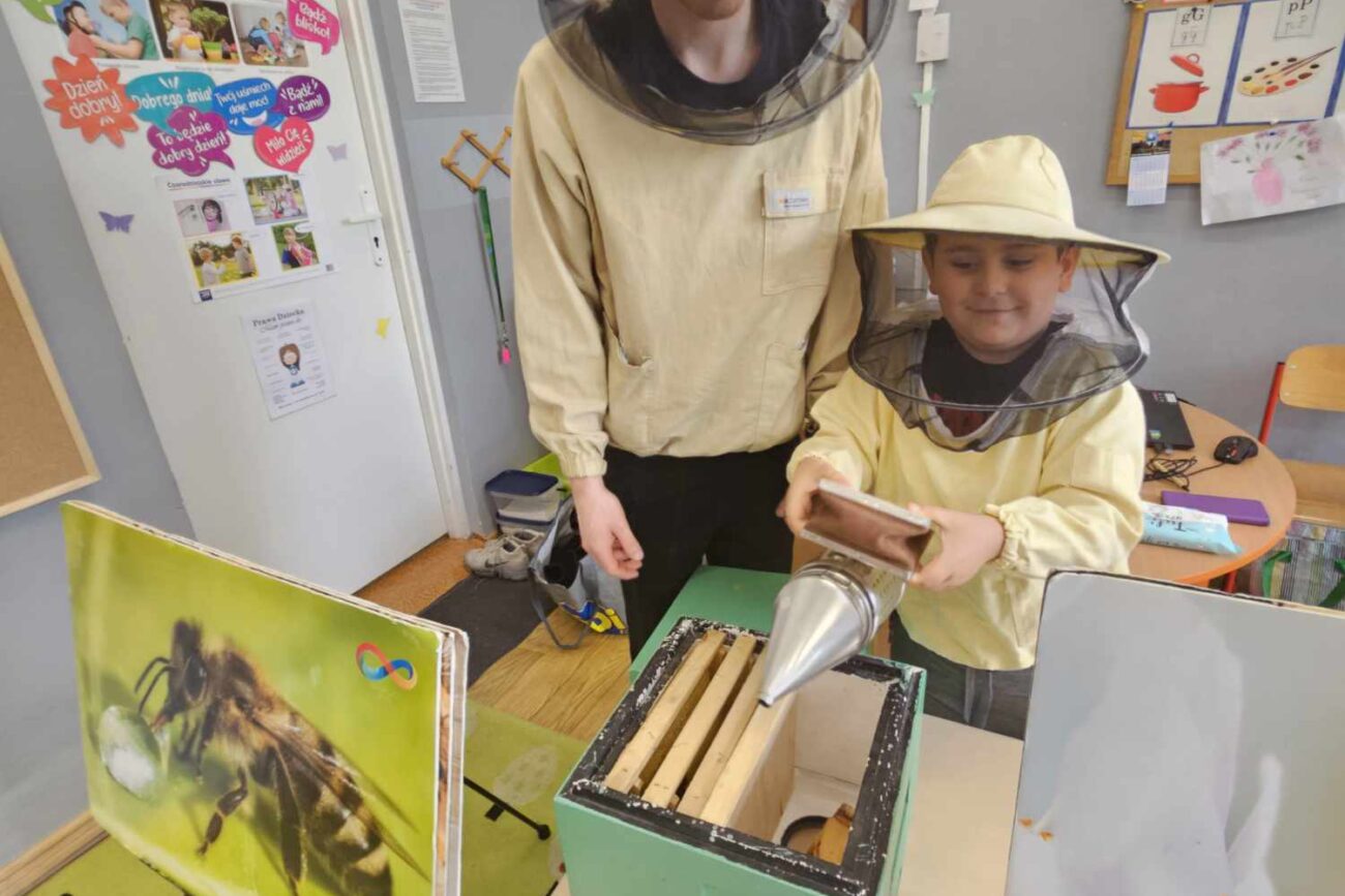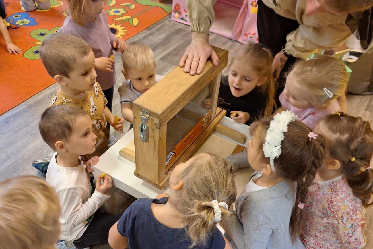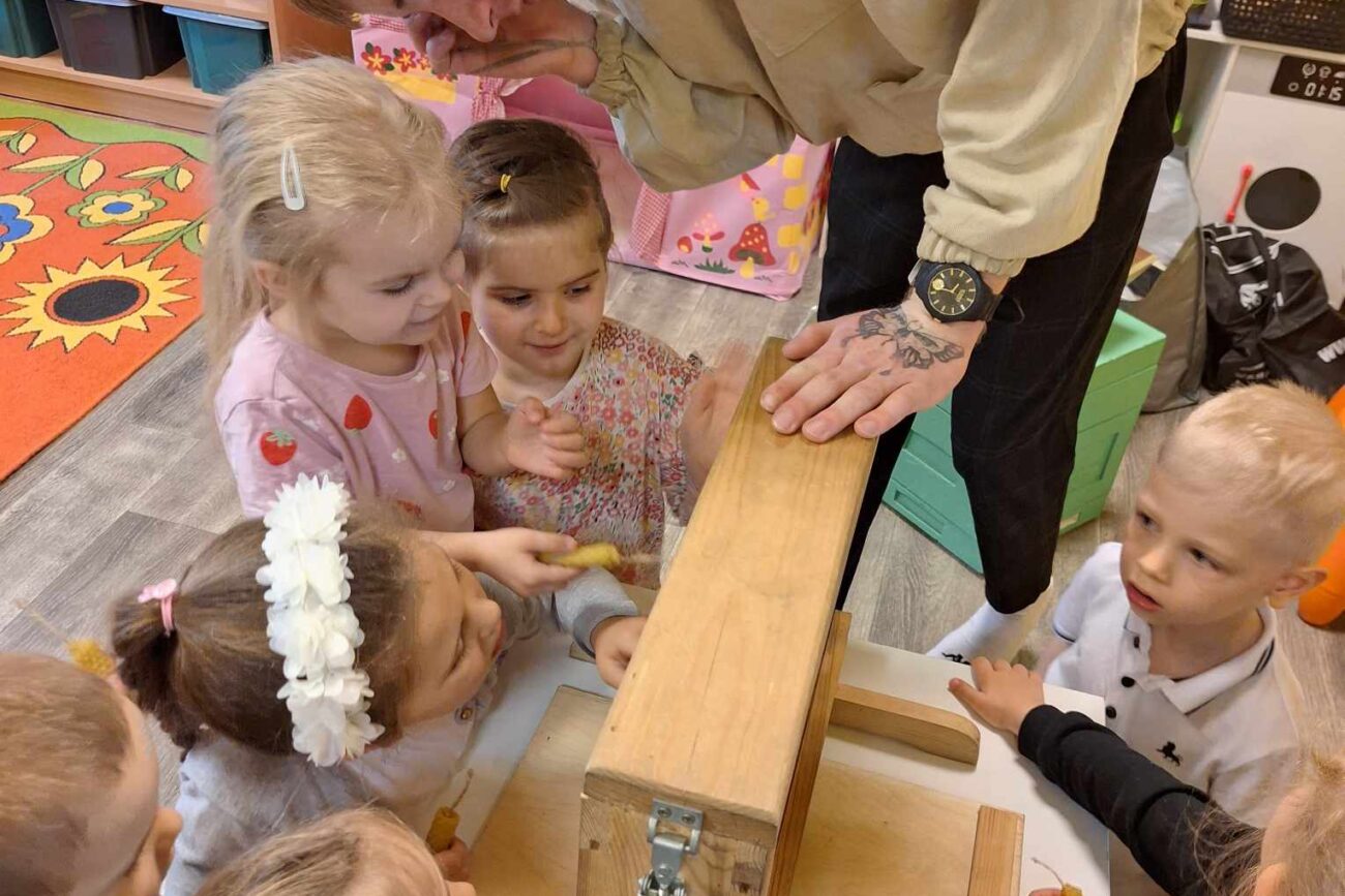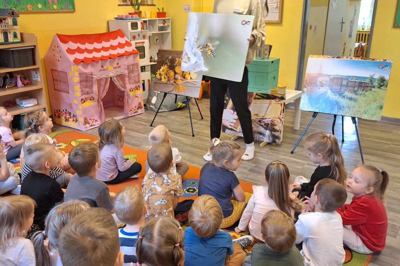 W dniu dzisiejszym gościliśmy w naszym przedszkolu IMAGO GRUPĘ, zajmującą się hodowlą pszczół. Prowadzący warsztaty Pan Michał oczarował naszych przedszkolaków! Przekazał ciekawe informacje o życiu pszczół, podkreślając ich kluczową rolę w przyrodzie. Uczniowie dowiedzieli się jak powstaje miód. Dużą atrakcją było oglądanie prawdziwego ula z pszczołami, stroju pszczelarza oraz przyrządów, których używa w swojej codziennej pracy. Pan Michał wyjaśnił, jak wygląda życie w ulu. Opowiedział o sposobach porozumiewania się pszczół i zdradził nam inne tajemnice z życia tych pracowitych owadów. Wyjaśnił, jak przebiega proces, który kończy się napełnianiem słoików miodem. Uczestnicy warsztatów mieli możliwość uformowania własnej świecy z wosku pszczelego. Na pamiątkę otrzymali dyplomy, odznaki pszczelarza i słoiczek miodu. To była wspaniała, ciekawa, żywa lekcja przyrody.