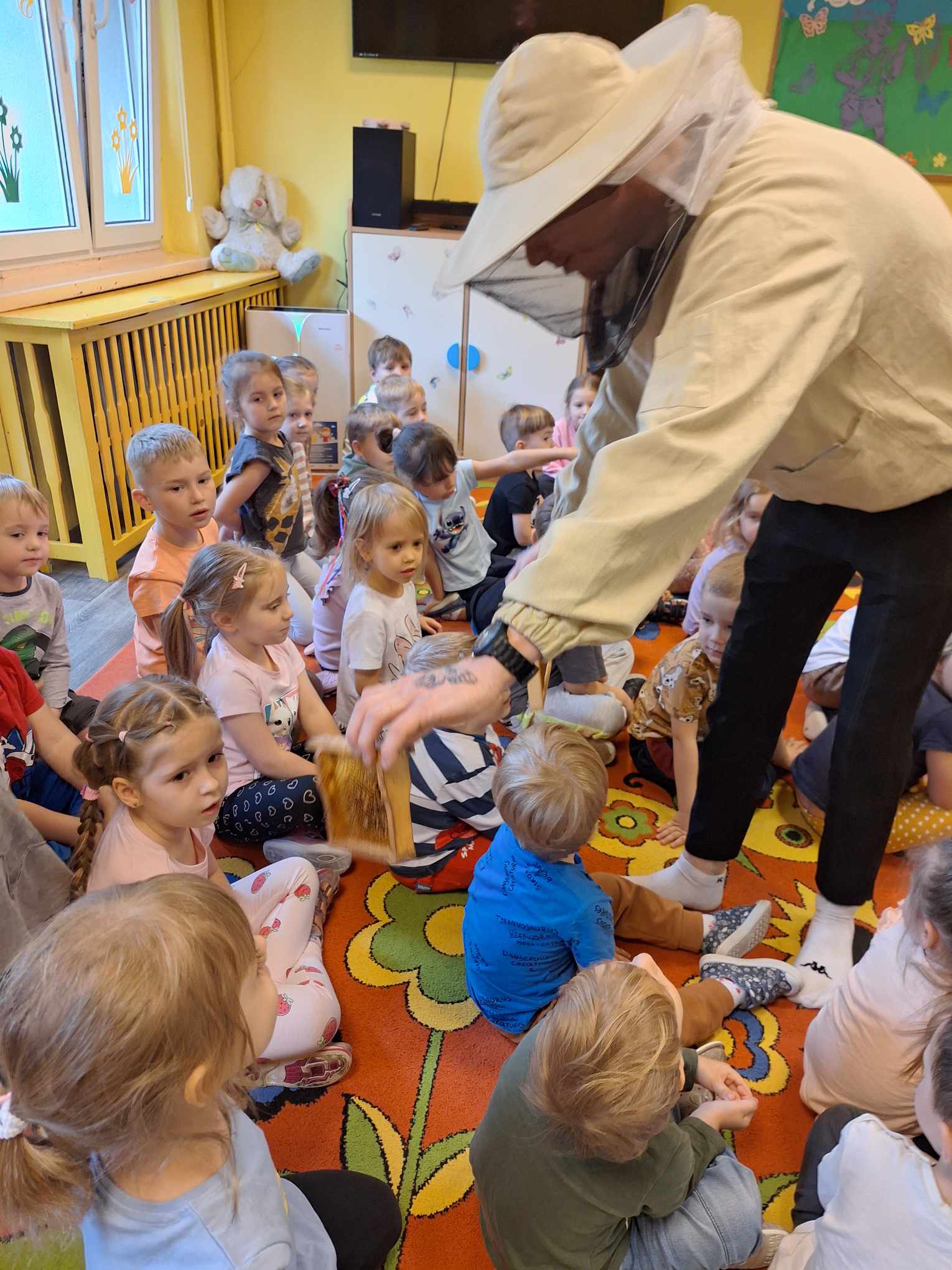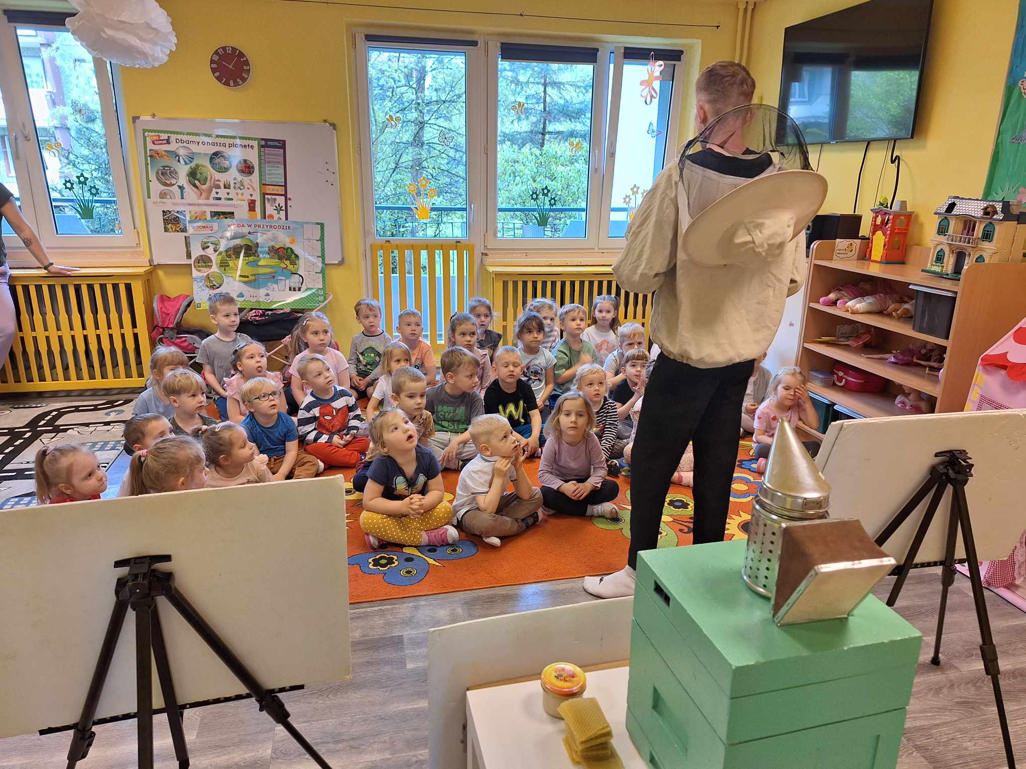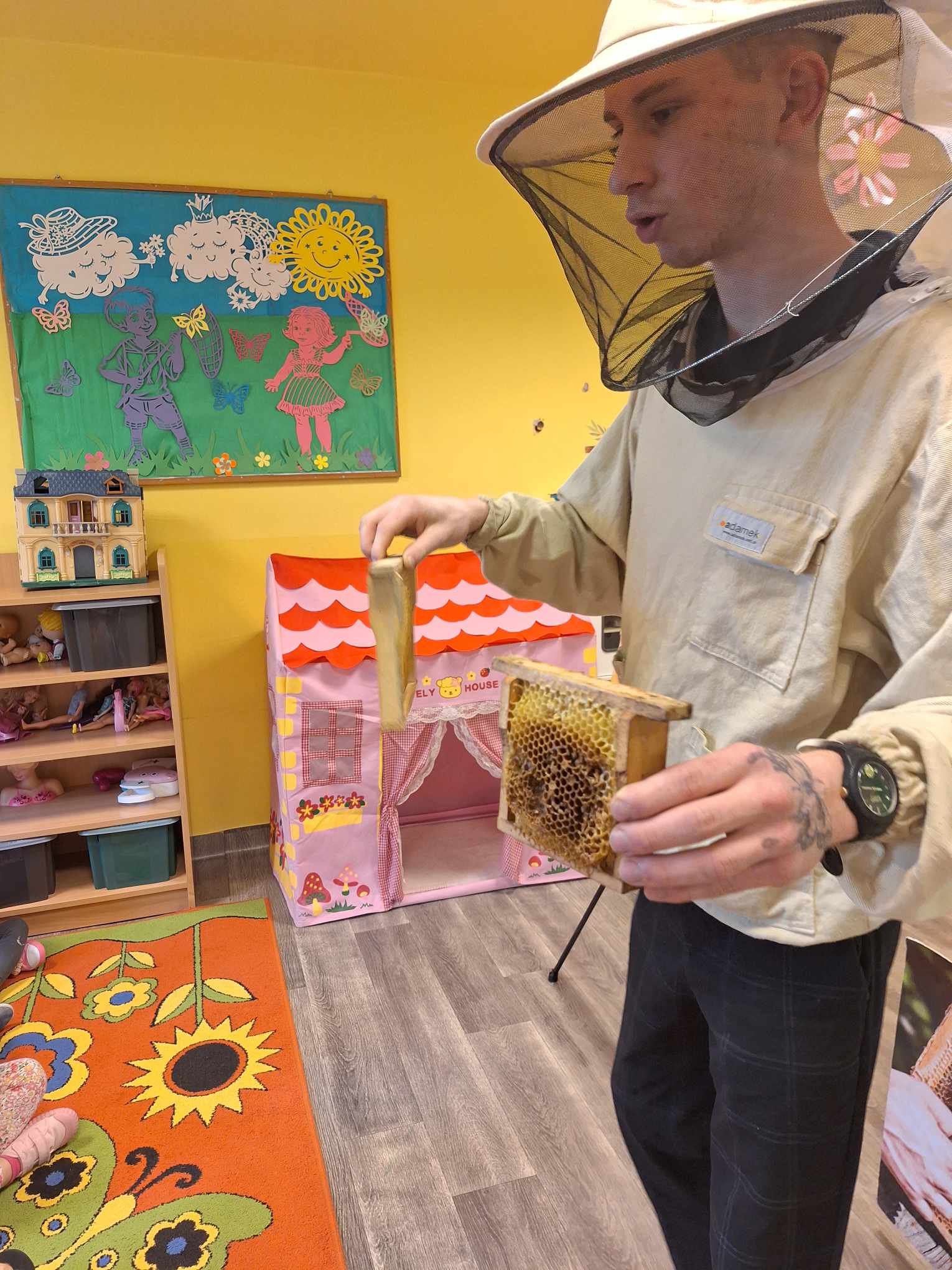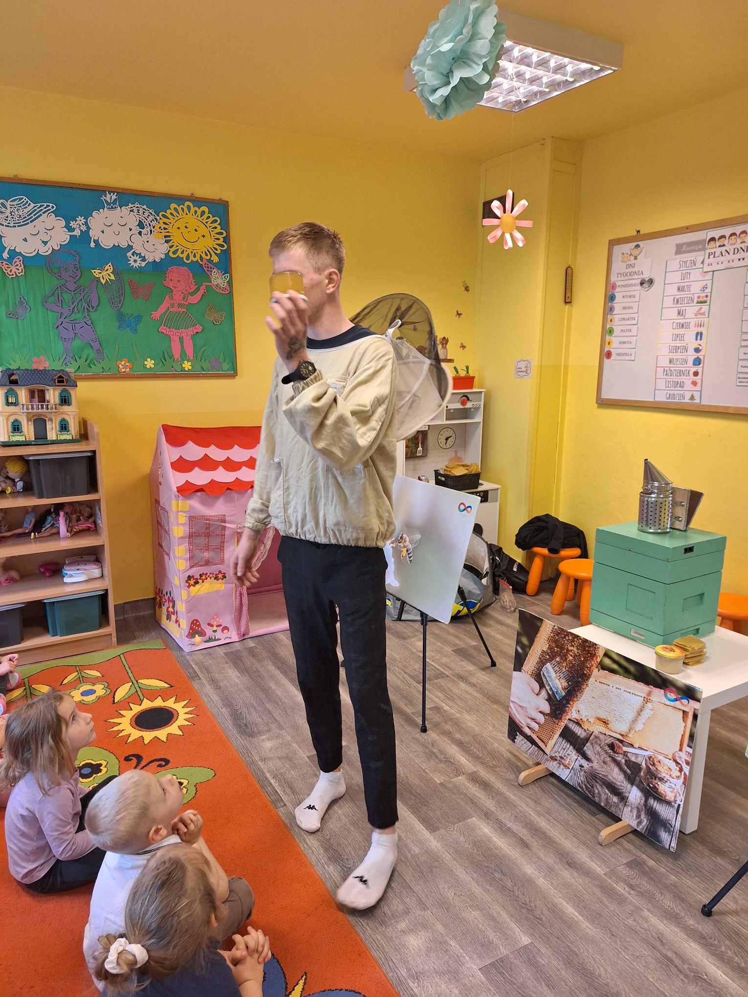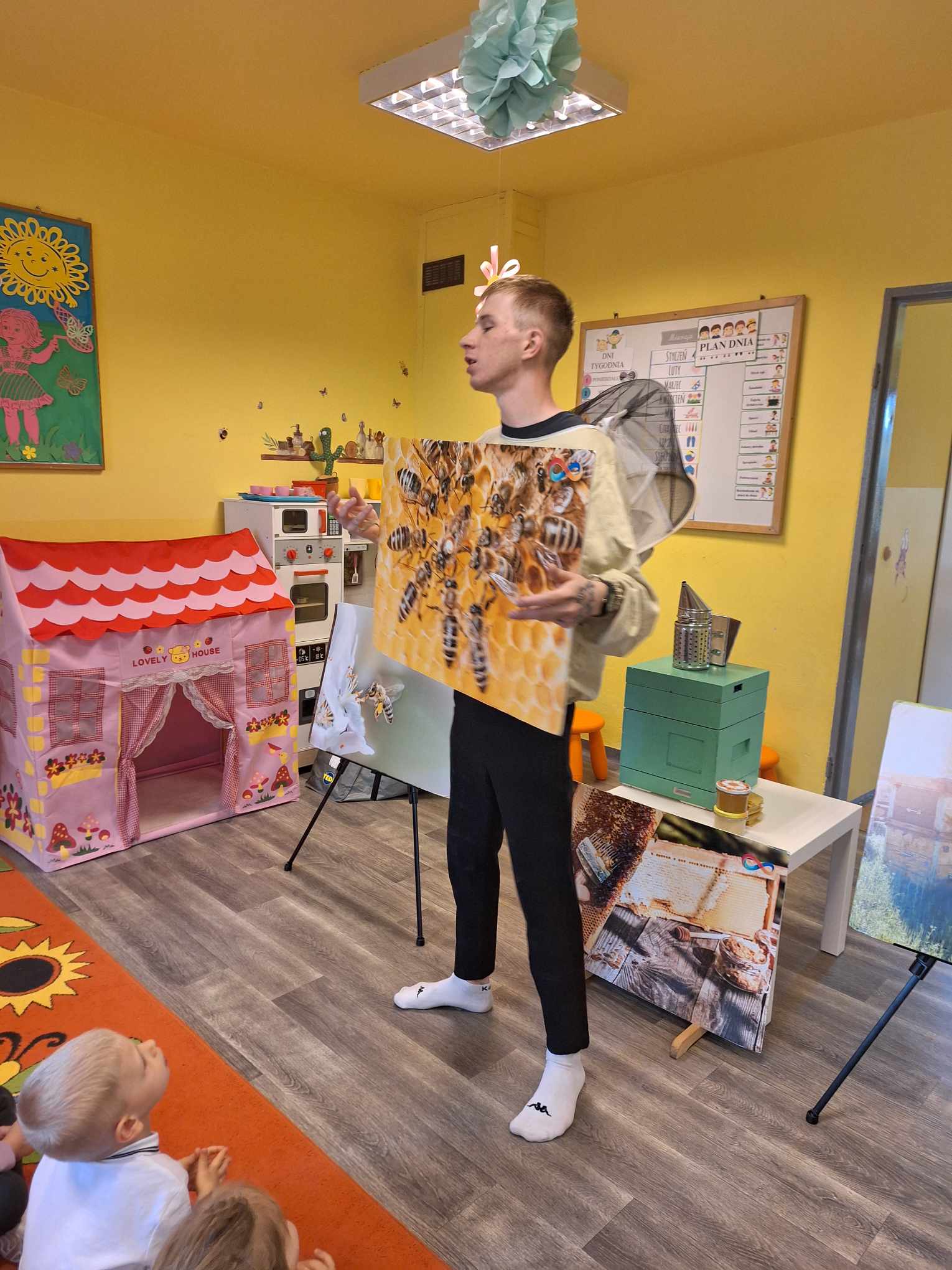 W dniu dzisiejszym gościliśmy w naszym przedszkolu IMAGO GRUPĘ, zajmującą się hodowlą pszczół. Prowadzący warsztaty Pan Michał oczarował naszych przedszkolaków! Przekazał ciekawe informacje o życiu pszczół, podkreślając ich kluczową rolę w przyrodzie. Uczniowie dowiedzieli się jak powstaje miód. Dużą atrakcją było oglądanie prawdziwego ula z pszczołami, stroju pszczelarza oraz przyrządów, których używa w swojej codziennej pracy. Pan Michał wyjaśnił, jak wygląda życie w ulu. Opowiedział o sposobach porozumiewania się pszczół i zdradził nam inne tajemnice z życia tych pracowitych owadów. Wyjaśnił, jak przebiega proces, który kończy się napełnianiem słoików miodem. Uczestnicy warsztatów mieli możliwość uformowania własnej świecy z wosku pszczelego. Na pamiątkę otrzymali dyplomy, odznaki pszczelarza i słoiczek miodu. To była wspaniała, ciekawa, żywa lekcja przyrody.