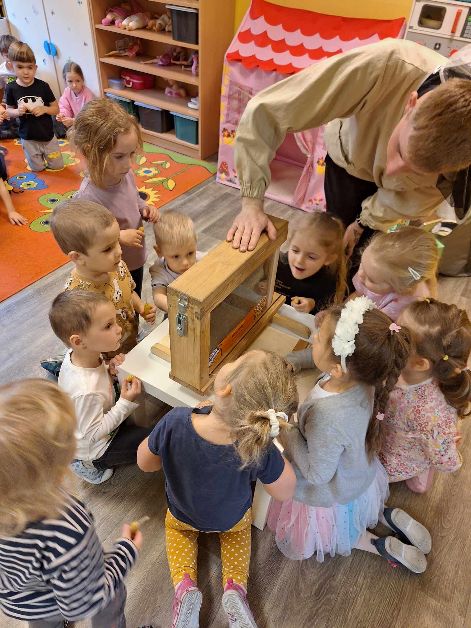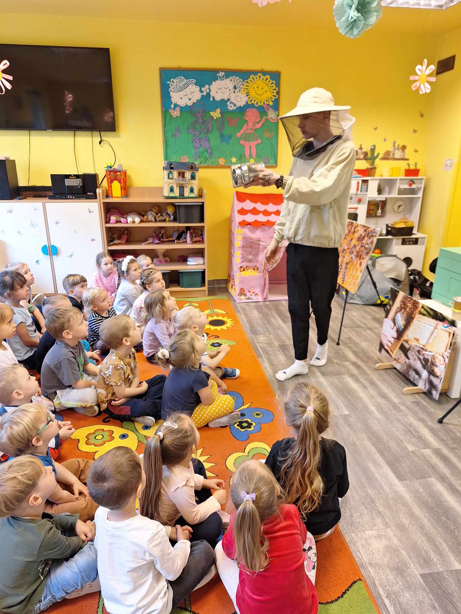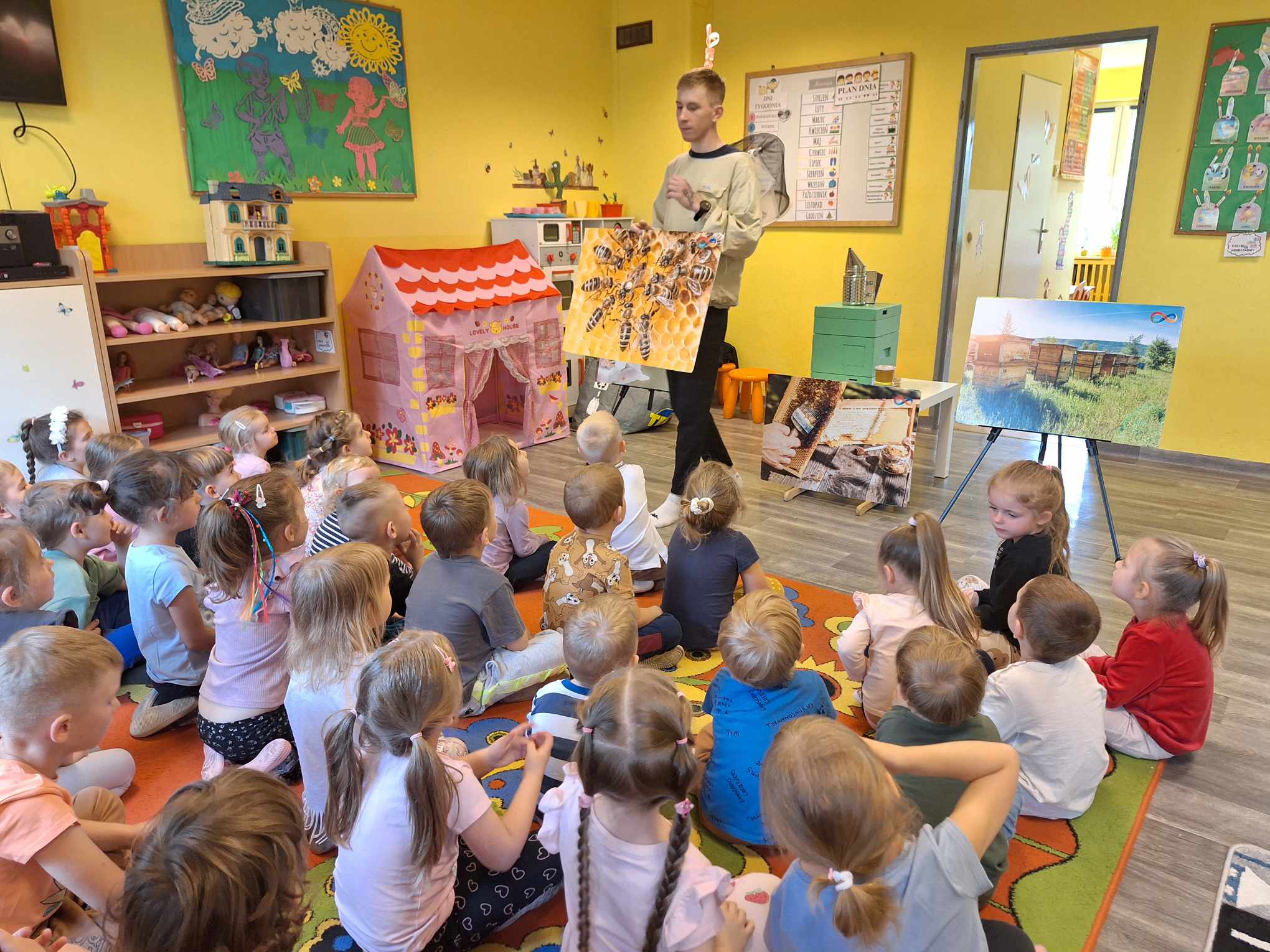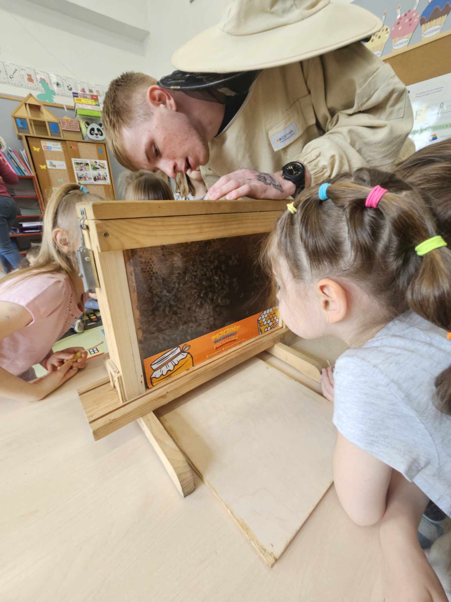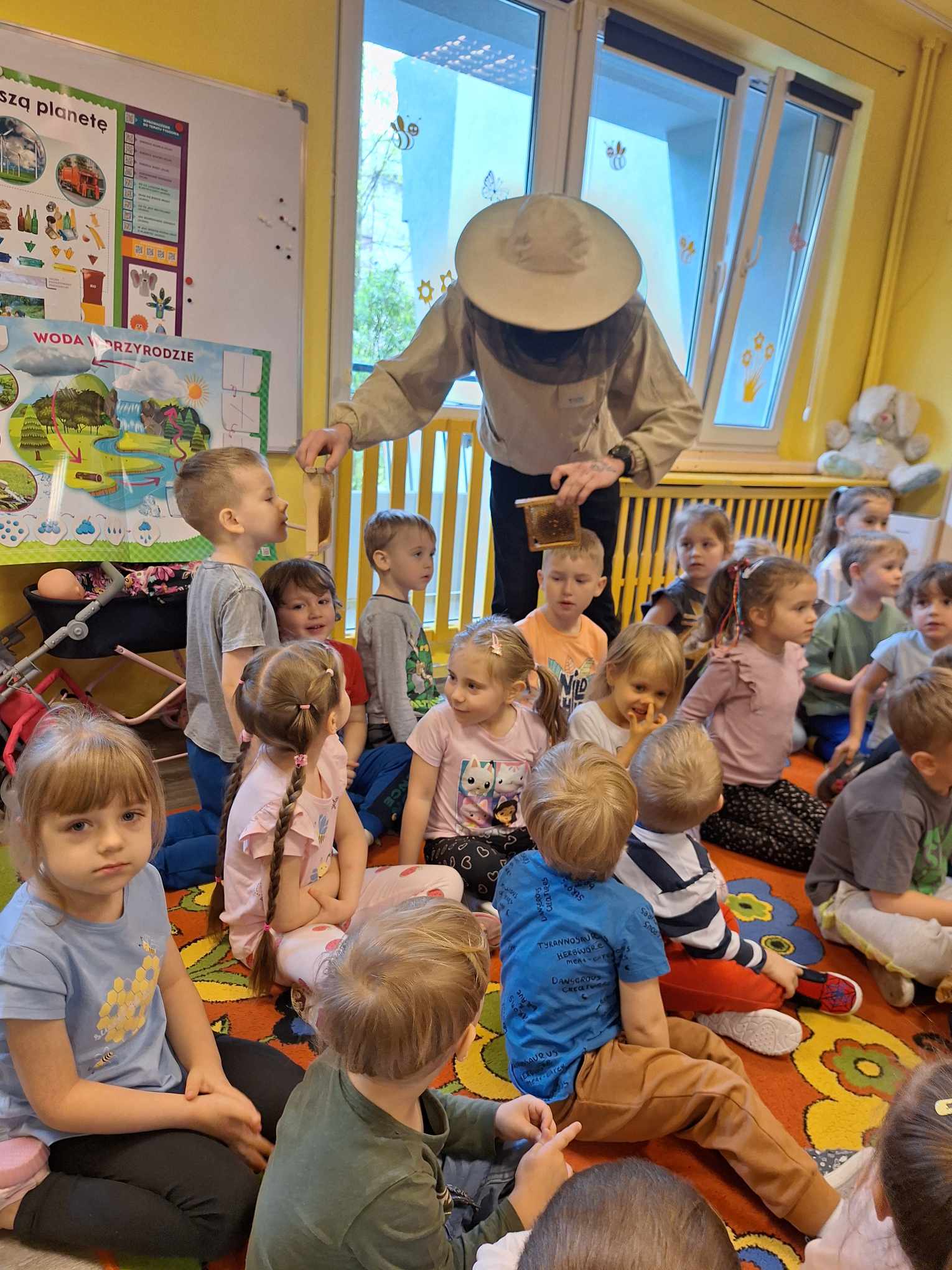 W dniu dzisiejszym gościliśmy w naszym przedszkolu IMAGO GRUPĘ, zajmującą się hodowlą pszczół. Prowadzący warsztaty Pan Michał oczarował naszych przedszkolaków! Przekazał ciekawe informacje o życiu pszczół, podkreślając ich kluczową rolę w przyrodzie. Uczniowie dowiedzieli się jak powstaje miód. Dużą atrakcją było oglądanie prawdziwego ula z pszczołami, stroju pszczelarza oraz przyrządów, których używa w swojej codziennej pracy. Pan Michał wyjaśnił, jak wygląda życie w ulu. Opowiedział o sposobach porozumiewania się pszczół i zdradził nam inne tajemnice z życia tych pracowitych owadów. Wyjaśnił, jak przebiega proces, który kończy się napełnianiem słoików miodem. Uczestnicy warsztatów mieli możliwość uformowania własnej świecy z wosku pszczelego. Na pamiątkę otrzymali dyplomy, odznaki pszczelarza i słoiczek miodu. To była wspaniała, ciekawa, żywa lekcja przyrody.
