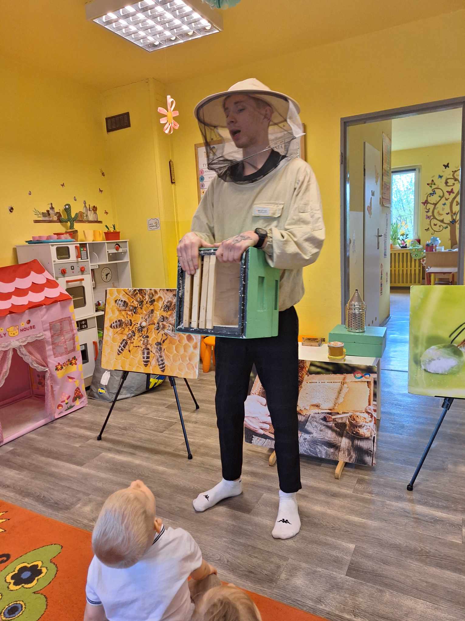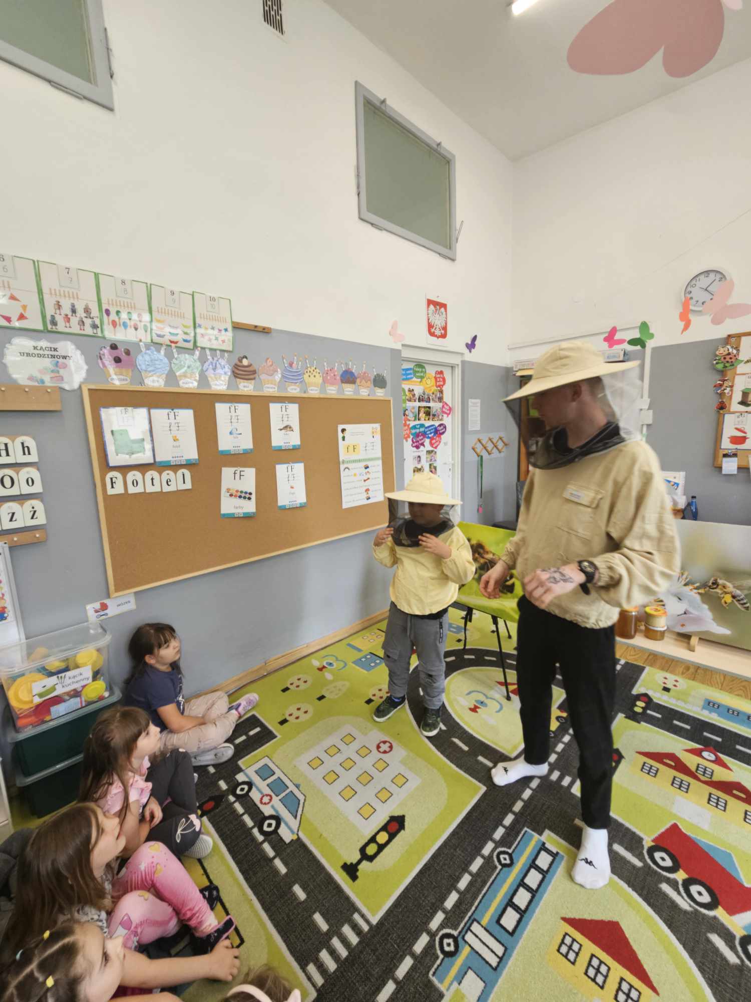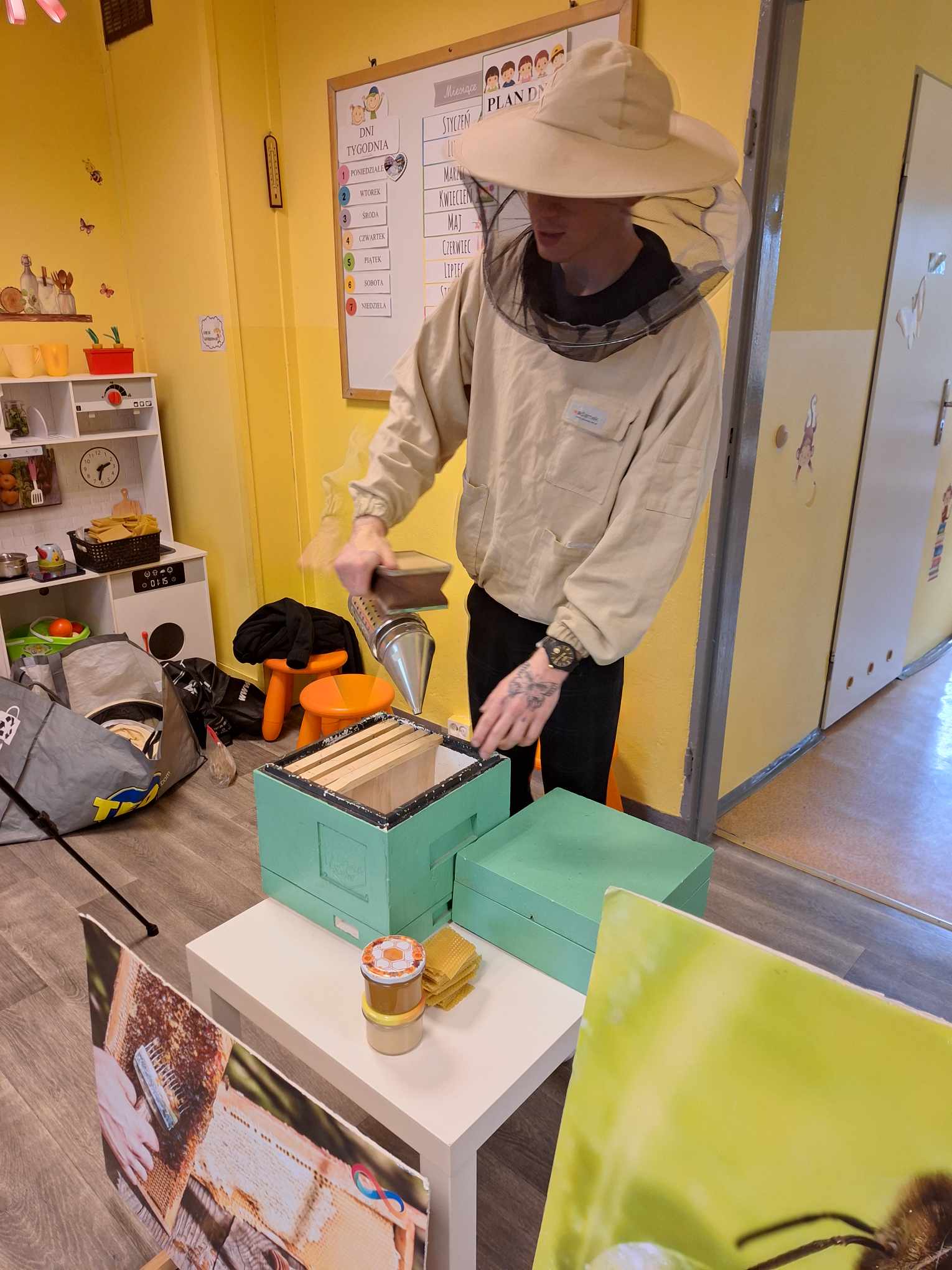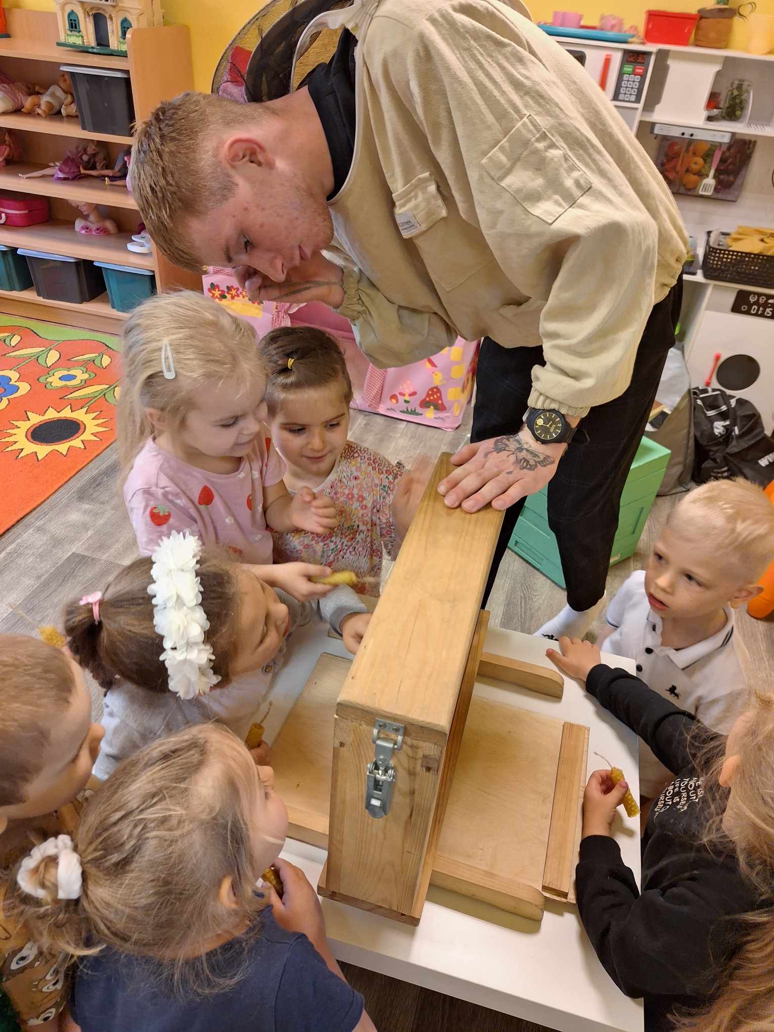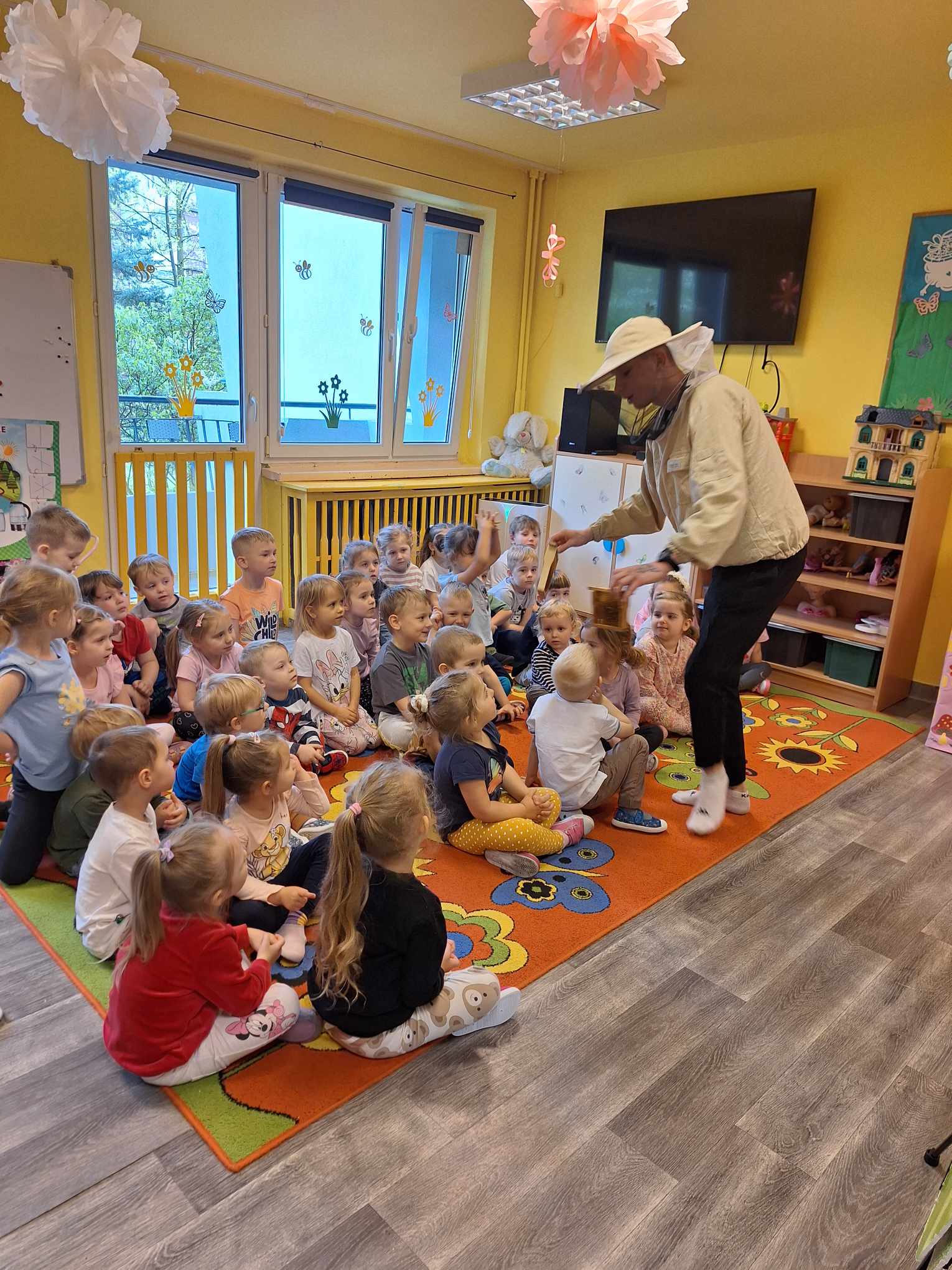 W dniu dzisiejszym gościliśmy w naszym przedszkolu IMAGO GRUPĘ, zajmującą się hodowlą pszczół. Prowadzący warsztaty Pan Michał oczarował naszych przedszkolaków! Przekazał ciekawe informacje o życiu pszczół, podkreślając ich kluczową rolę w przyrodzie. Uczniowie dowiedzieli się jak powstaje miód. Dużą atrakcją było oglądanie prawdziwego ula z pszczołami, stroju pszczelarza oraz przyrządów, których używa w swojej codziennej pracy. Pan Michał wyjaśnił, jak wygląda życie w ulu. Opowiedział o sposobach porozumiewania się pszczół i zdradził nam inne tajemnice z życia tych pracowitych owadów. Wyjaśnił, jak przebiega proces, który kończy się napełnianiem słoików miodem. Uczestnicy warsztatów mieli możliwość uformowania własnej świecy z wosku pszczelego. Na pamiątkę otrzymali dyplomy, odznaki pszczelarza i słoiczek miodu. To była wspaniała, ciekawa, żywa lekcja przyrody.