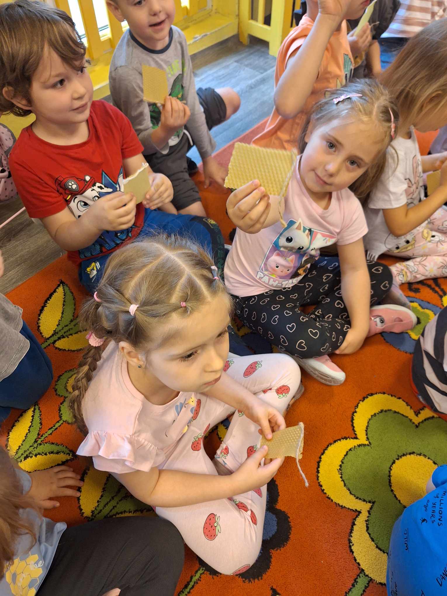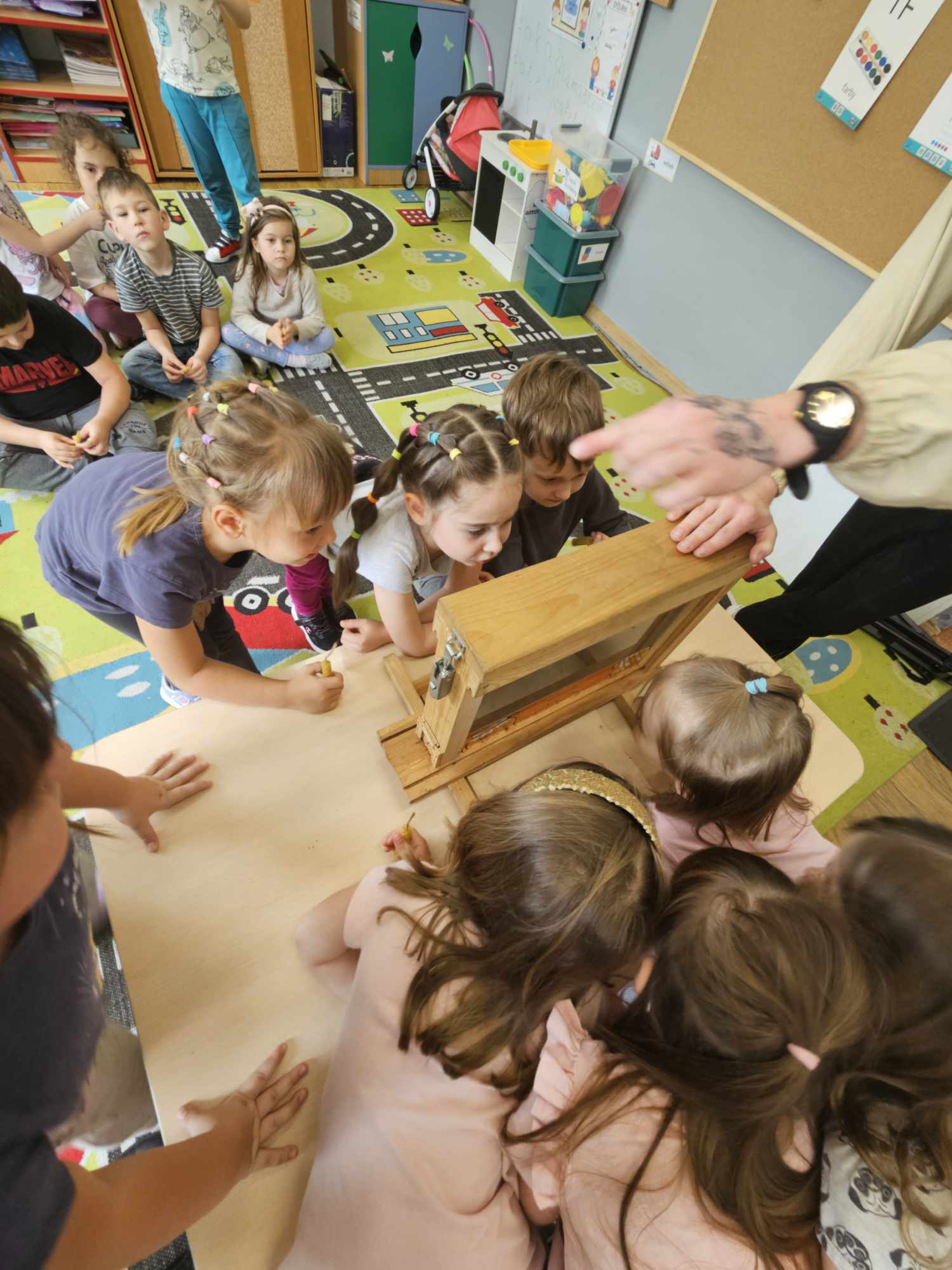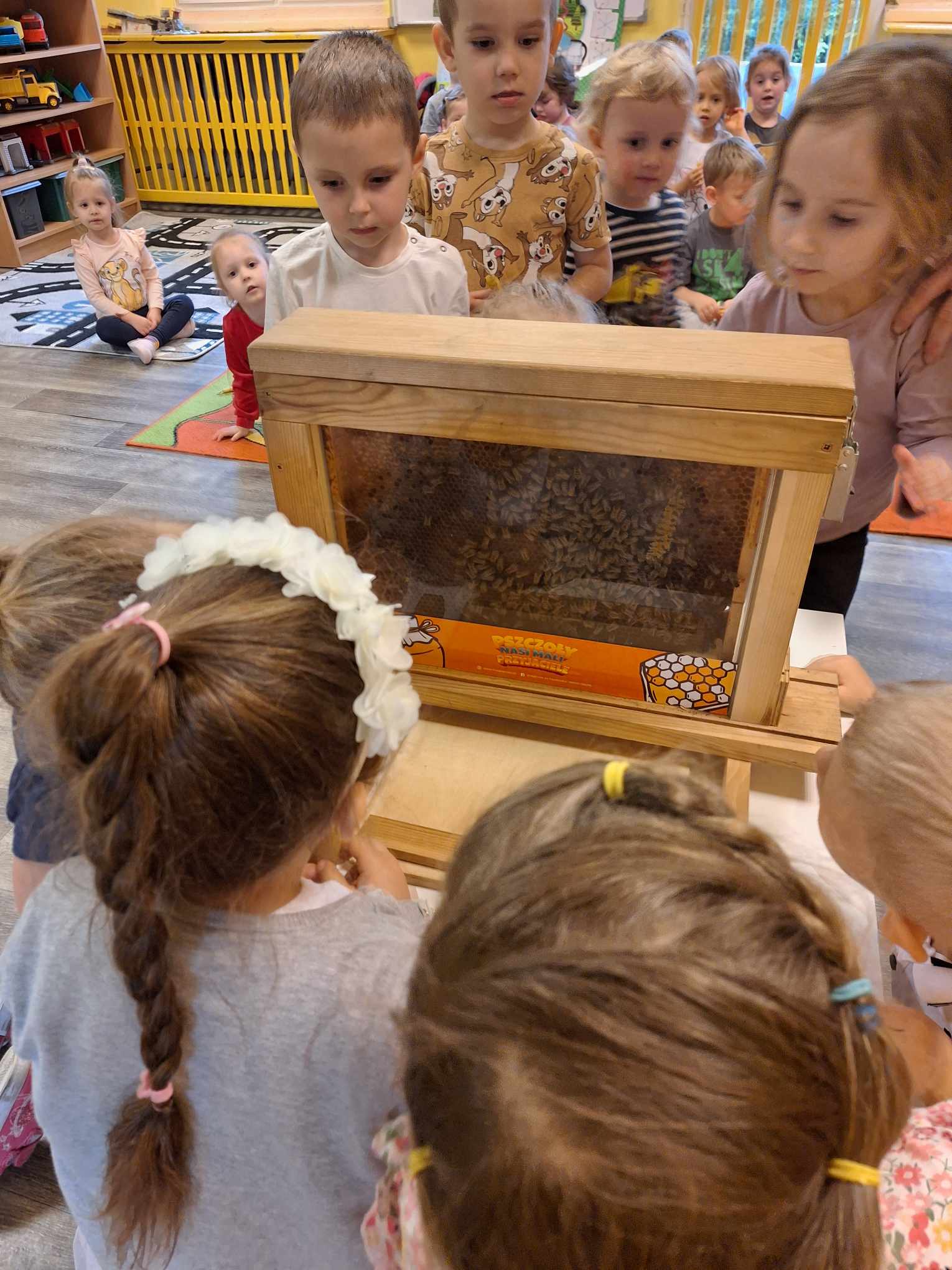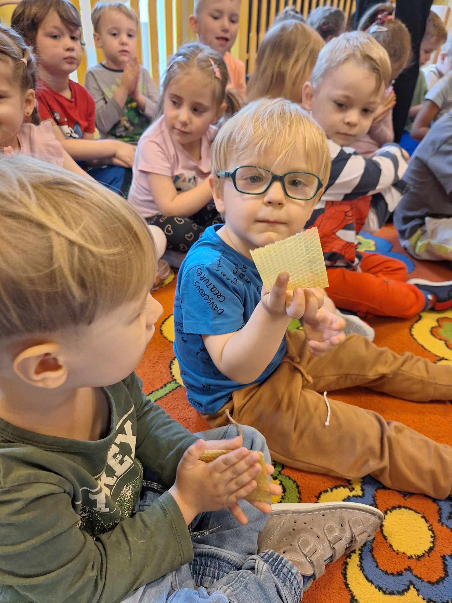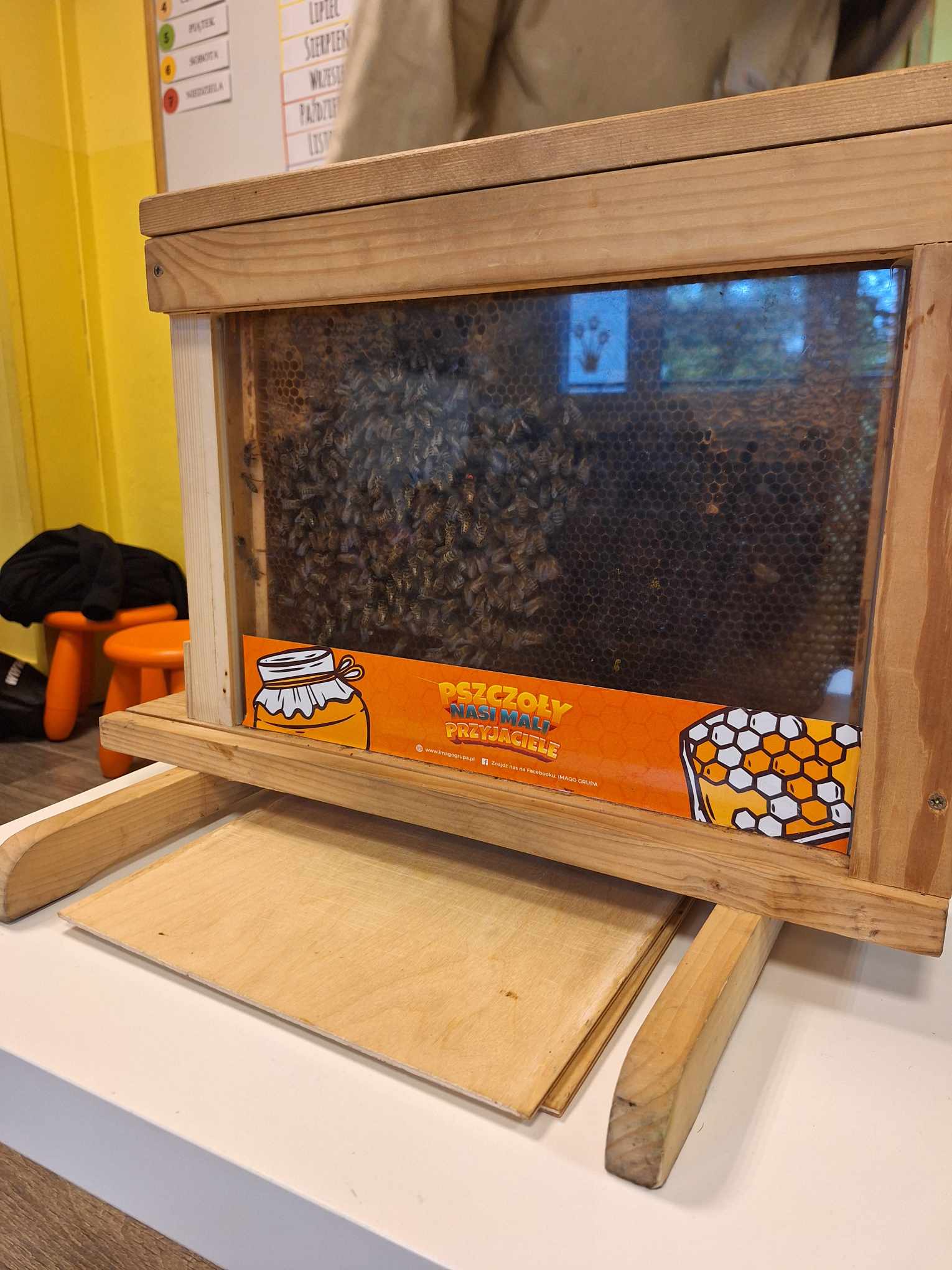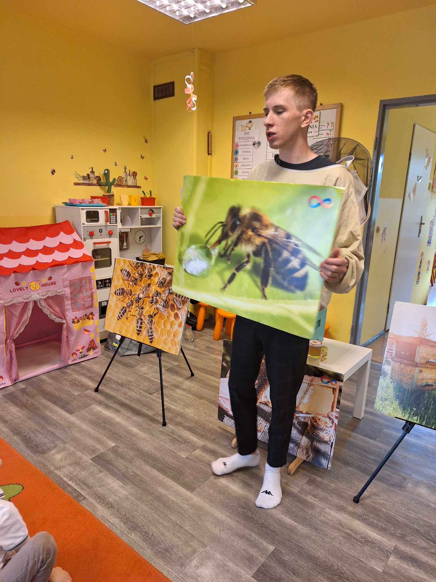 W dniu dzisiejszym gościliśmy w naszym przedszkolu IMAGO GRUPĘ, zajmującą się hodowlą pszczół. Prowadzący warsztaty Pan Michał oczarował naszych przedszkolaków! Przekazał ciekawe informacje o życiu pszczół, podkreślając ich kluczową rolę w przyrodzie. Uczniowie dowiedzieli się jak powstaje miód. Dużą atrakcją było oglądanie prawdziwego ula z pszczołami, stroju pszczelarza oraz przyrządów, których używa w swojej codziennej pracy. Pan Michał wyjaśnił, jak wygląda życie w ulu. Opowiedział o sposobach porozumiewania się pszczół i zdradził nam inne tajemnice z życia tych pracowitych owadów. Wyjaśnił, jak przebiega proces, który kończy się napełnianiem słoików miodem. Uczestnicy warsztatów mieli możliwość uformowania własnej świecy z wosku pszczelego. Na pamiątkę otrzymali dyplomy, odznaki pszczelarza i słoiczek miodu. To była wspaniała, ciekawa, żywa lekcja przyrody.
