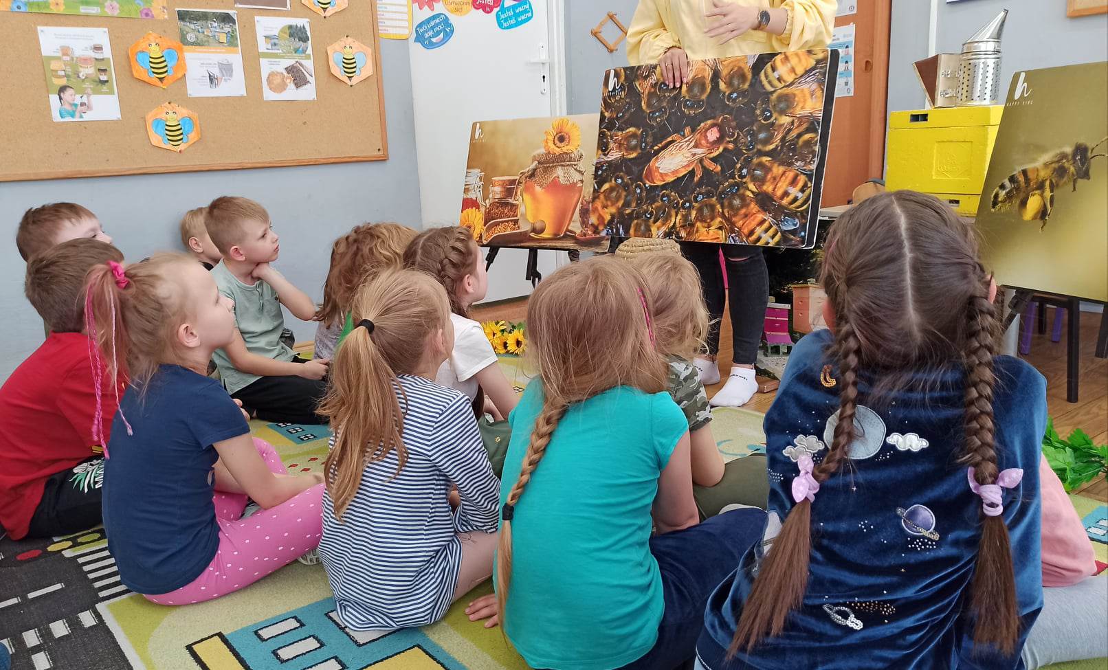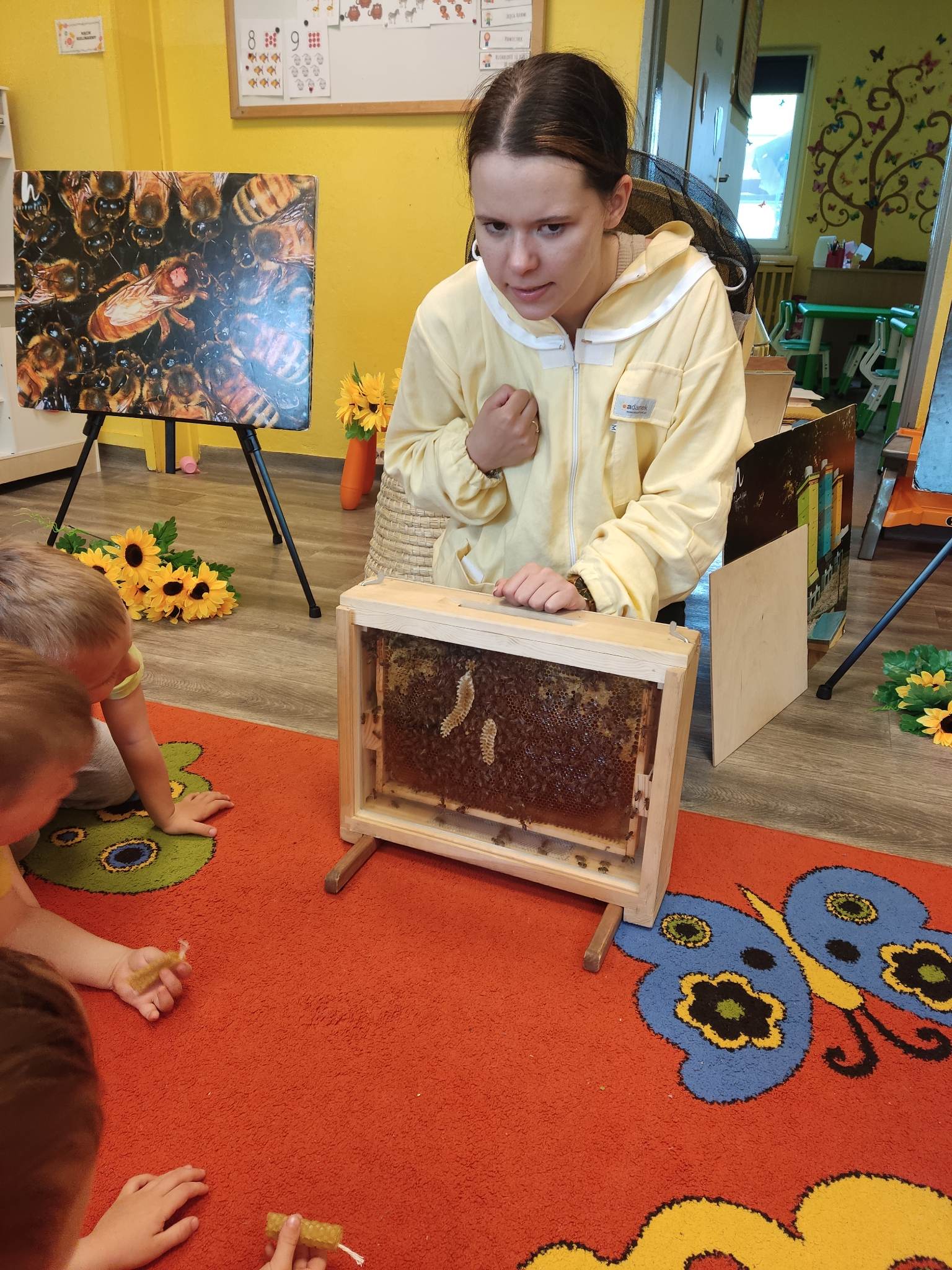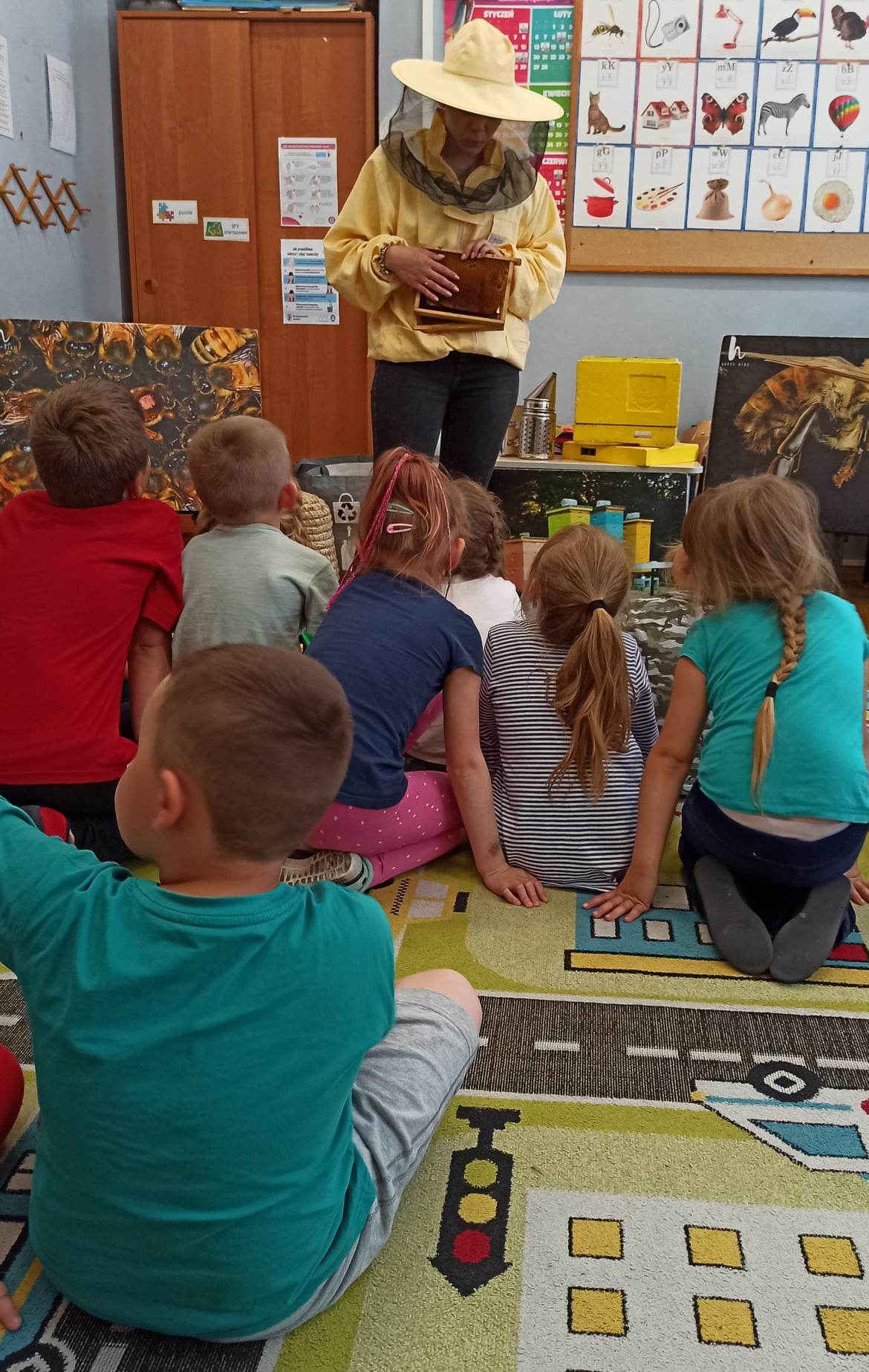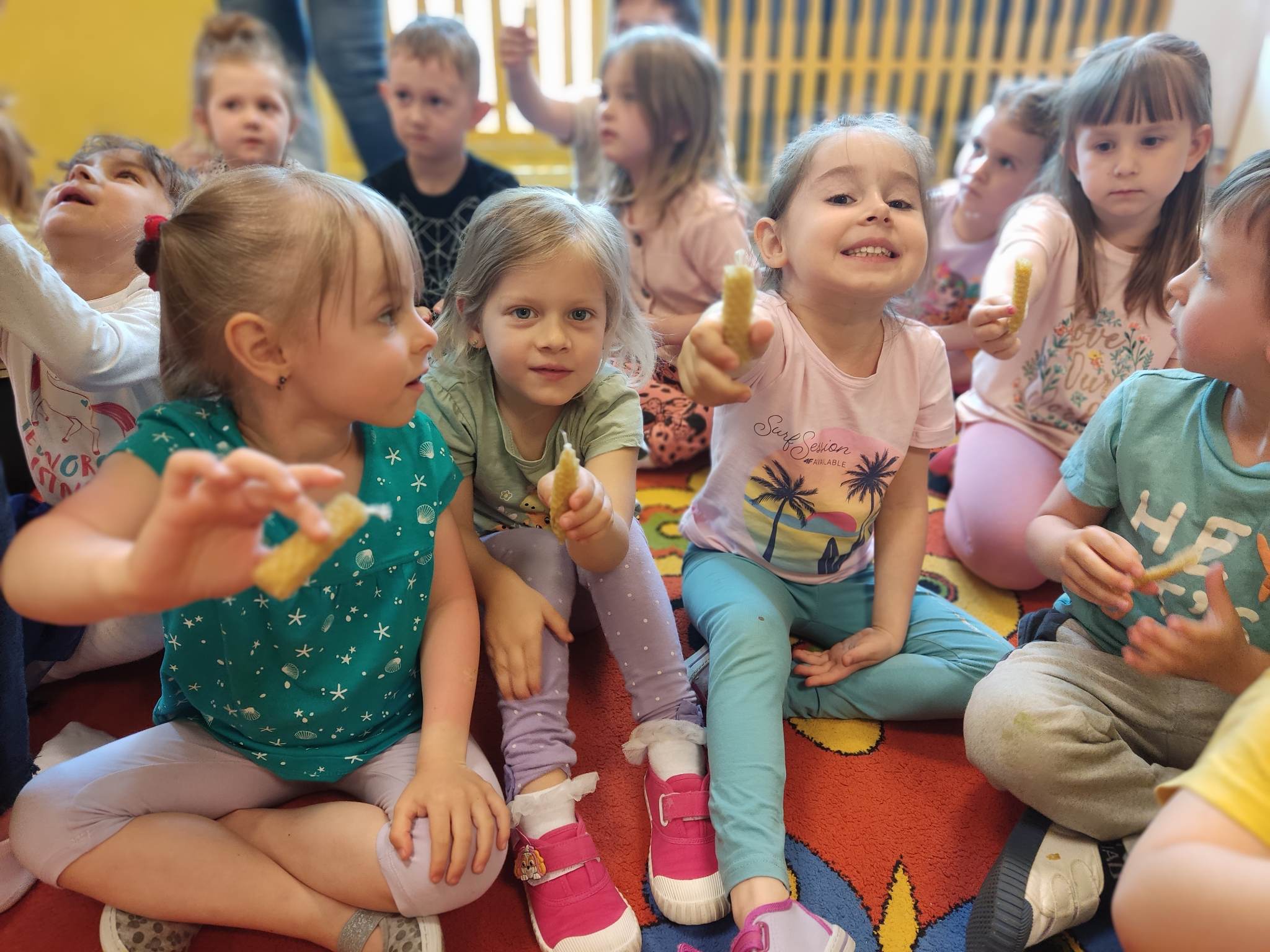 W dniu 29 maja w naszym przedszkolu odbyły się warsztaty pszczelarskie „Skąd się bierze miód?”. Dzieci miały możliwość poznać zwyczaje pszczół oraz dowiedzieć się jaką ogromną rolę pełnią w środowisku naturalnym. Przedszkolaki miały okazję obejrzeć strój pszczelarza i przyrządy, których używa on w swojej codziennej pracy. Niewątpliwą atrakcją była możliwość zobaczenia pszczół w szklanym ulu i wypatrywanie ich królowej. Na warsztatach dzieci samodzielnie wykonały świece z wosku pszczelego. Każdy uczestnik otrzymał dyplom oraz słoiczek pysznego miodu.