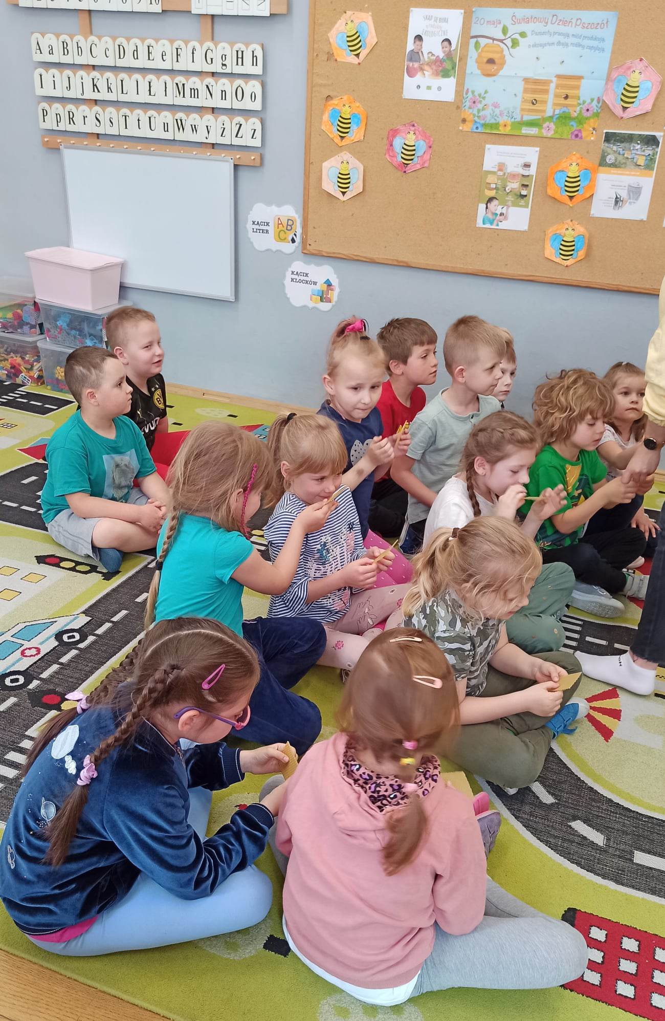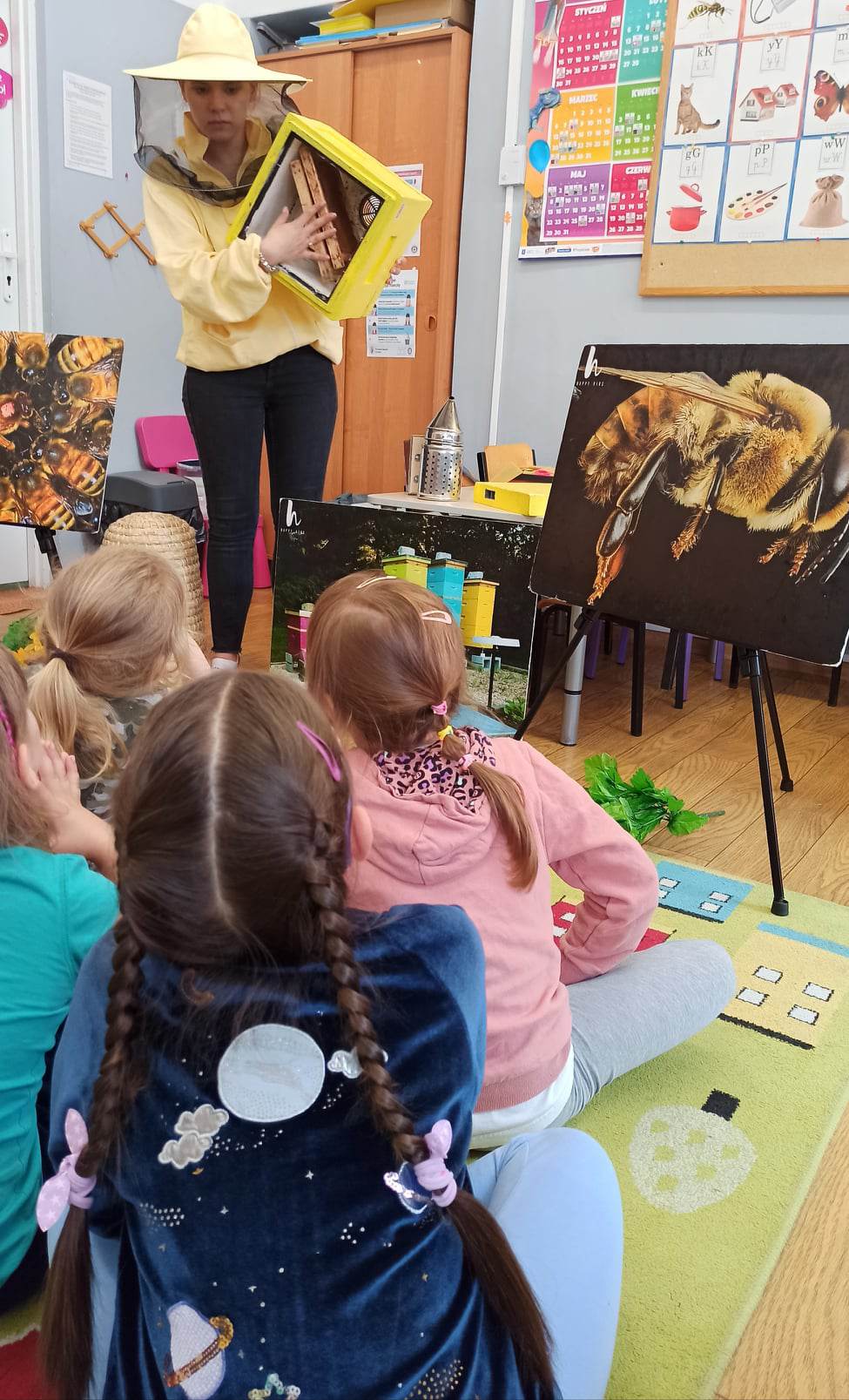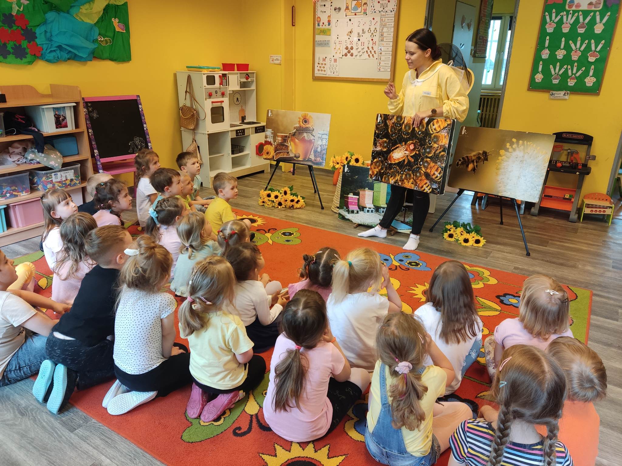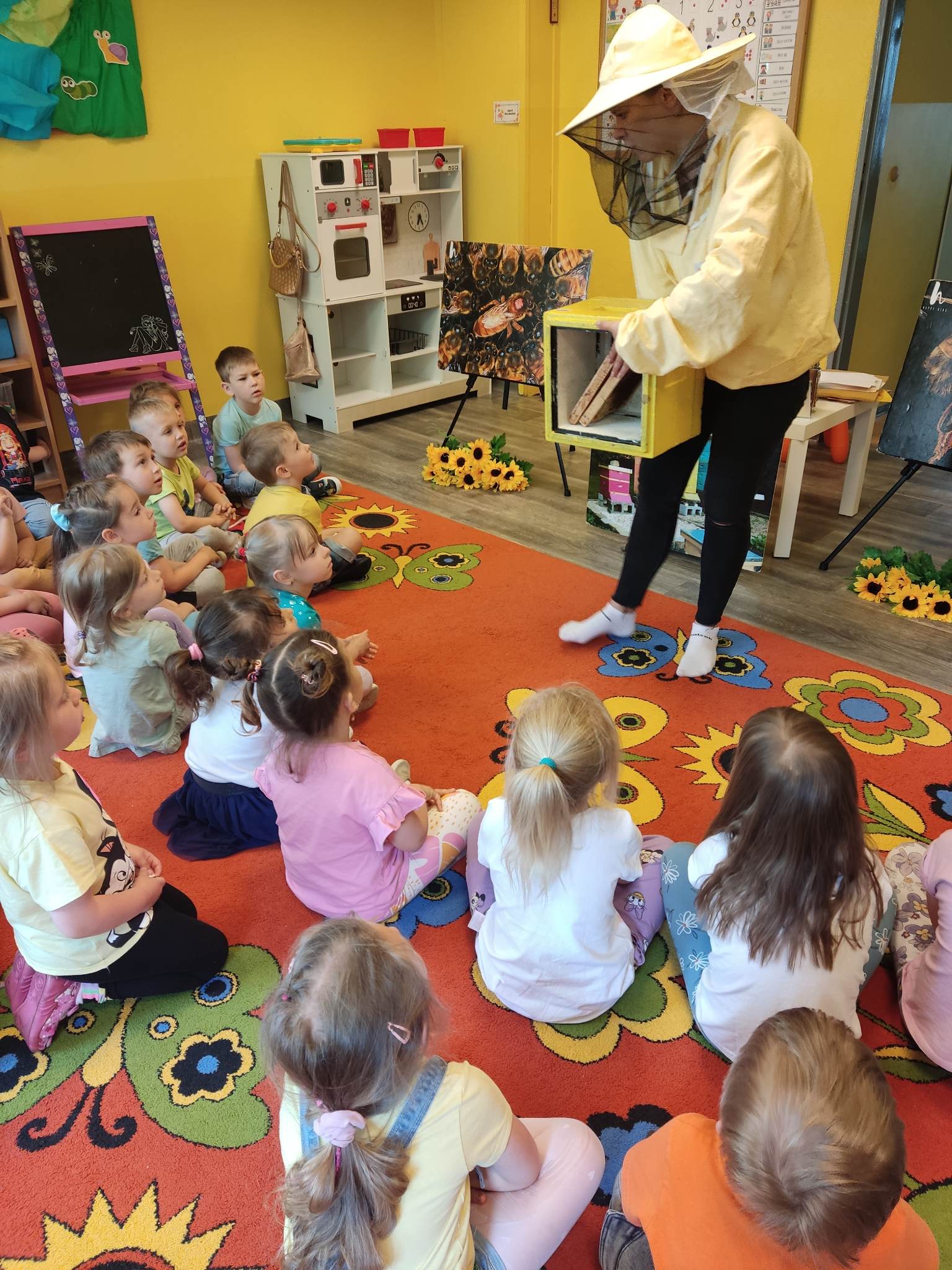 W dniu 29 maja w naszym przedszkolu odbyły się warsztaty pszczelarskie „Skąd się bierze miód?”. Dzieci miały możliwość poznać zwyczaje pszczół oraz dowiedzieć się jaką ogromną rolę pełnią w środowisku naturalnym. Przedszkolaki miały okazję obejrzeć strój pszczelarza i przyrządy, których używa on w swojej codziennej pracy. Niewątpliwą atrakcją była możliwość zobaczenia pszczół w szklanym ulu i wypatrywanie ich królowej. Na warsztatach dzieci samodzielnie wykonały świece z wosku pszczelego. Każdy uczestnik otrzymał dyplom oraz słoiczek pysznego miodu.