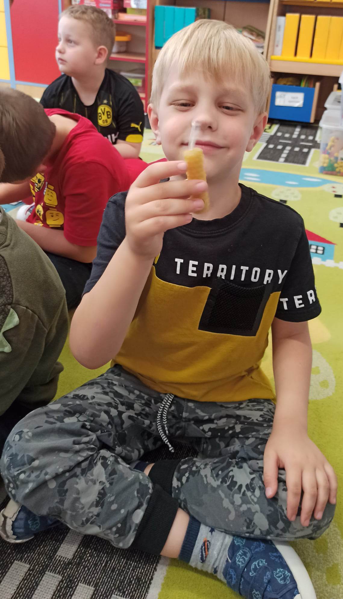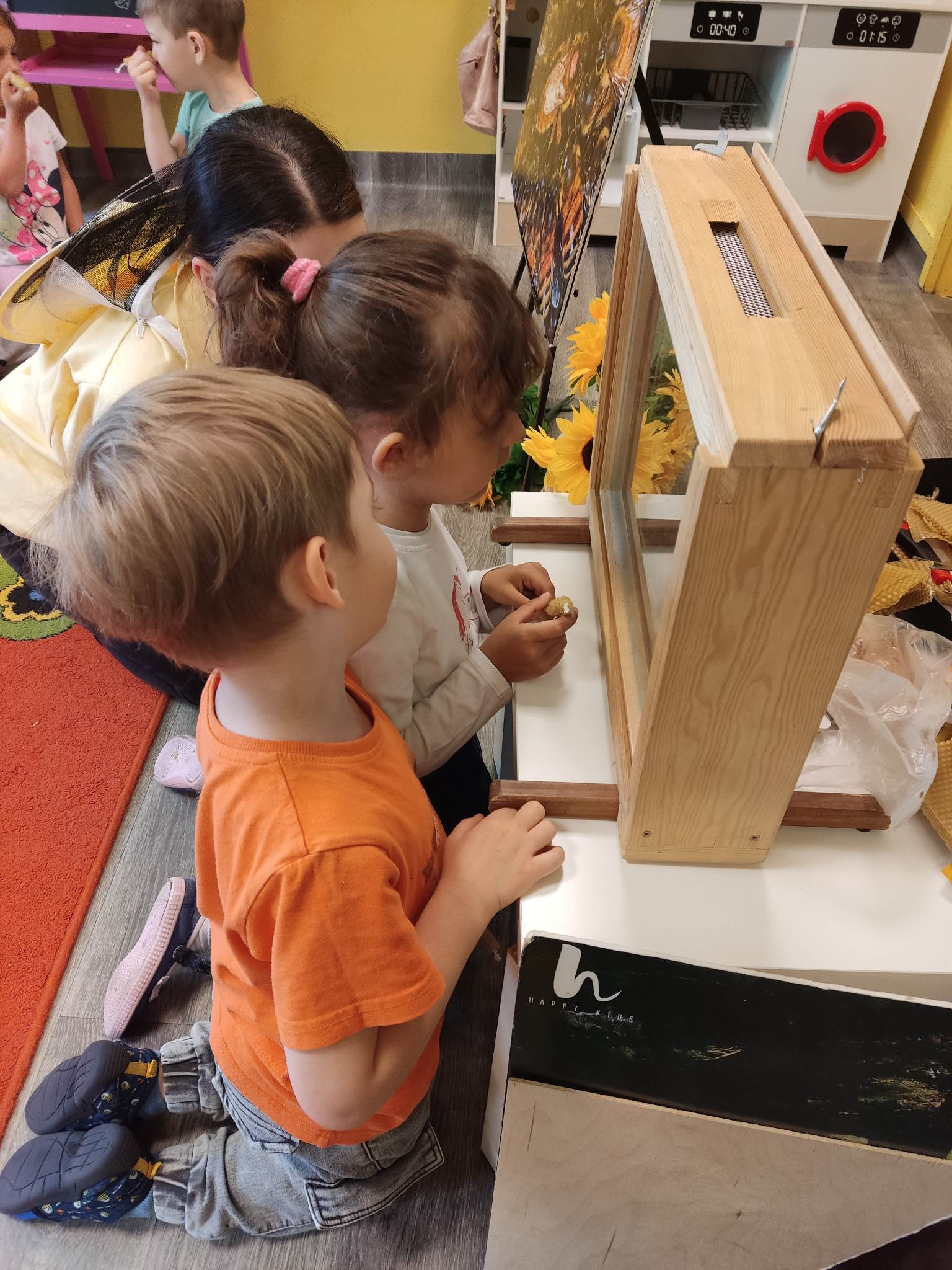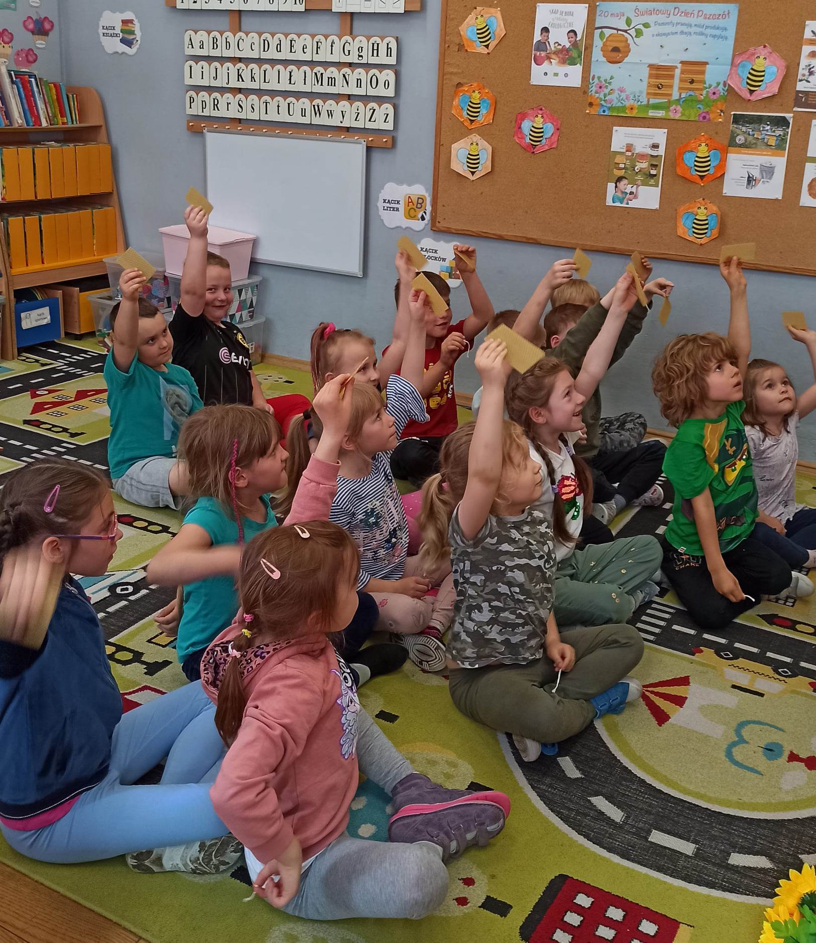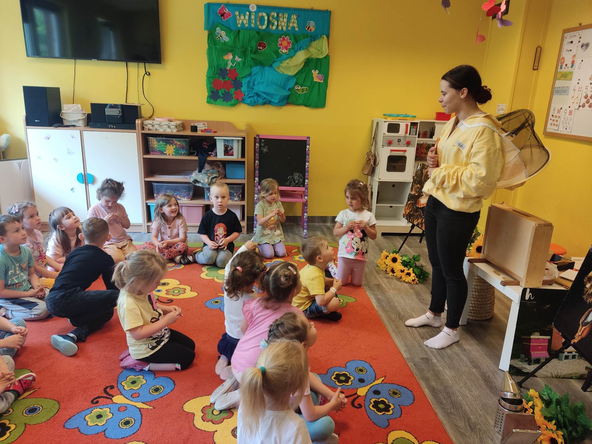W dniu 29 maja w naszym przedszkolu odbyły się warsztaty pszczelarskie „Skąd się bierze miód?”. Dzieci miały możliwość poznać zwyczaje pszczół oraz dowiedzieć się jaką ogromną rolę pełnią w środowisku naturalnym. Przedszkolaki miały okazję obejrzeć strój pszczelarza i przyrządy, których używa on w swojej codziennej pracy. Niewątpliwą atrakcją była możliwość zobaczenia pszczół w szklanym ulu i wypatrywanie ich królowej. Na warsztatach dzieci samodzielnie wykonały świece z wosku pszczelego. Każdy uczestnik otrzymał dyplom oraz słoiczek pysznego miodu.