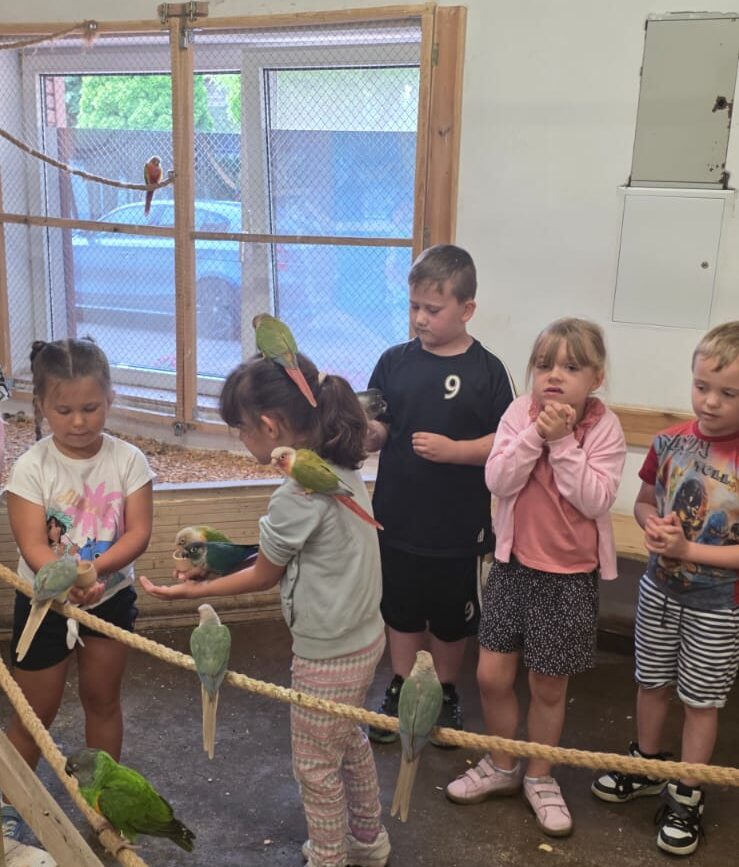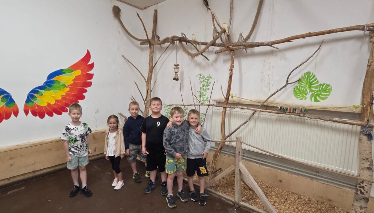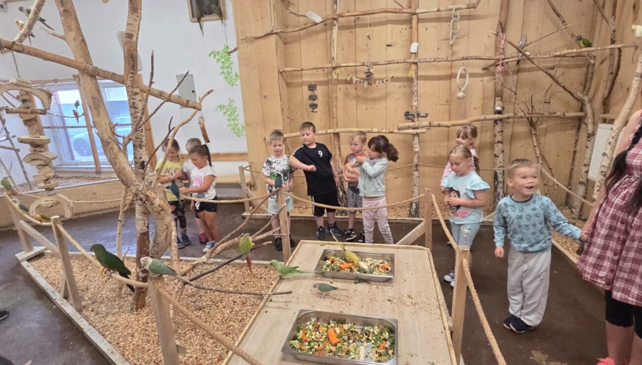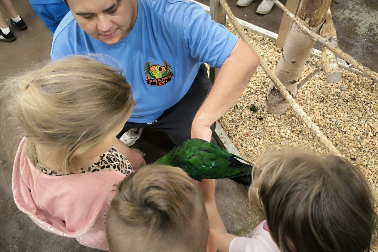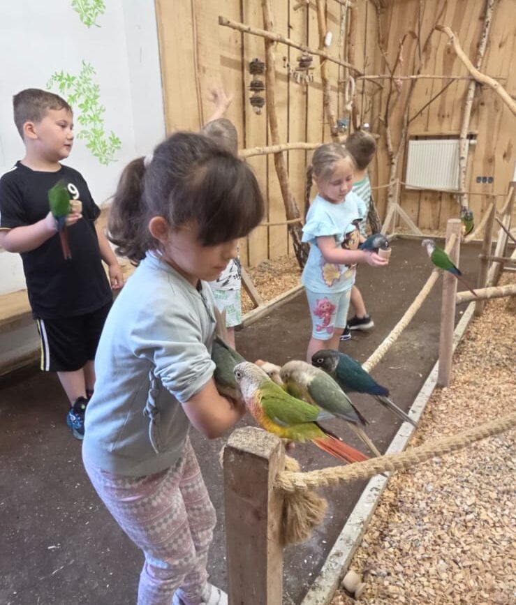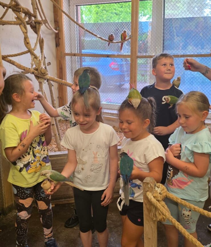 Dnia 06.06.25 wyruszyliśmy z naszego przedszkola do kolorowego świata papug – papugarni „JuRajskie Ptaki” w Żarkach.