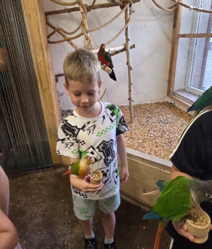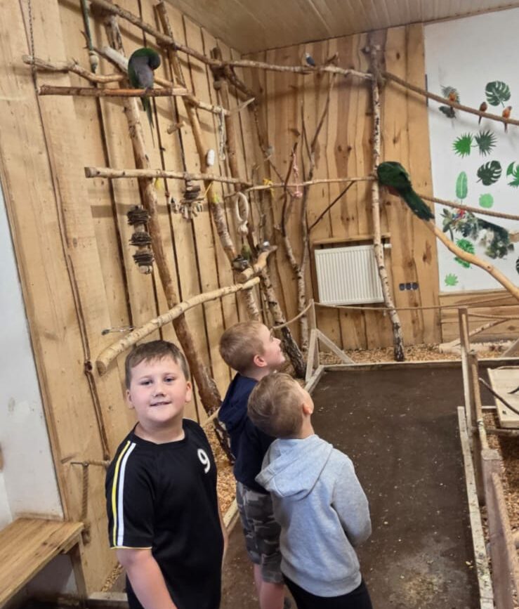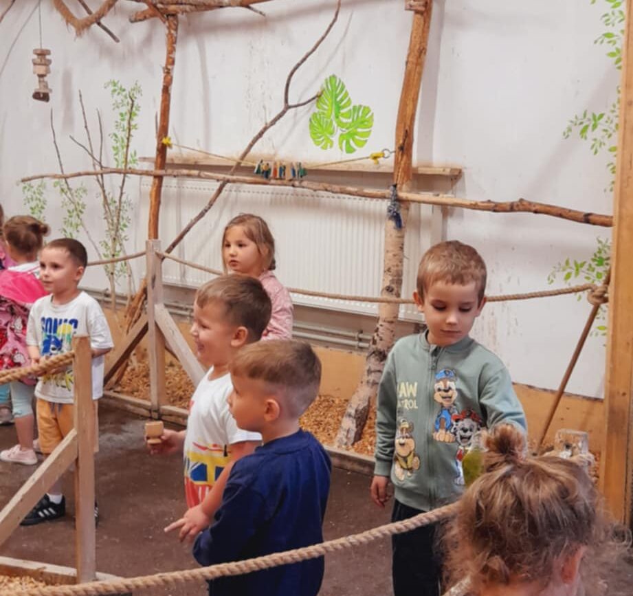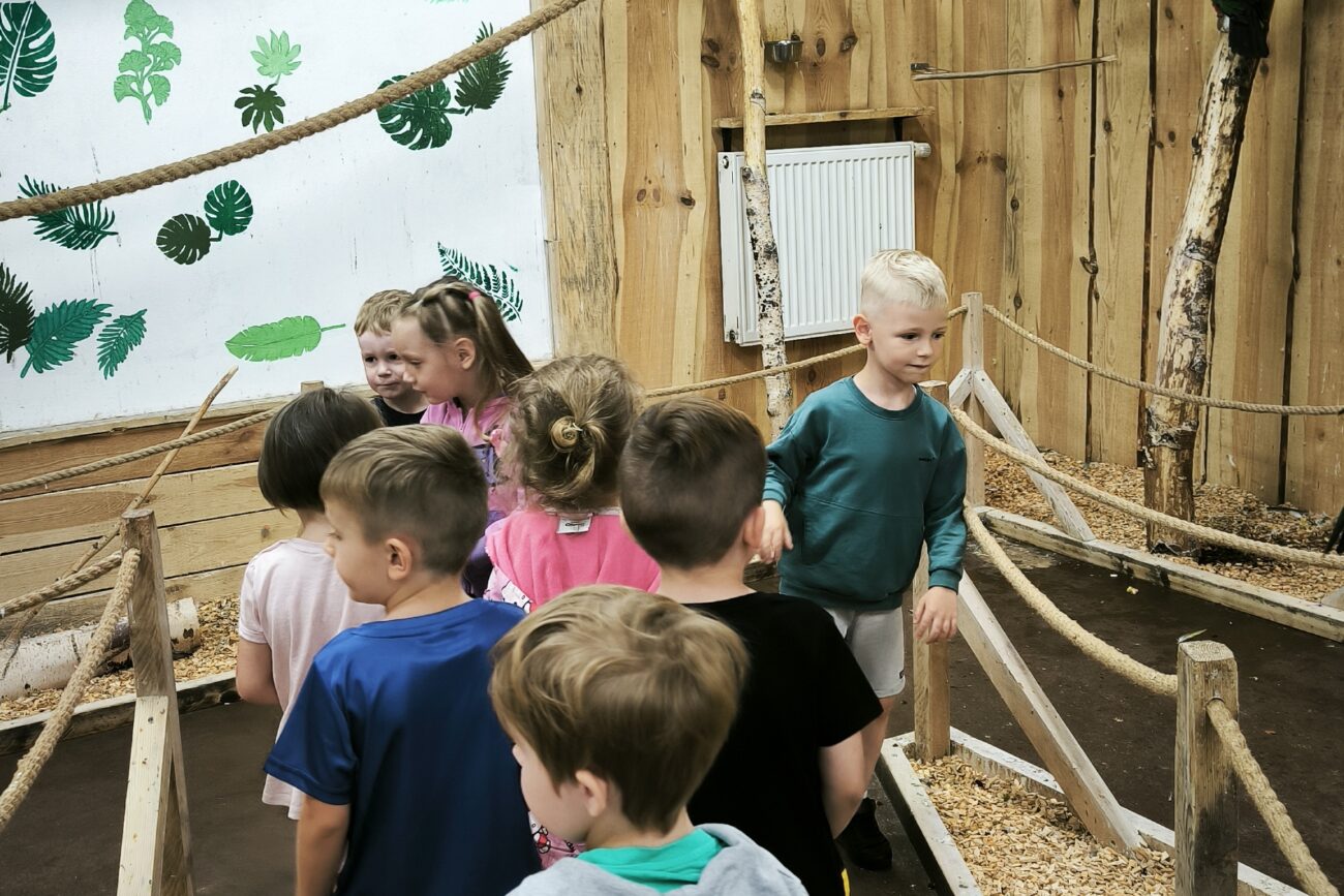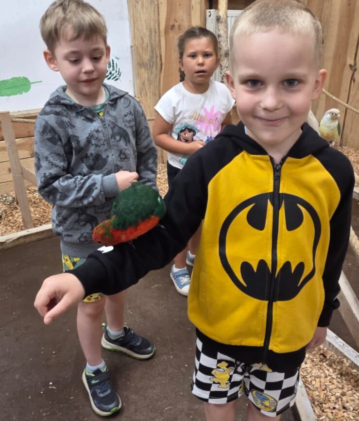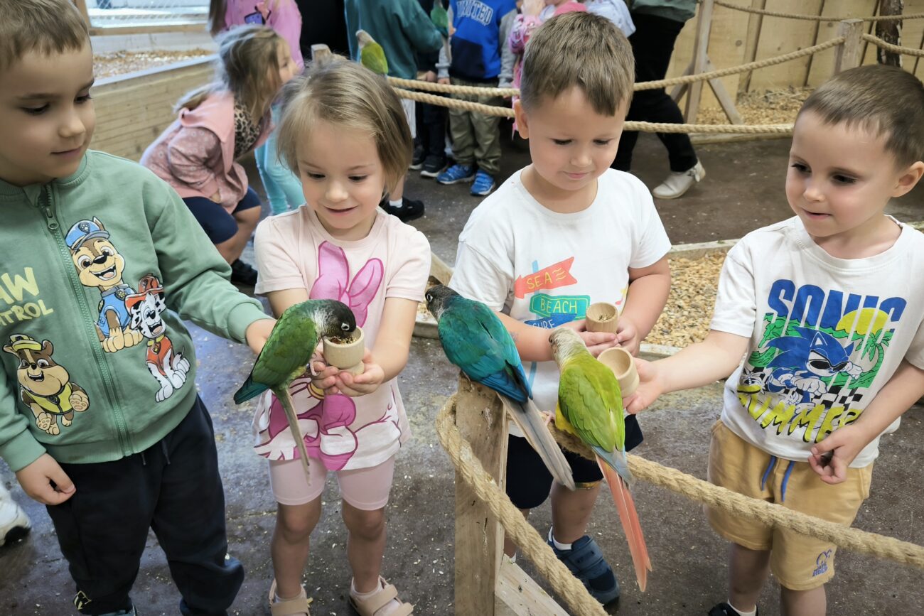 Dnia 06.06.25 wyruszyliśmy z naszego przedszkola do kolorowego świata papug – papugarni „JuRajskie Ptaki” w Żarkach.
