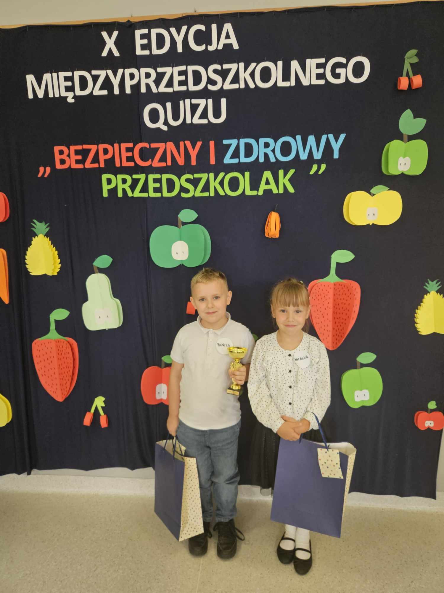 11 kwietnia 2024r. na terenie Miejskiego Przedszkola nr 35 w Sosnowcu został przeprowadzony X Międzyprzedszkolny Quiz pod hasłem „Zdrowy i Bezpieczny Przedszkolak”. Nasze przedszkole reprezentowali: Natalia orazb Borys z grupy „Biedronki”. W trakcie trwania konkursu dzieci, miały okazję zaprezentować zdobytą wiedzę o zdrowym i bezpiecznym stylu życia, którą nabyły w trakcie realizacji Projektu „Klub Zdrowego Przedszkolaka”. Nie zabrakło pytań z tematyki ruchu drogowego, bezpiecznych zabaw, podróży i kontaktów z obcymi.
